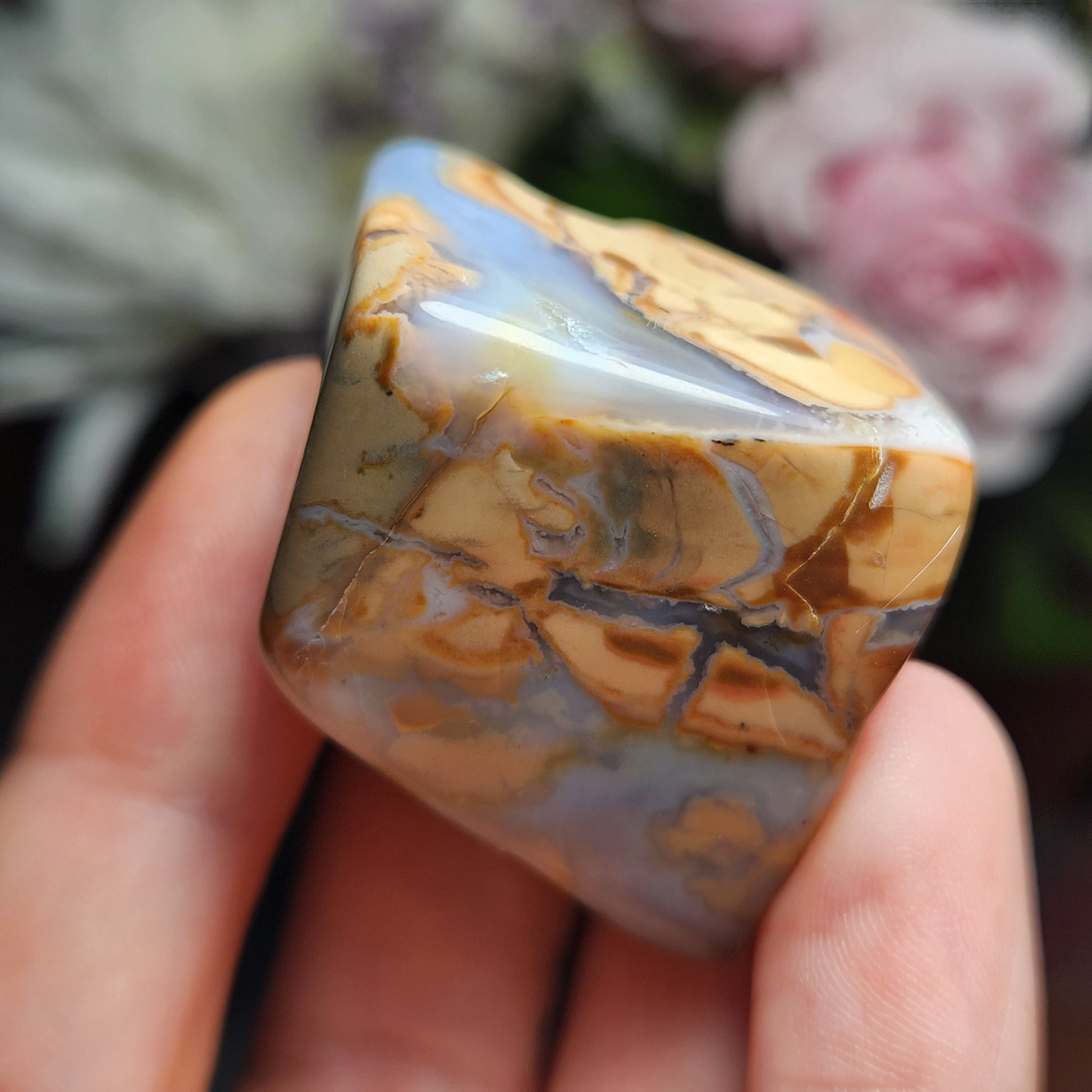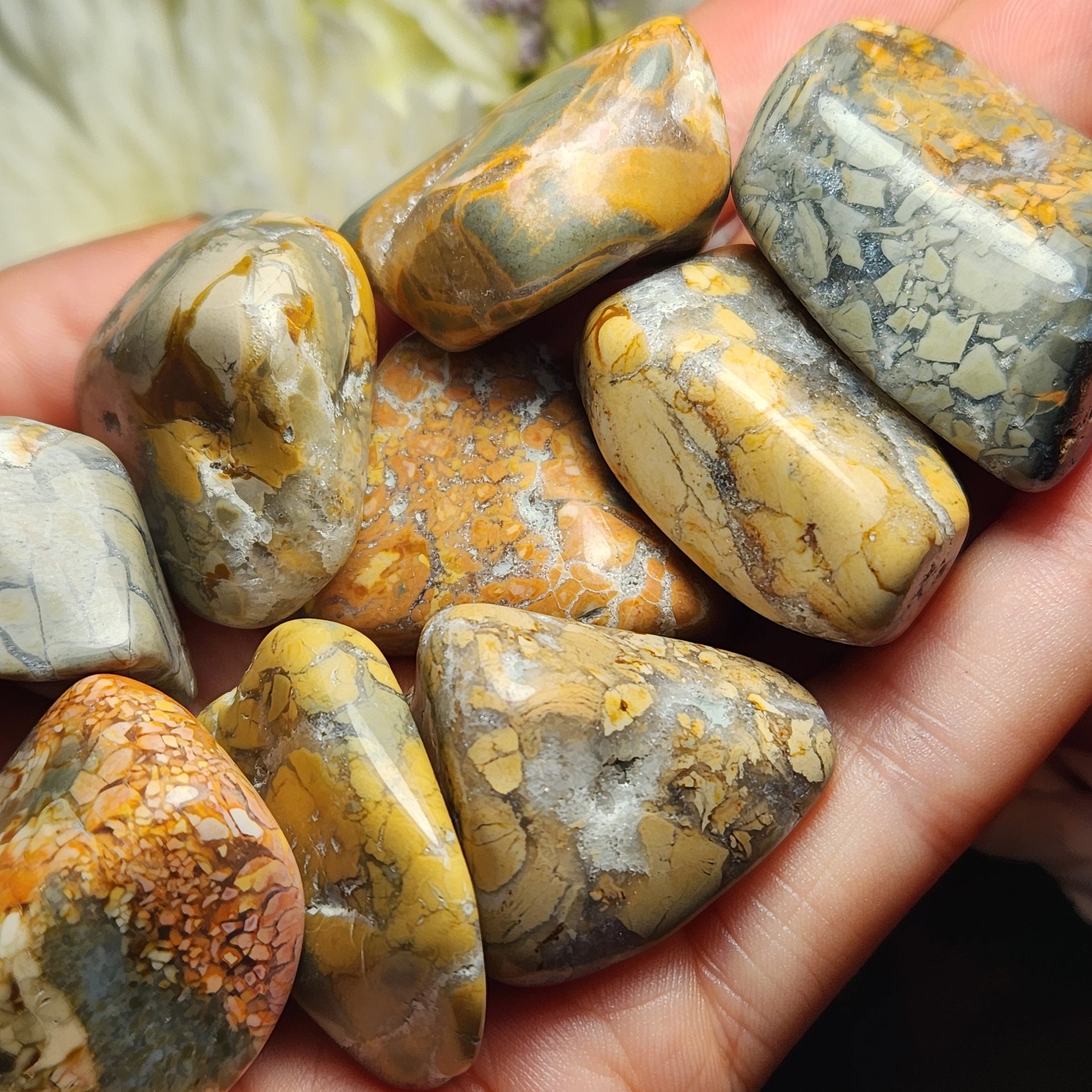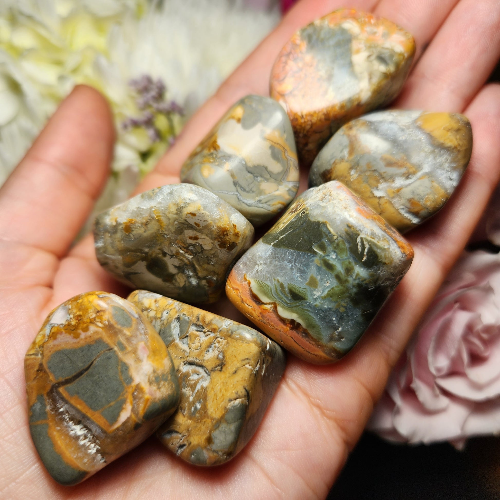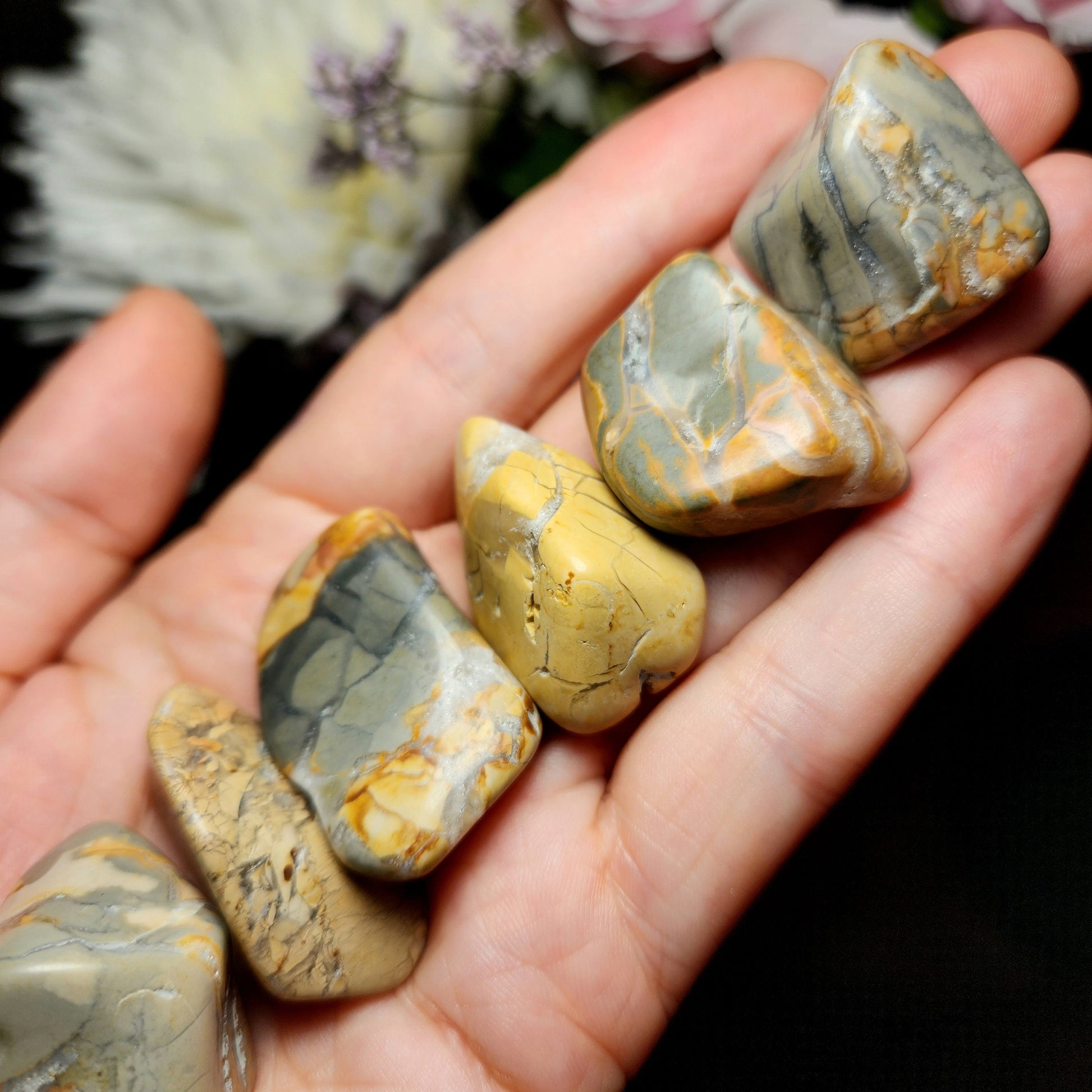Ibis Jasper, named after the Ibis bird, is a type of brecciated Jasper found in Madagascar. These polished Ibis Jasper stones display captivating swirls of shades of tan, peach, and coral. Each crystal has its own, unique mesmerizing pattern! Each specimen measures approximately between 1 inch and 2 inches.