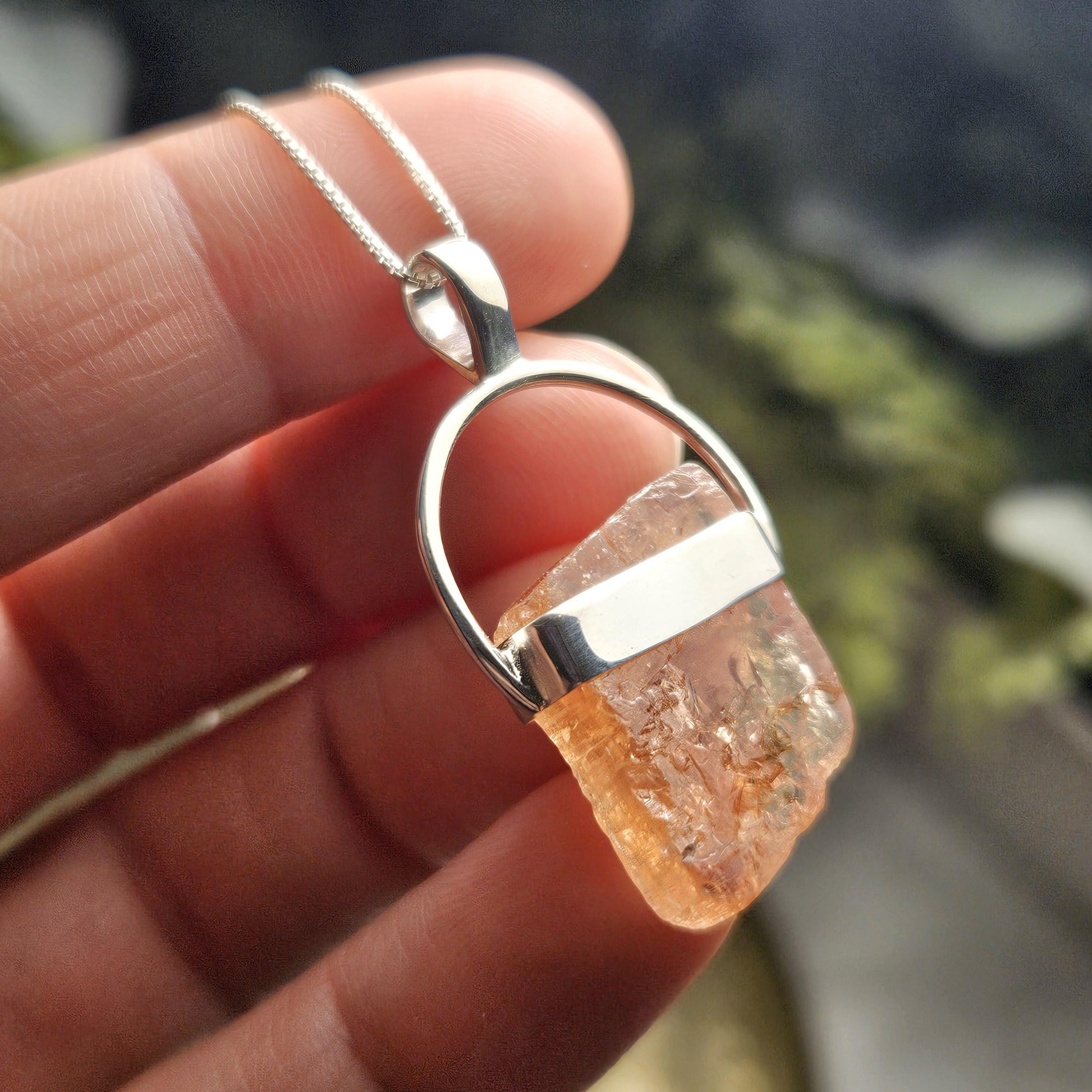 This peachy-orange Brazilian Topaz stone has a gemmy translucence with shining striations on its side. This crystal has been custom created into a sturdy piece of jewelry using .925 Sterling Silver. This pendant measures approximately 34mm by 19mm. The silver chain used in the photos is to help envision how this pendant will look while adorned but is not included in the listing.