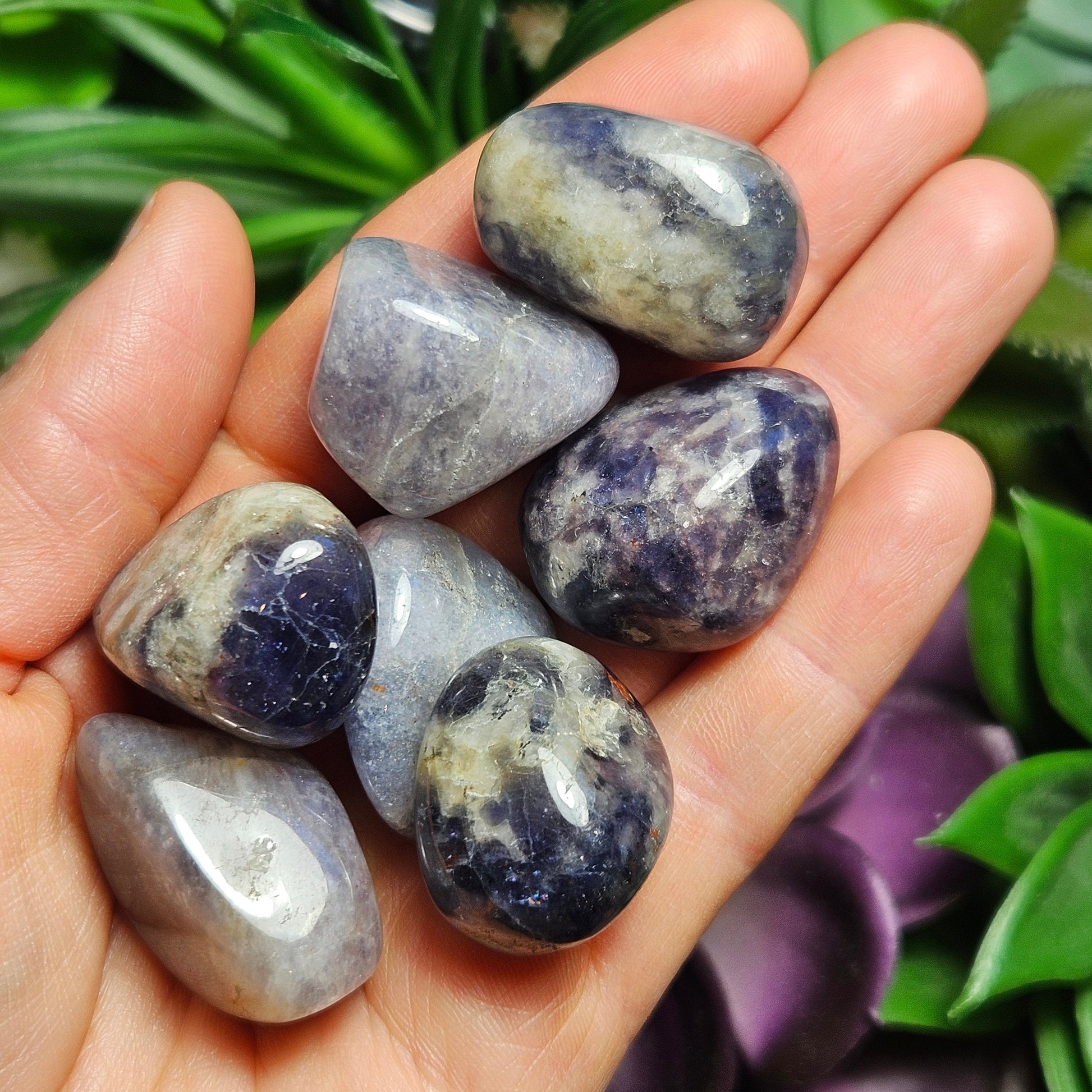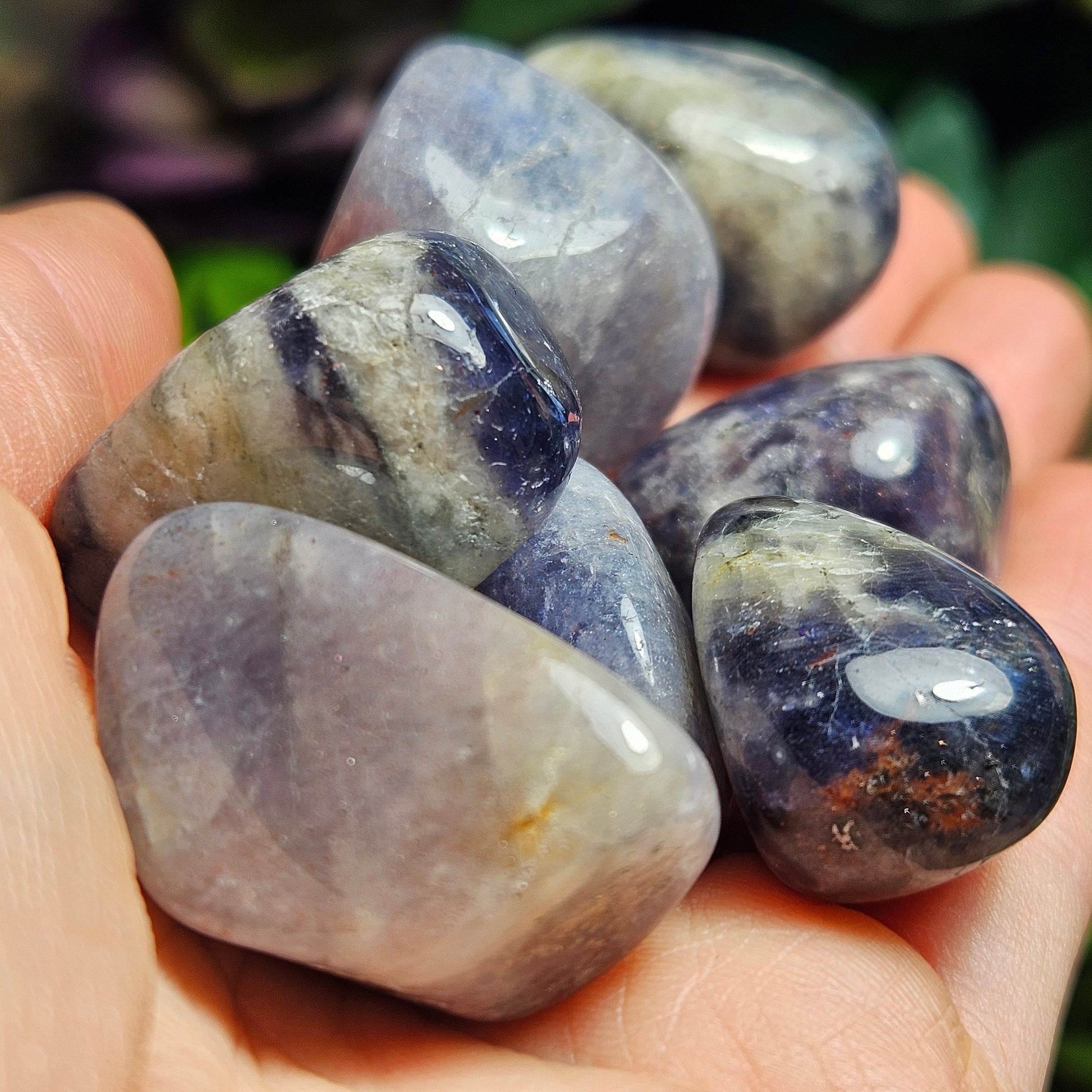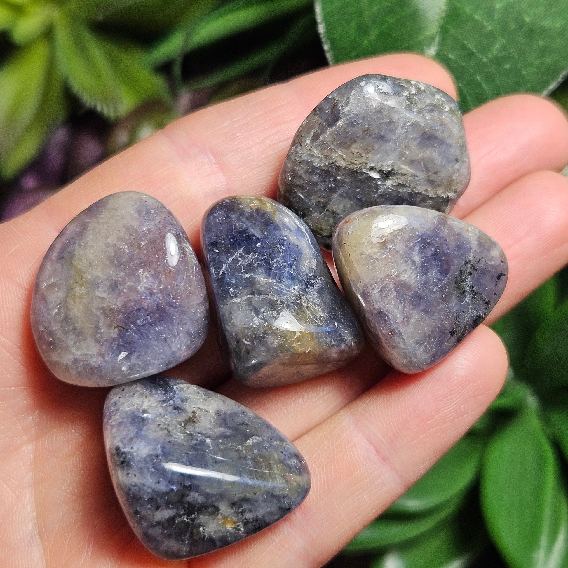 These Iolite crystals have been tumbled to have a smooth polish and a high sheen. They have rounded shapes and exhibit light to dark shades of violet swirled with greys. Each specimen measures approximately .75 to 1 inch in freeform shapes.