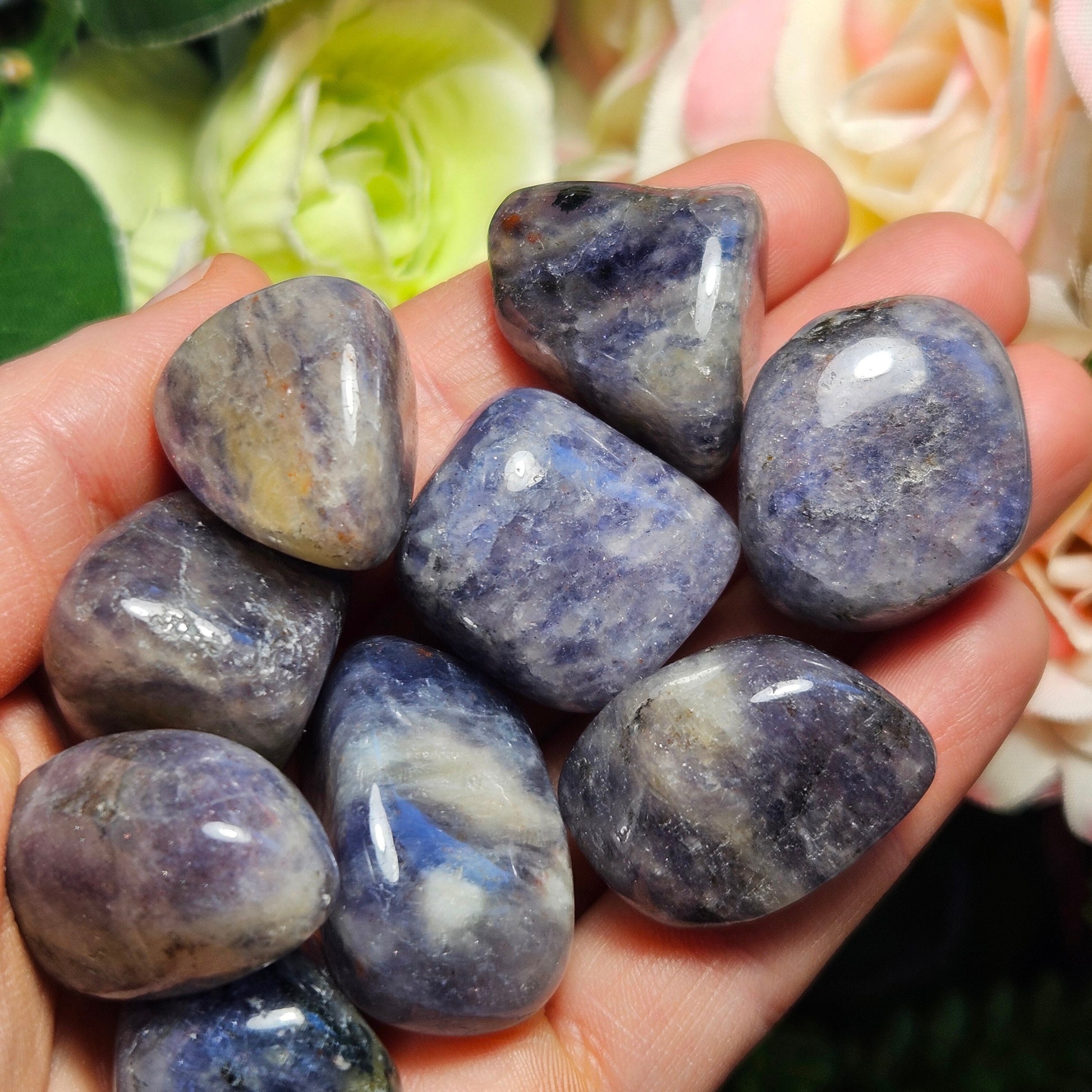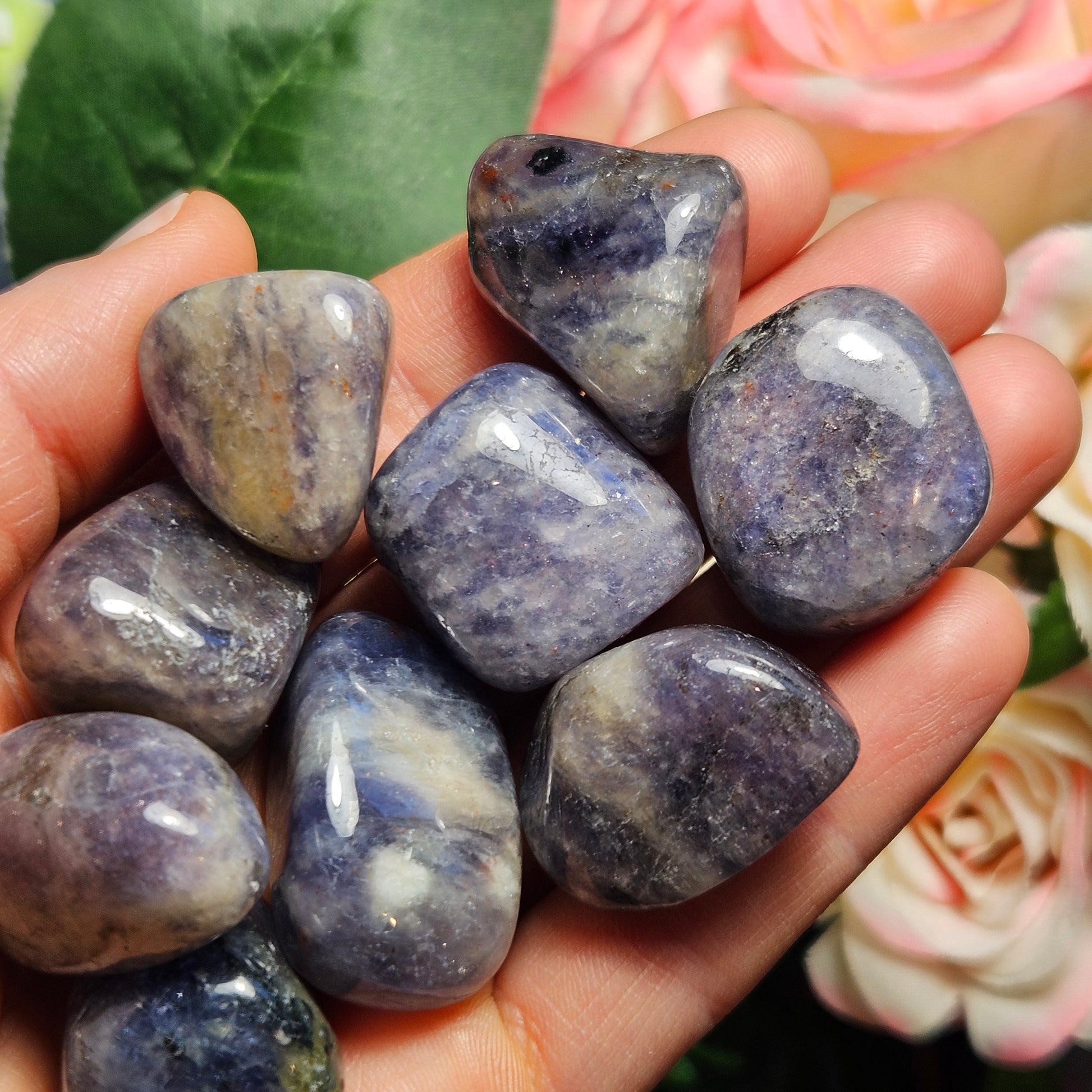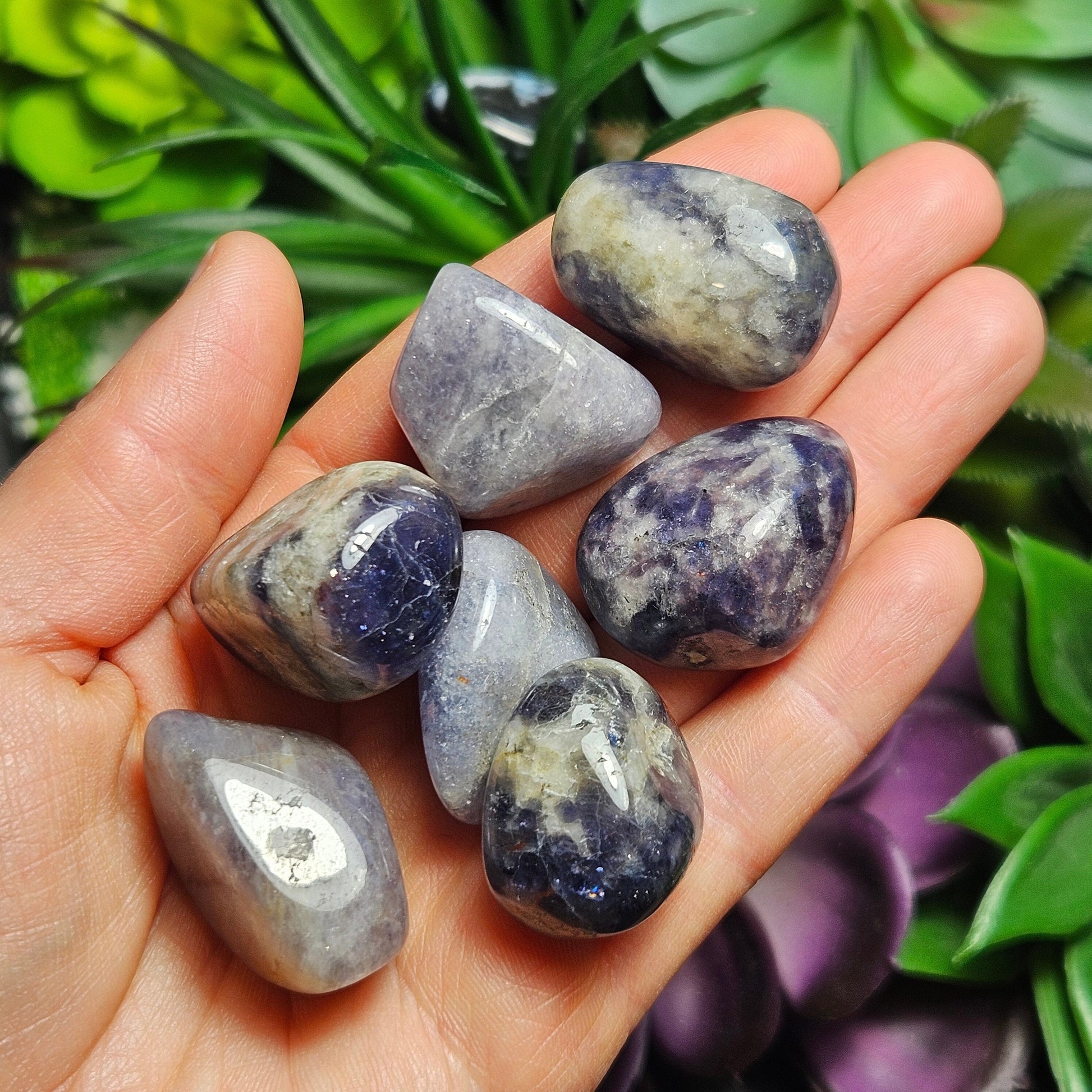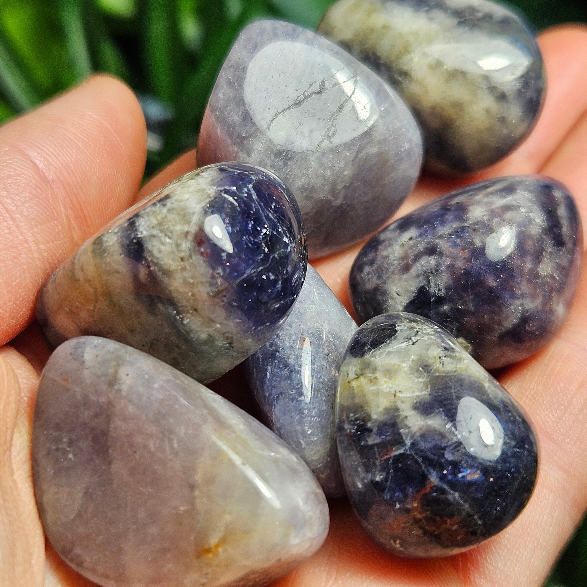 These Iolite crystals have been tumbled to have a smooth polish and a high sheen. They have rounded shapes and exhibit light to dark shades of violet swirled with greys. Each specimen measures approximately .75 to 1 inch in freeform shapes.