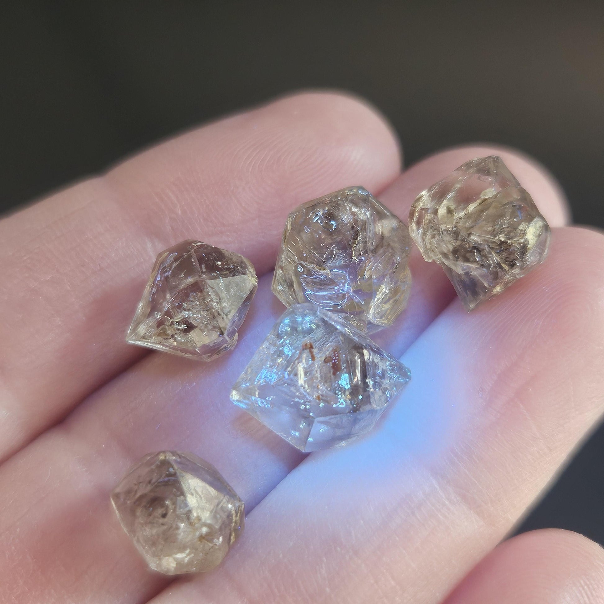 UV-reactive Elestial Quartz from Torri, Tuscany — sharp terminations, layered structure, and a natural translucence that sometimes carries a smoky undertone. Under UV light, they flash bright blue — a subtle but powerful detail. Some pieces show light edge wear from the mining process. Each one comes boxed and ready to display.