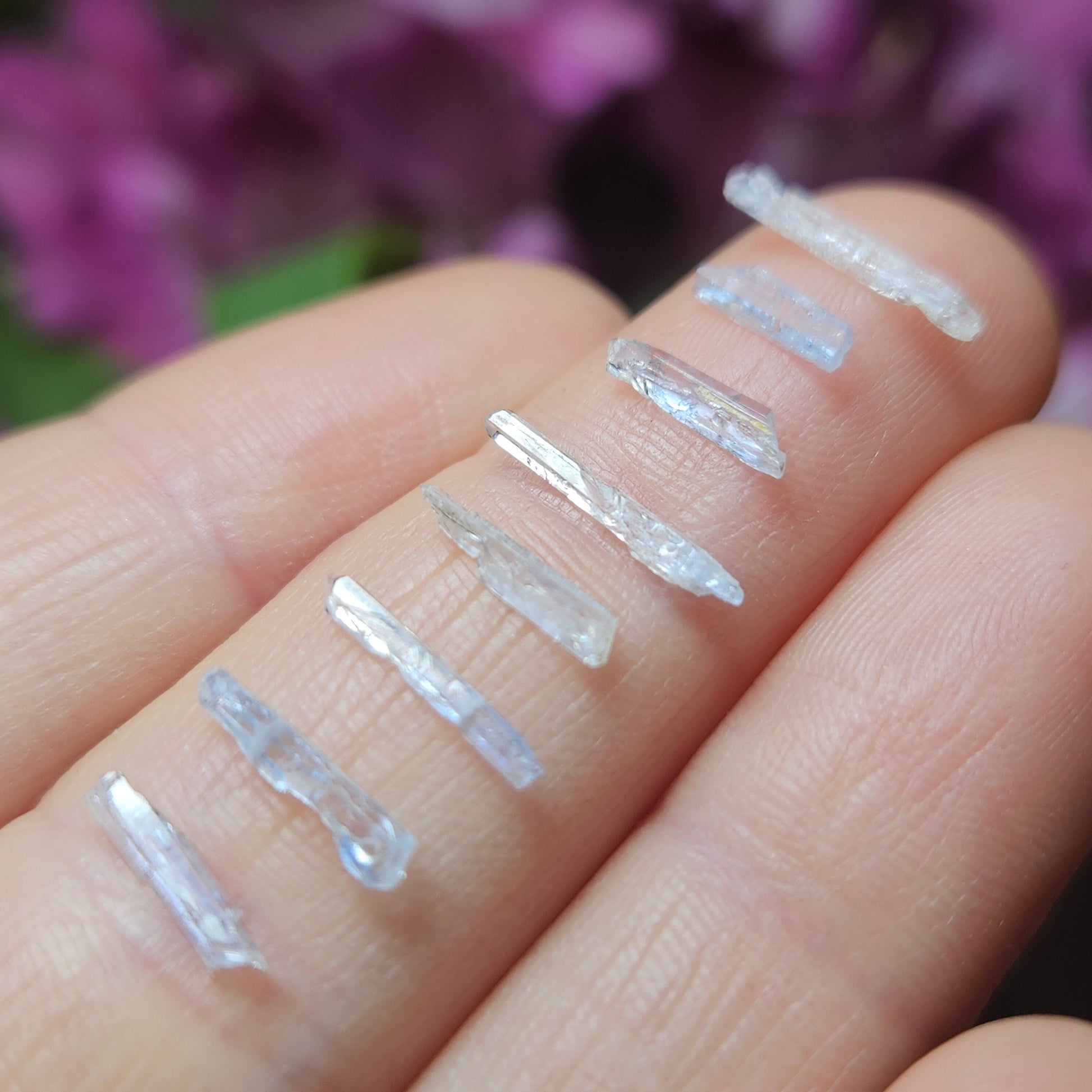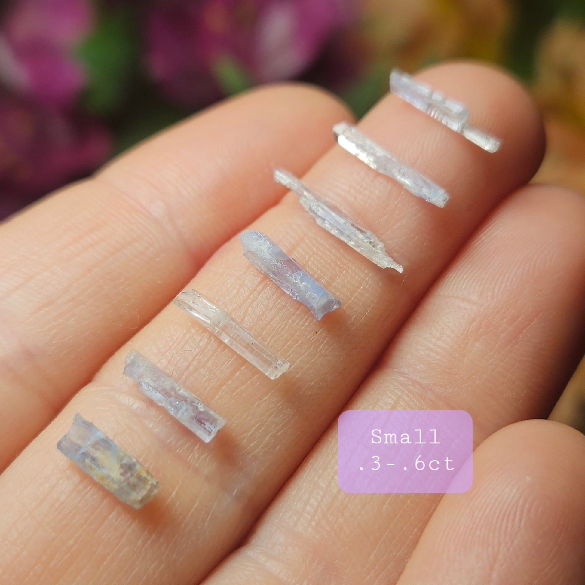 These small, Jeremejevite crystals come from the Erongo Mountains in Namibia. These EXTREMELY petite specimens are full crystals and a rare offering of a hard-to-find mineral. These rare crystals exhibit striations, a glowing translucence, and display a range of hues, from colorless to blue with an indigo hue.