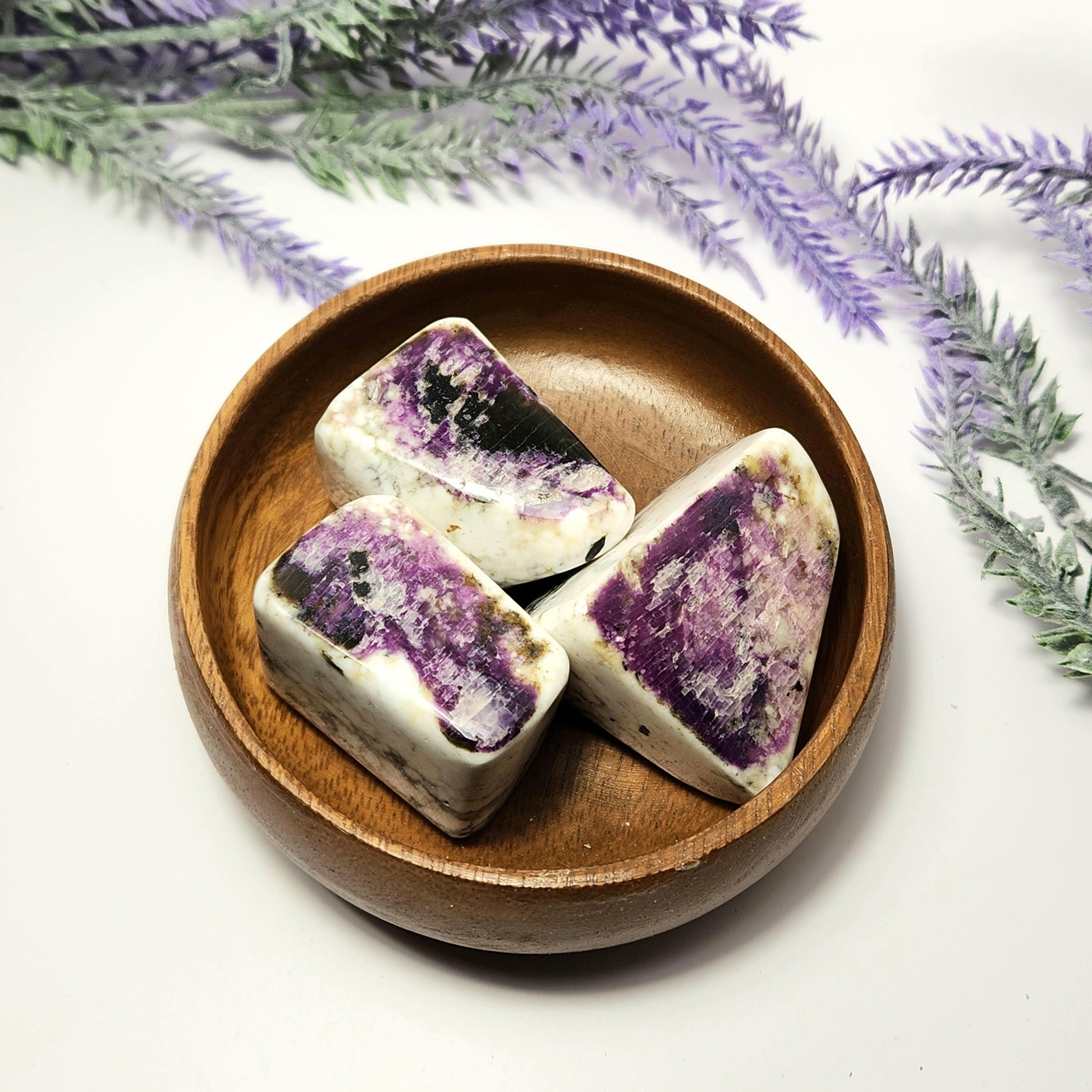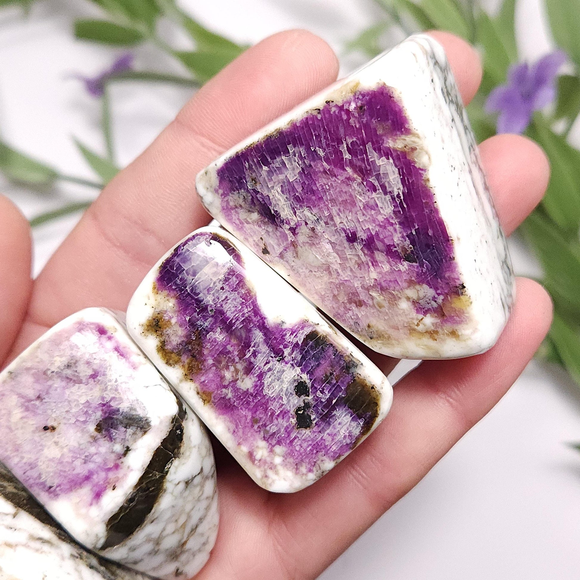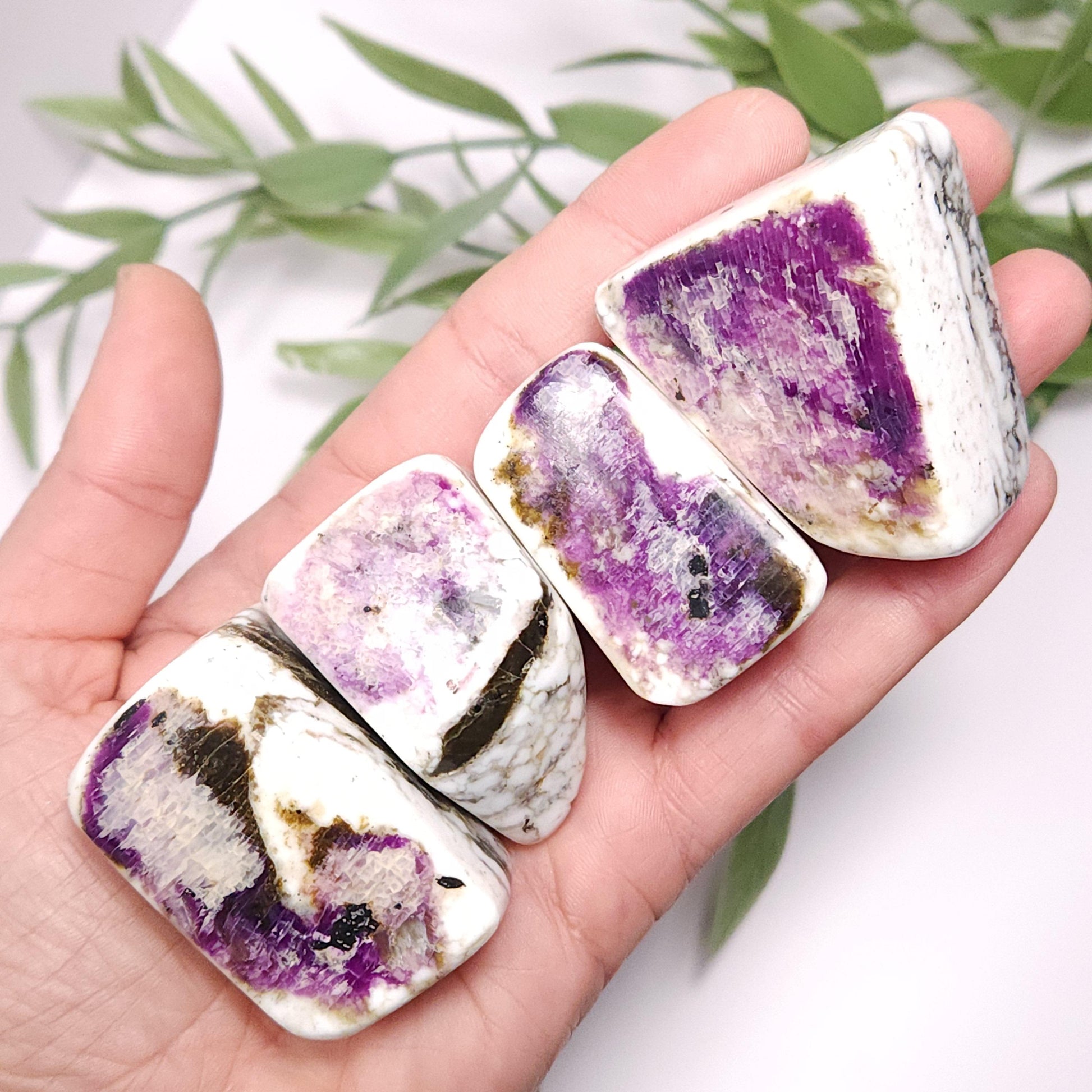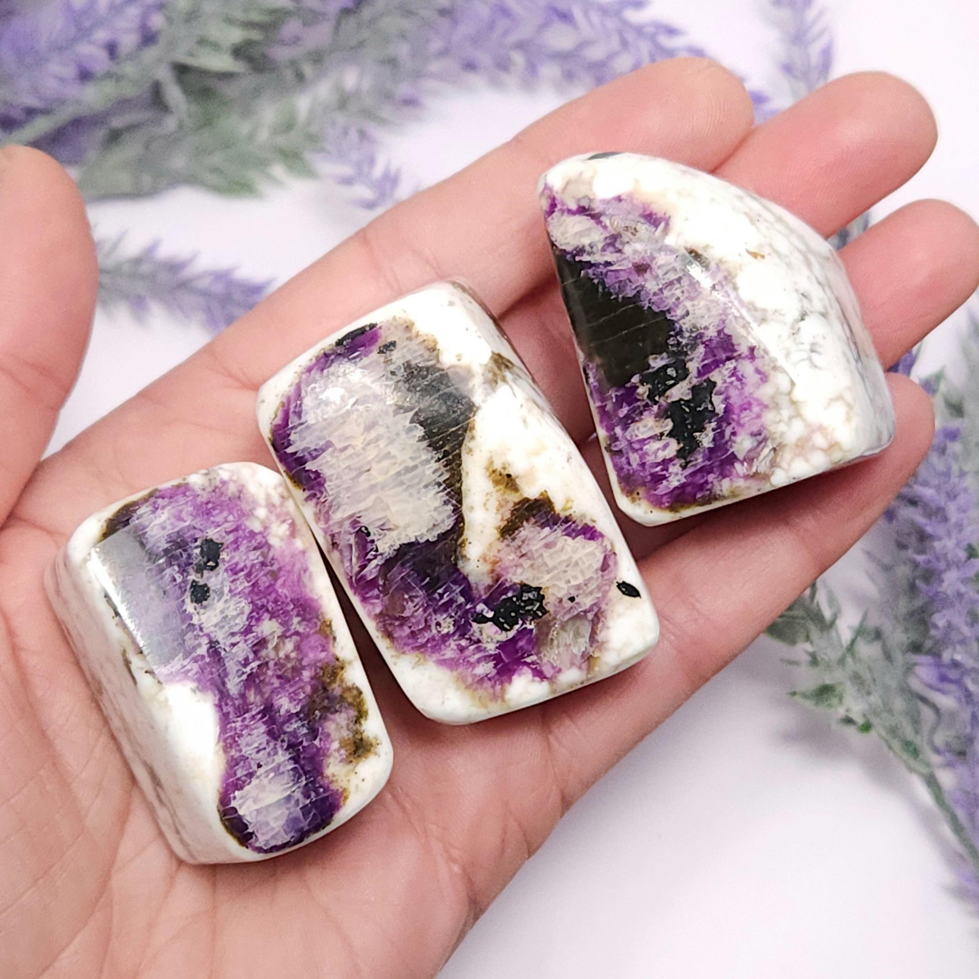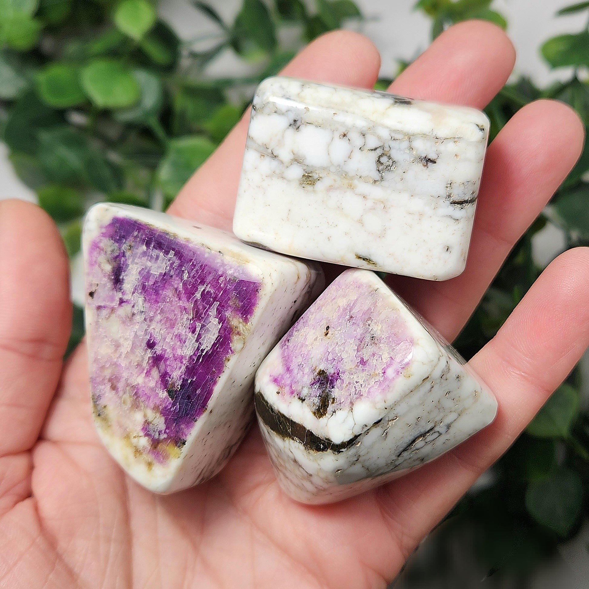 These Kammererite stones from India display dark, magenta purple coloring against marbled white. They have freeform shapes and have each been polished to a smooth surface. Each specimen measures approximately 1.5 inches.