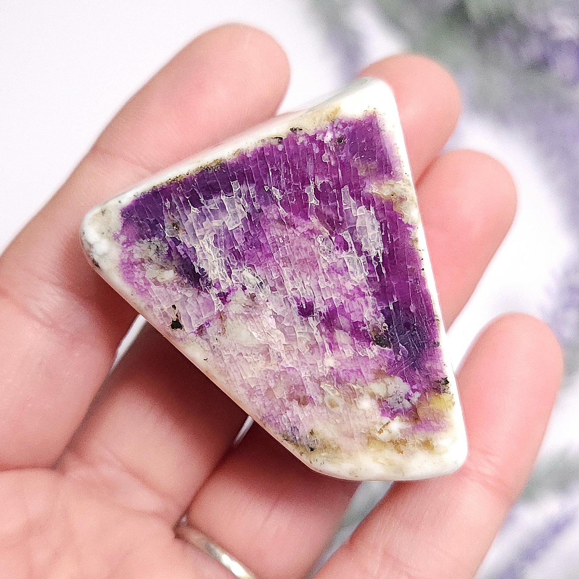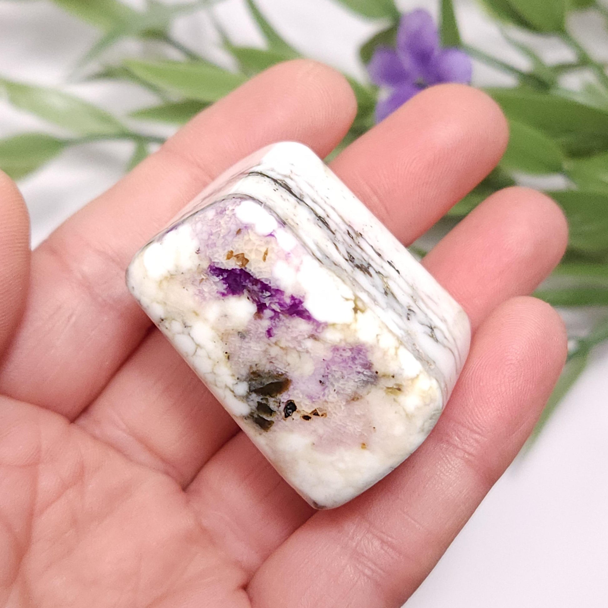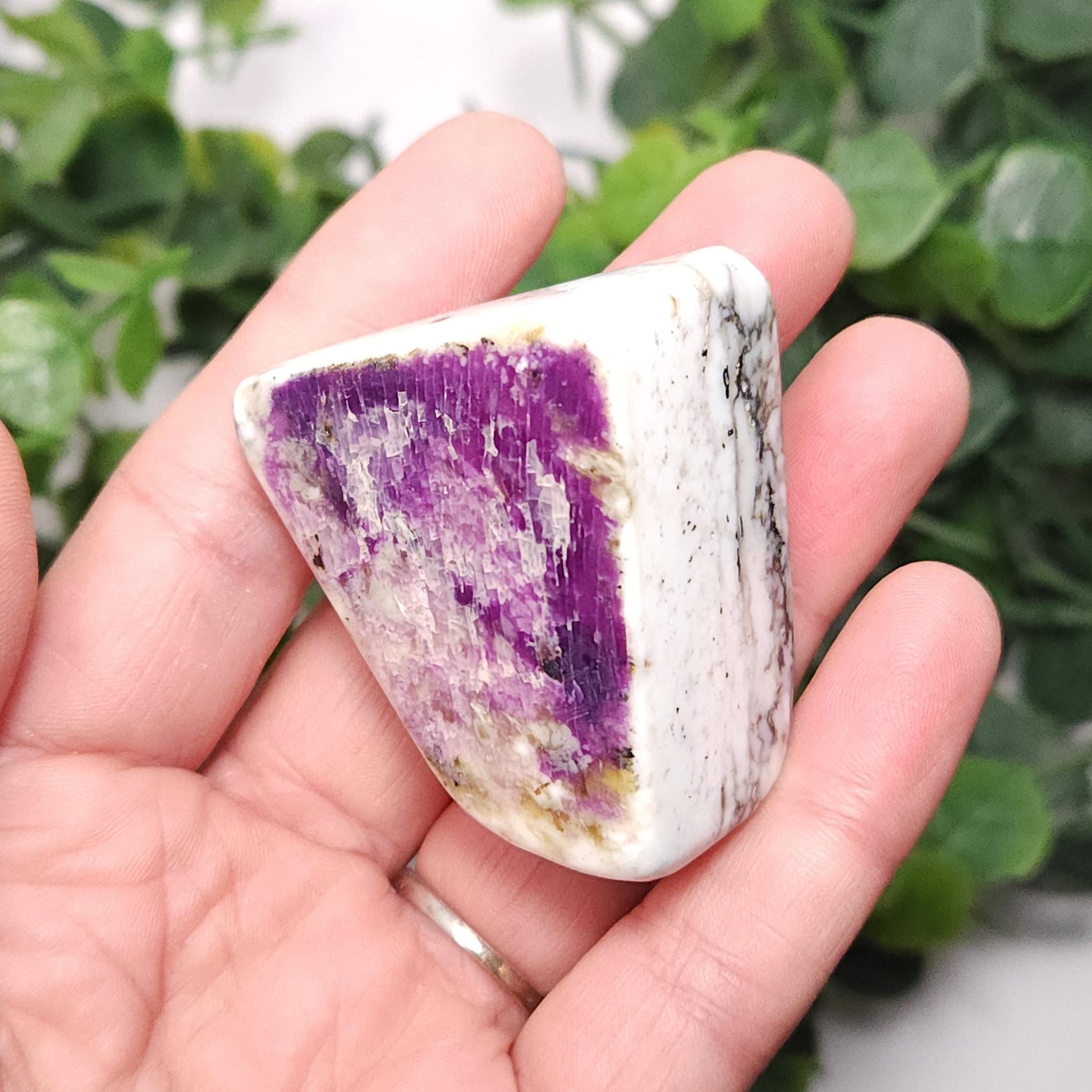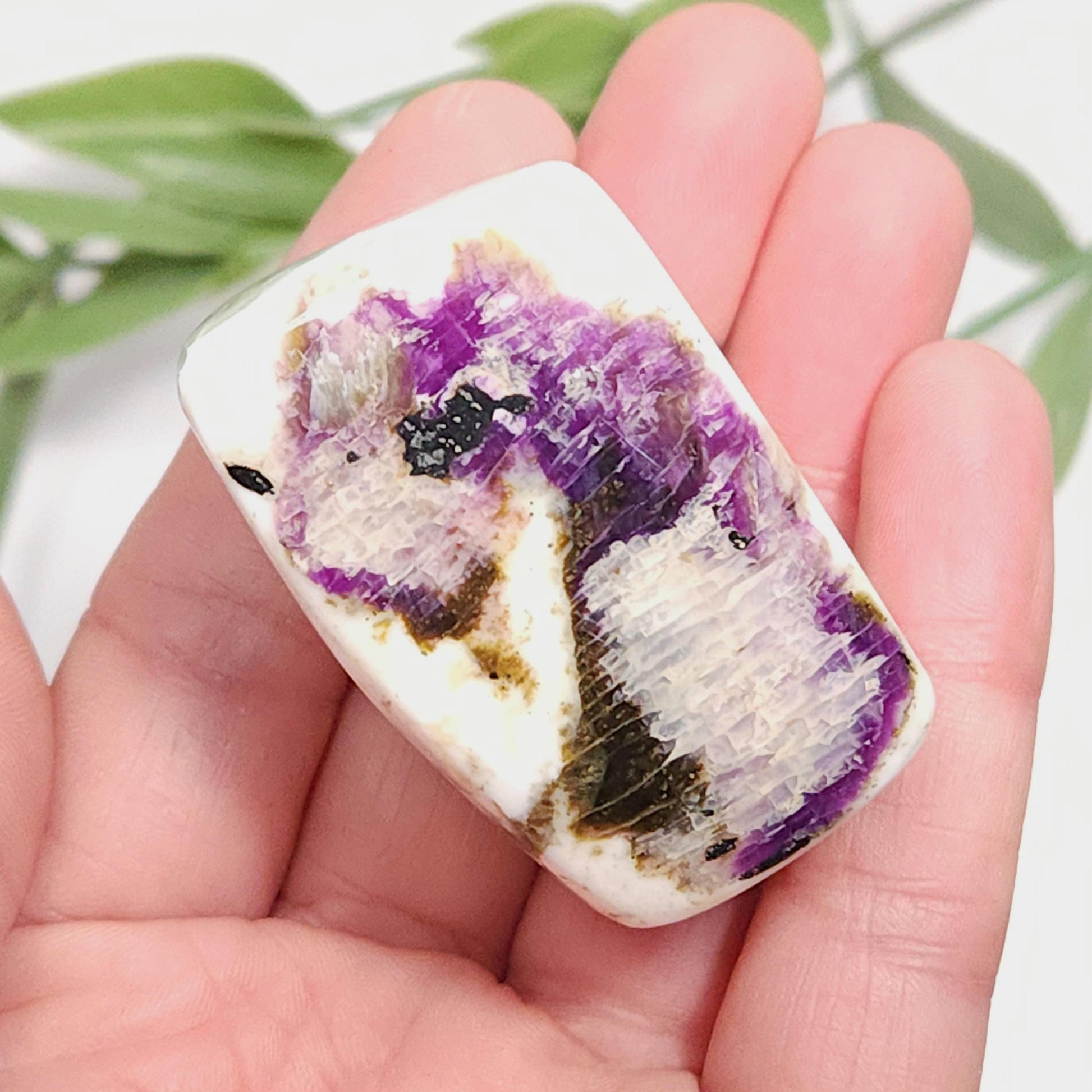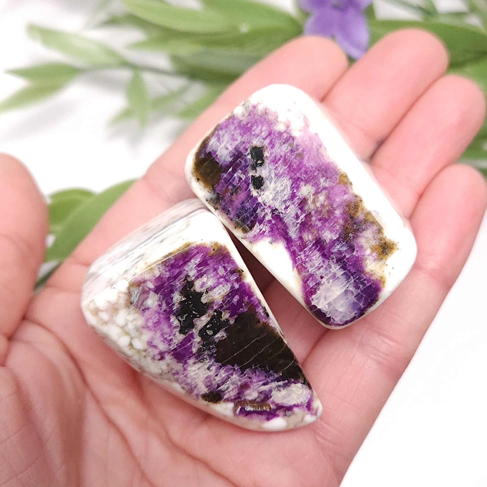 These Kammererite stones from India display dark, magenta purple coloring against marbled white. They have freeform shapes and have each been polished to a smooth surface. Each specimen measures approximately 1.5 inches.