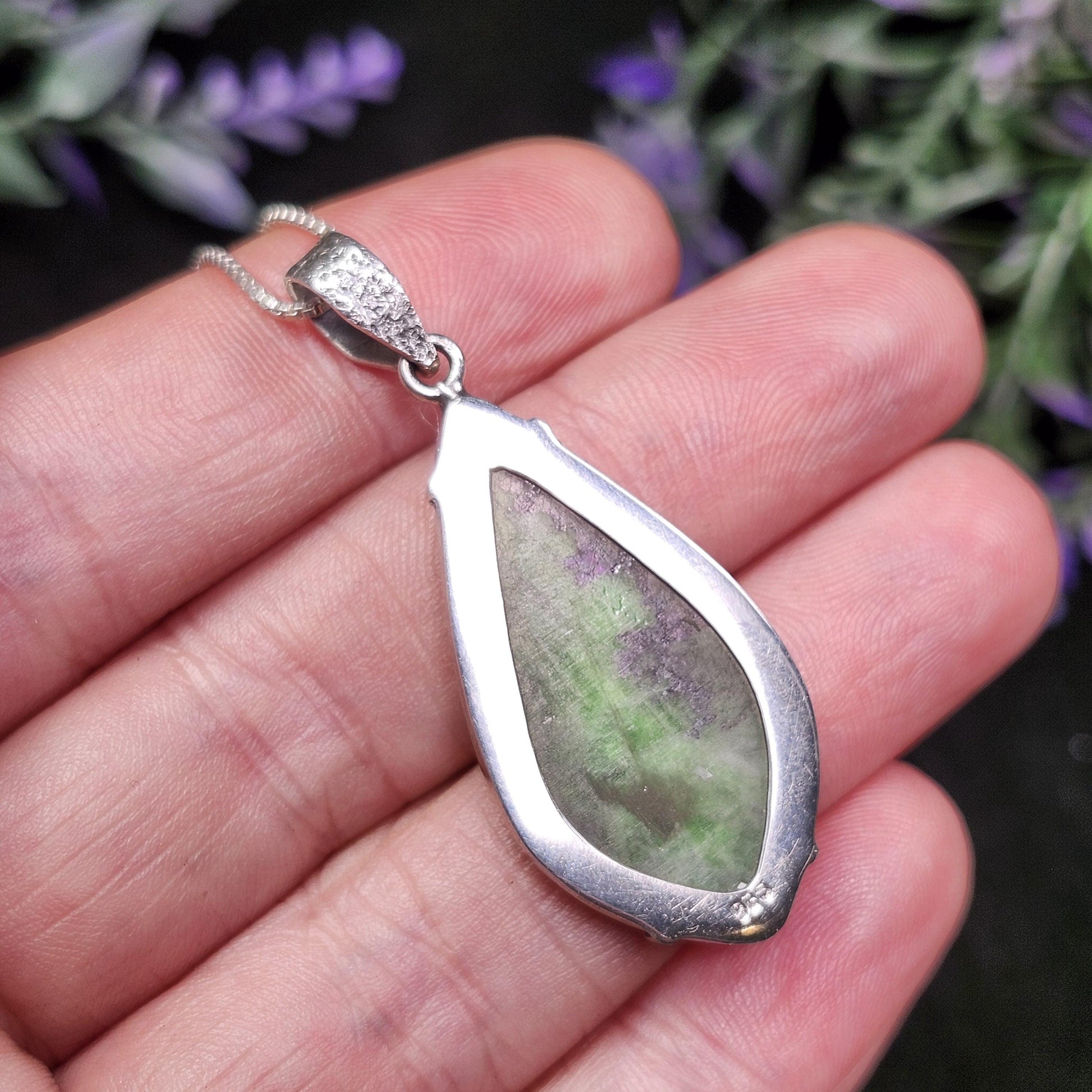 This Kammererite crystal has a high polish and exhibits dark purple paired with brilliant green. This crystal has been custom created into a sturdy piece of jewelry using .925 Sterling Silver. This pendant measures approximately 44mm by 18mm. The silver chain used in the photos is to help envision how this pendant will look while adorned but is not included in the listing.
