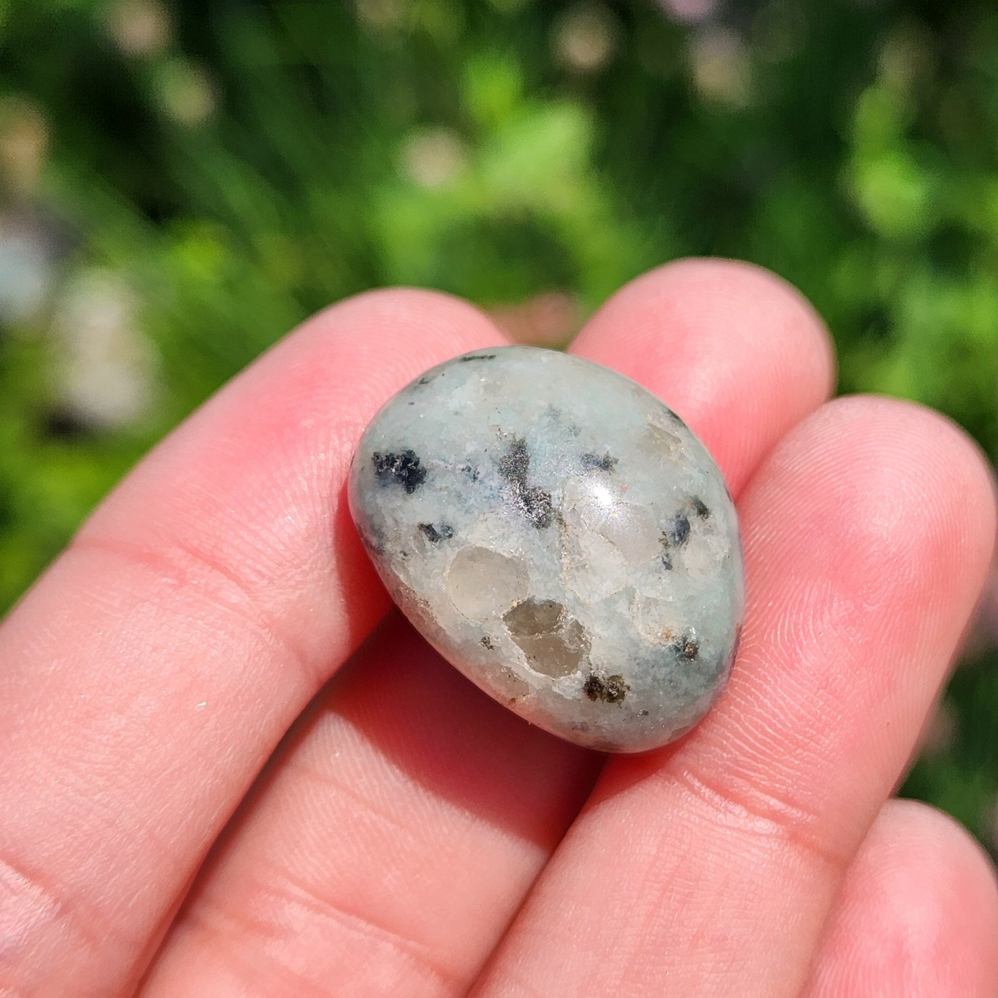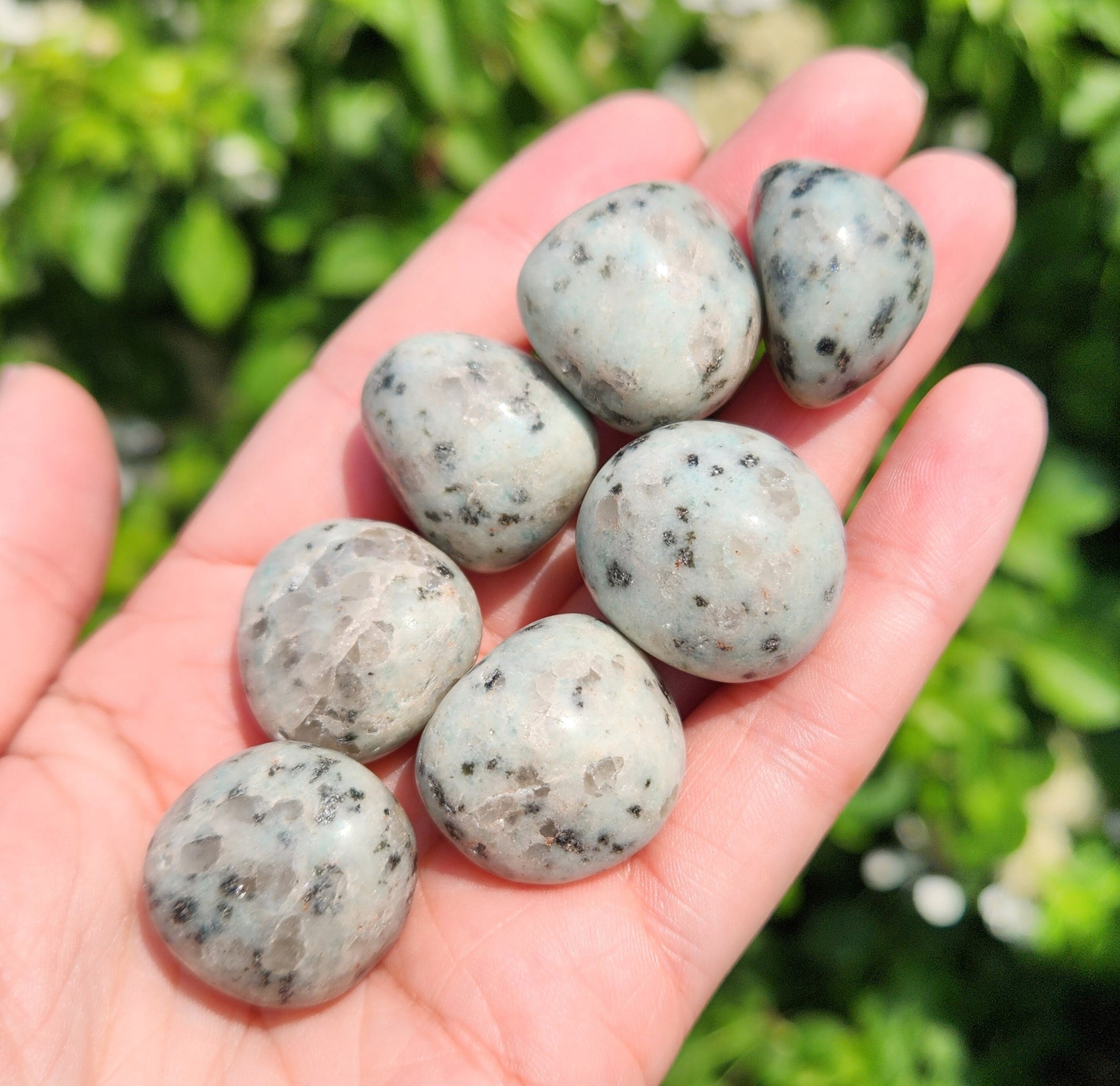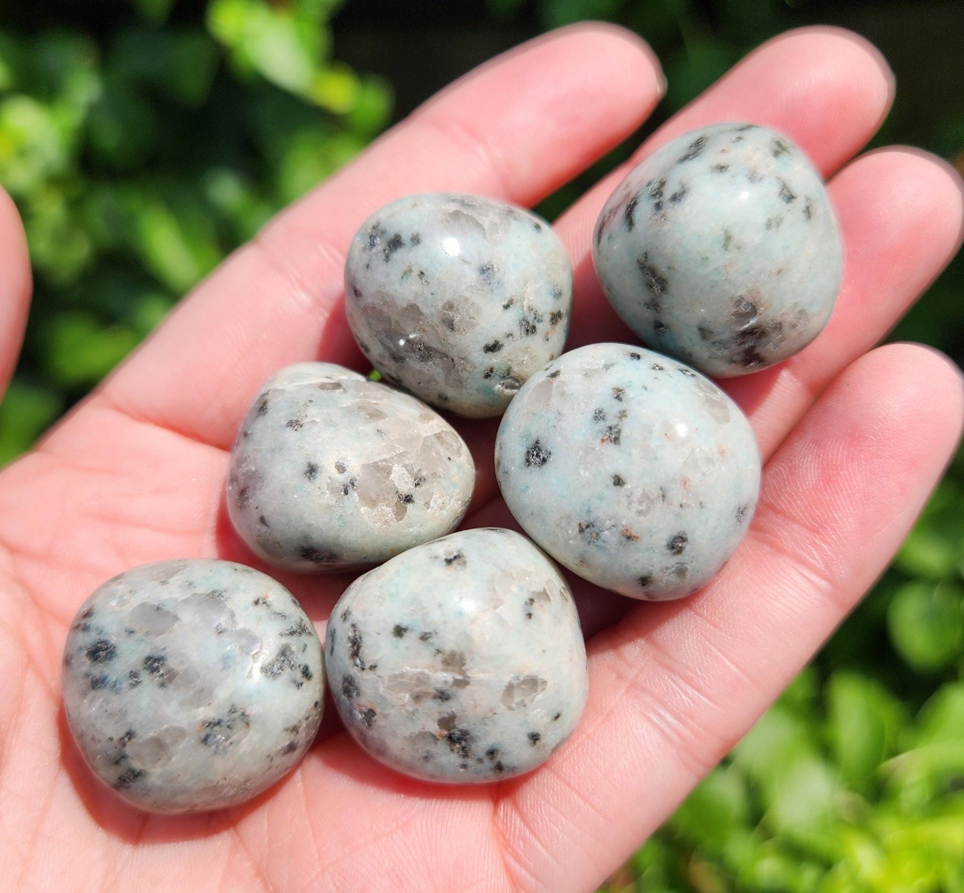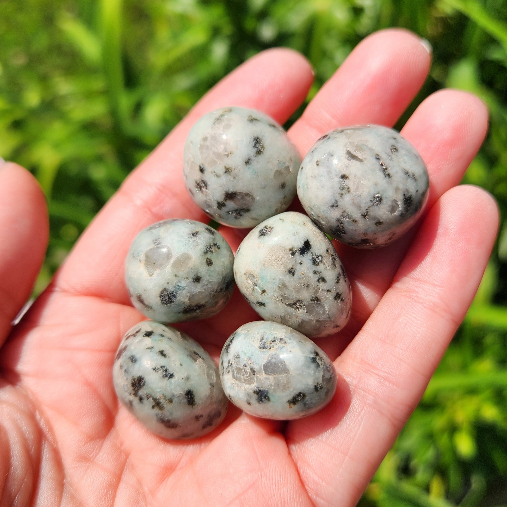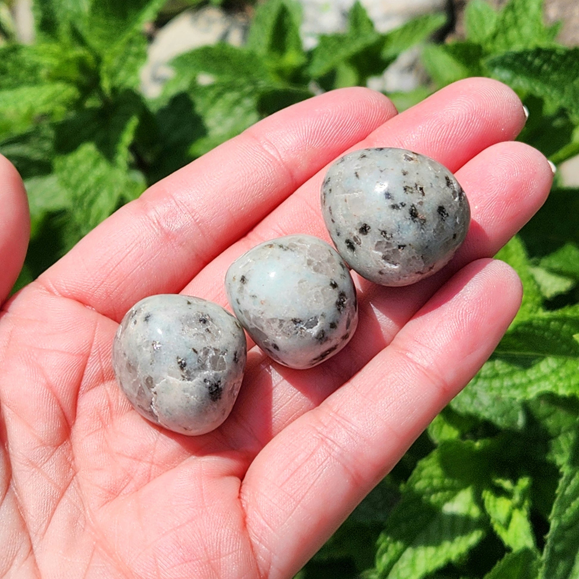 These Sesame Jasper stones have been tumbled to a smooth polish. They have a creamy light grey coloring with a blue-green hue, showcasing dark speckles and silica-rich inclusions. Each specimen measures approximately .75 inches.