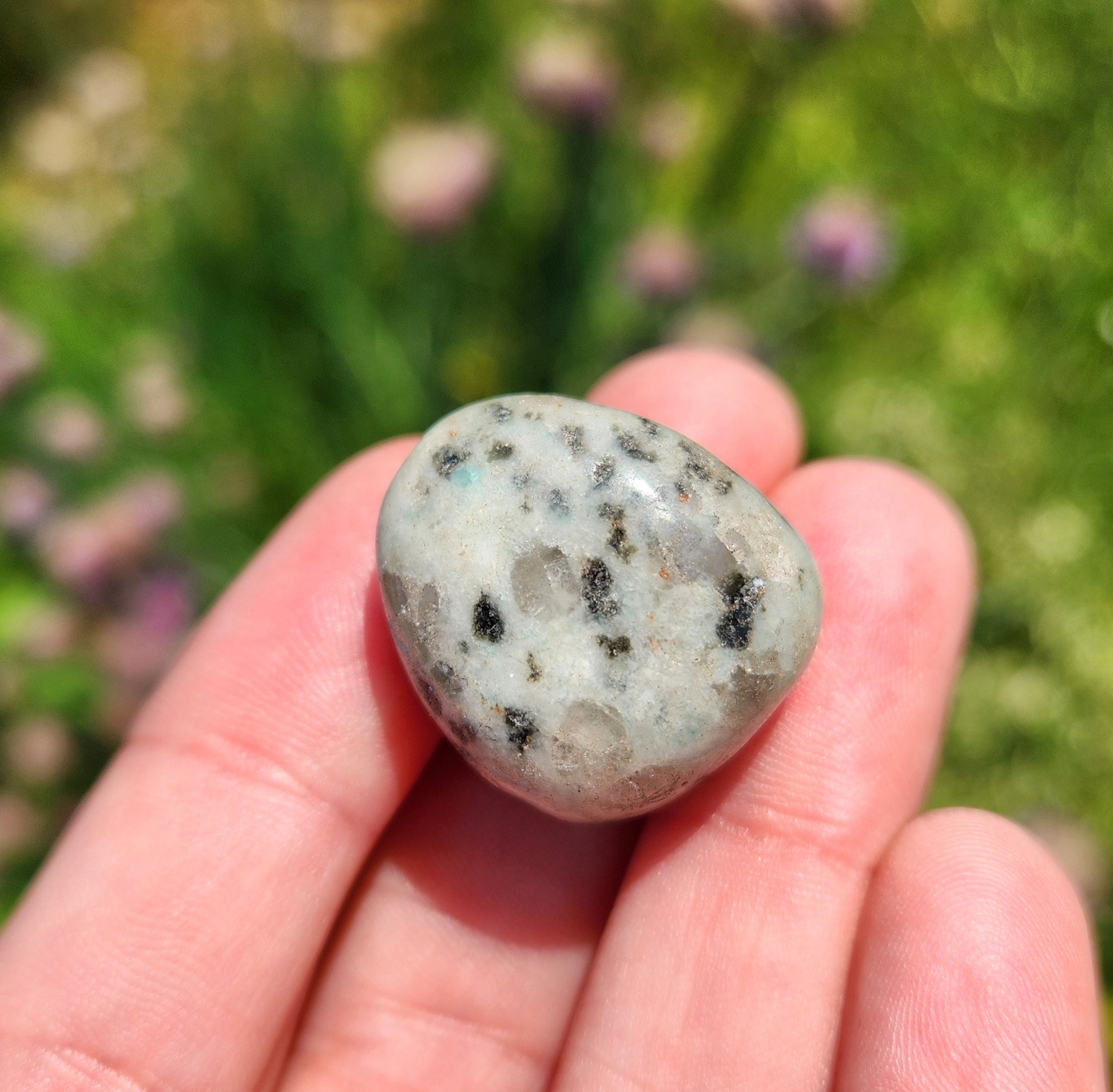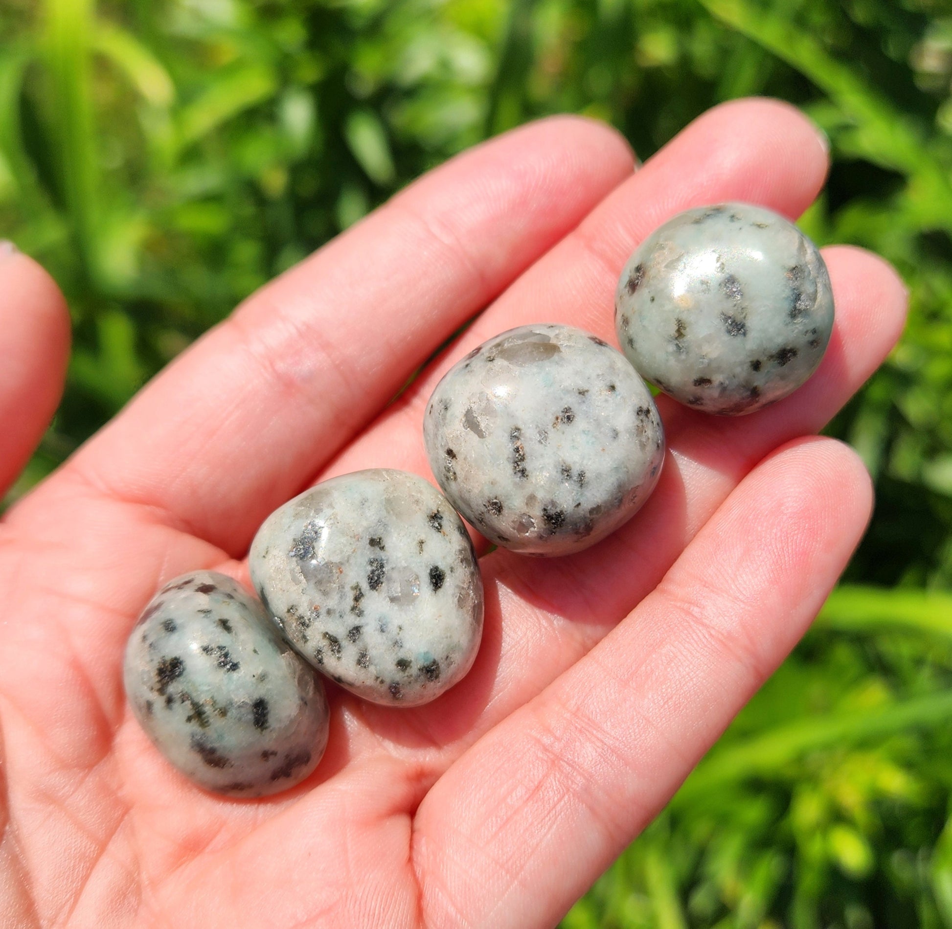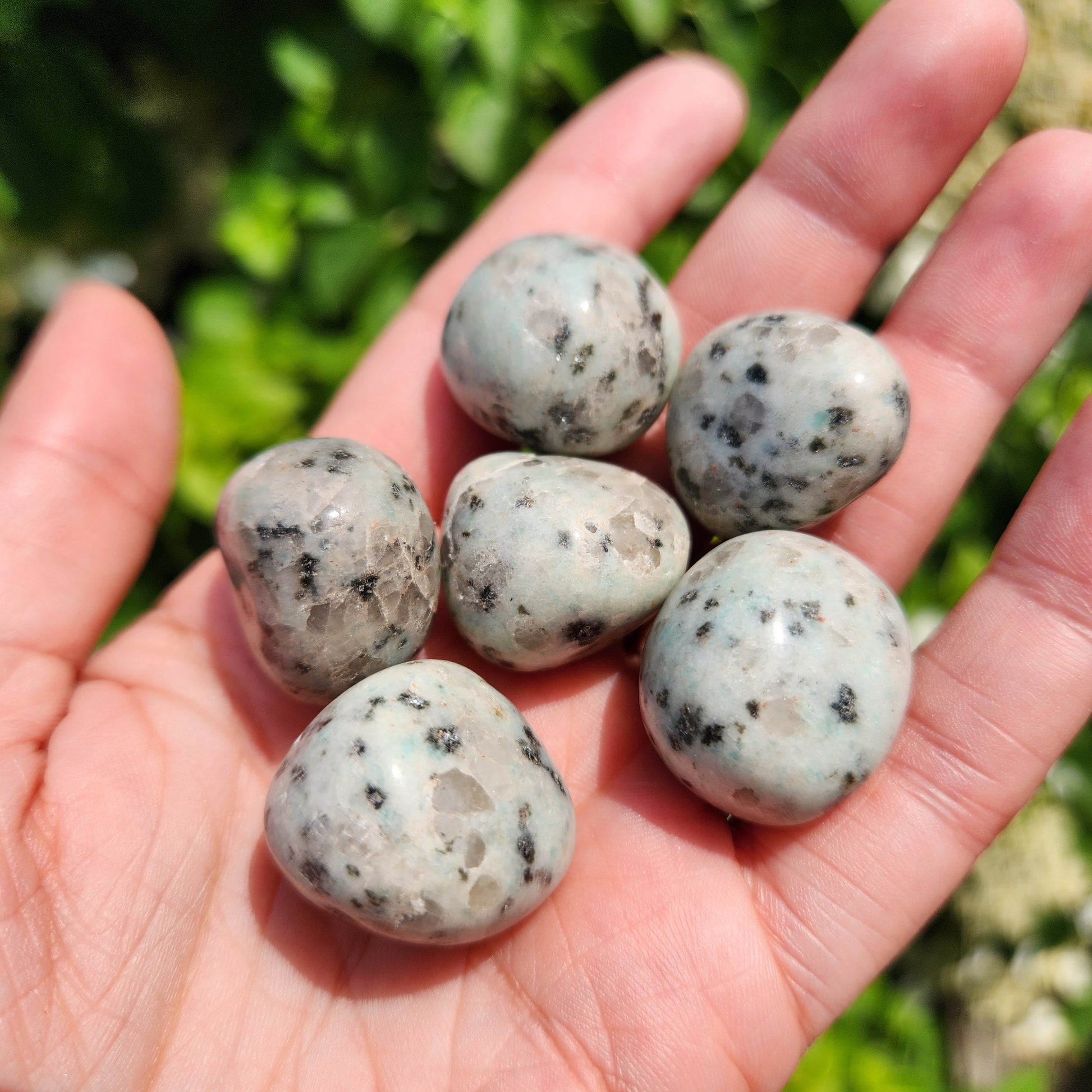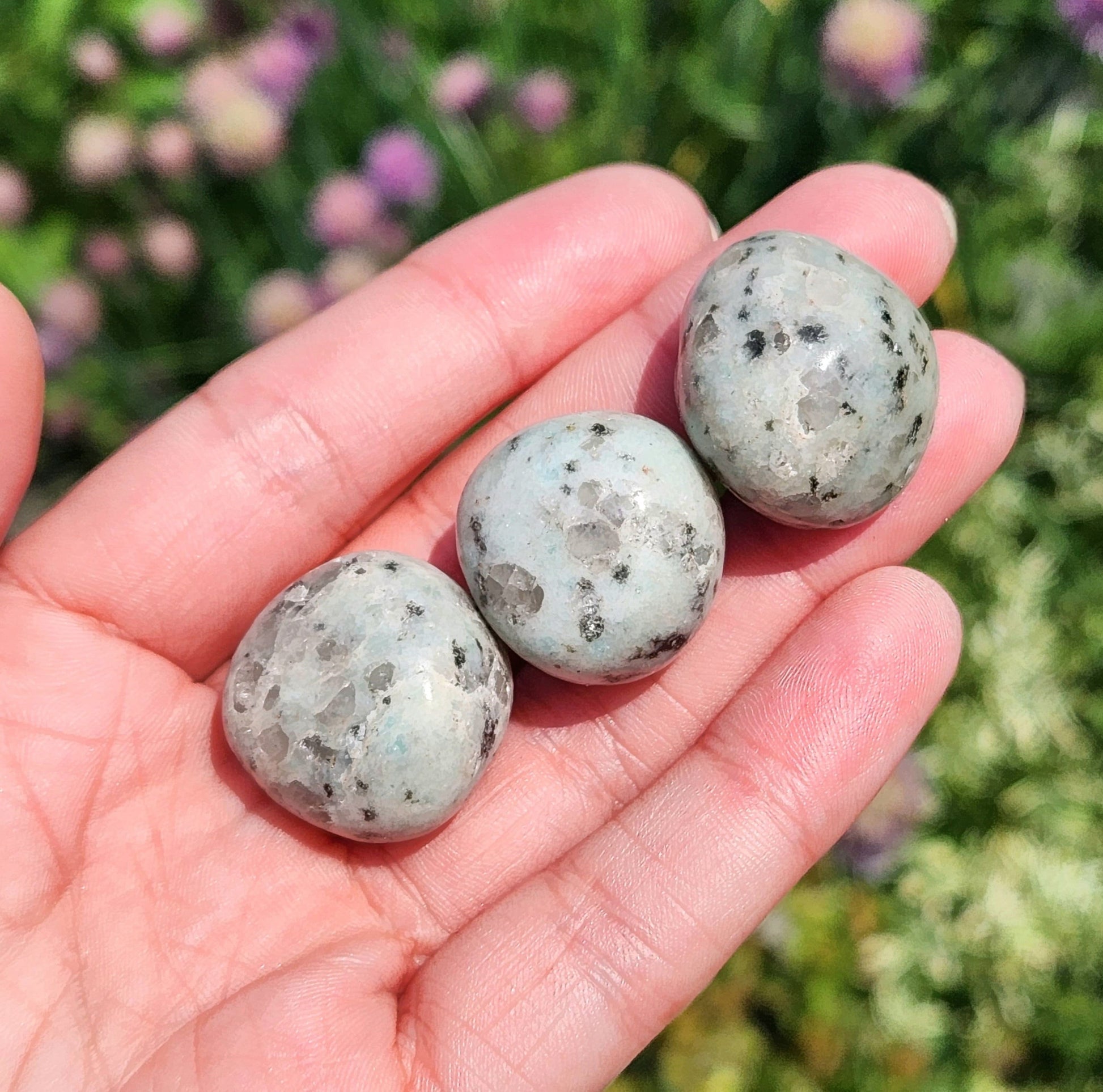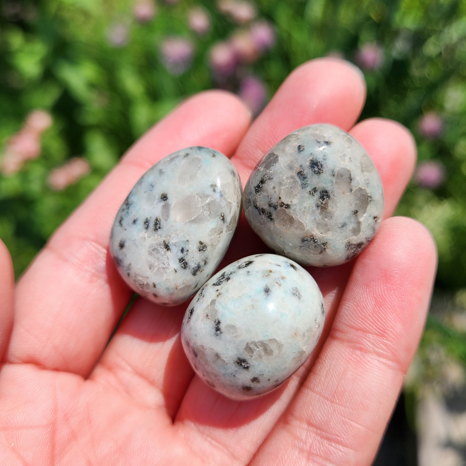 These Sesame Jasper stones have been tumbled to a smooth polish. They have a creamy light grey coloring with a blue-green hue, showcasing dark speckles and silica-rich inclusions. Each specimen measures approximately .75 inches.