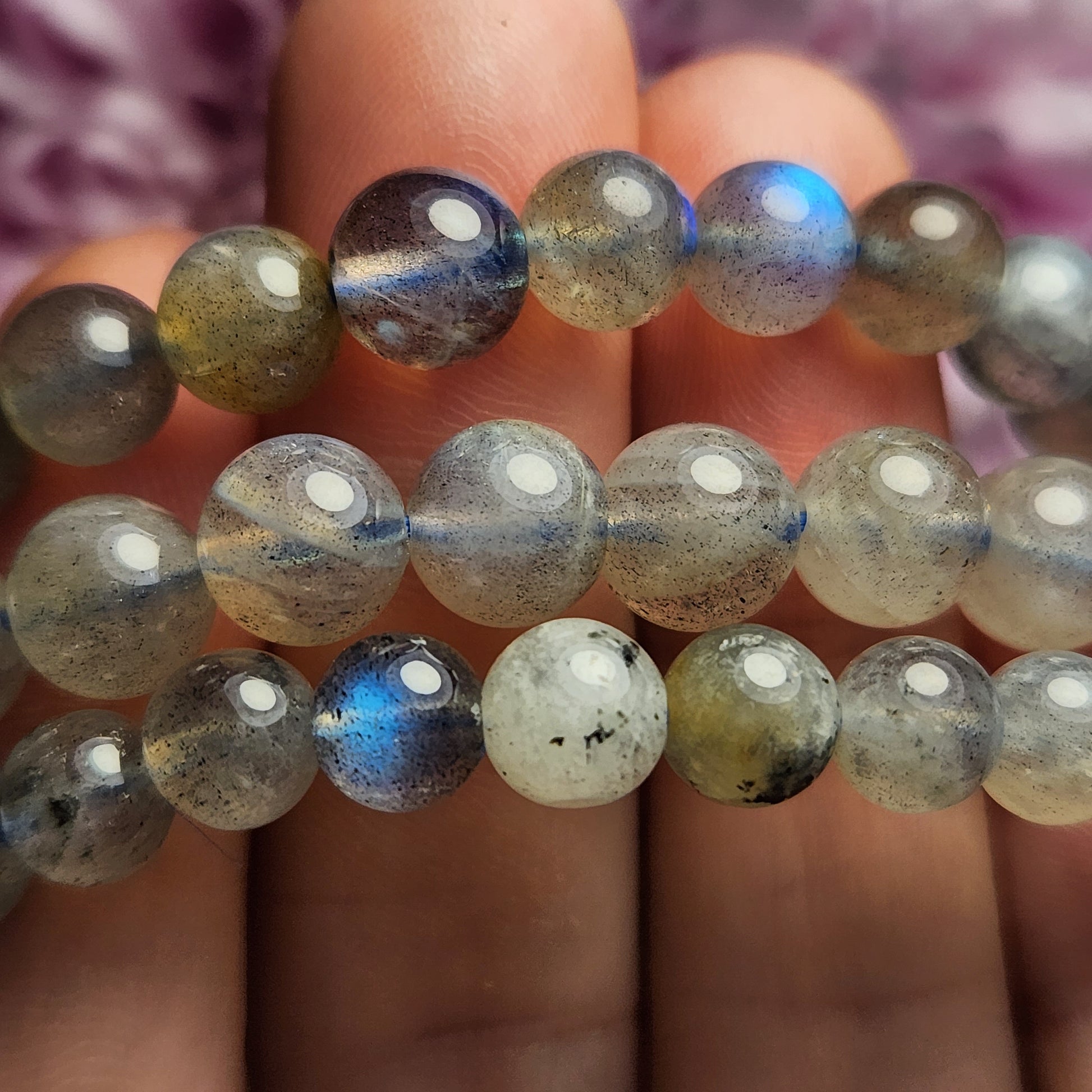 These Labradorite stretch bracelets are created with 5-6mm beads that have been polished to a high sheen. Each bracelet measures approximately 7 inches.