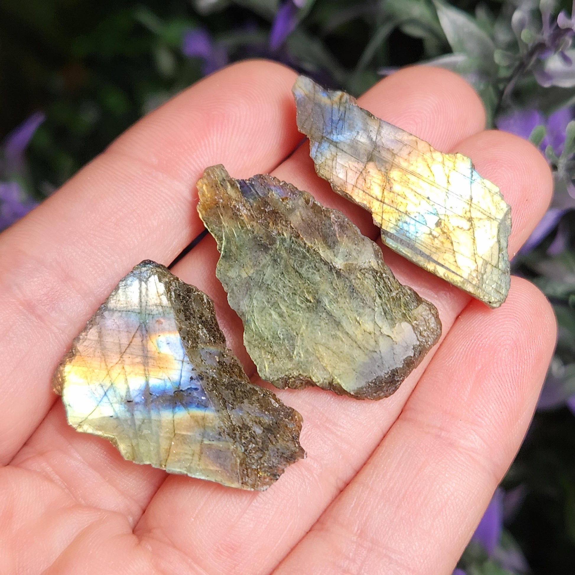 These all natural Labradorite crystals from Madagascar have a sliced face that has been polished to help reveal flashes of golden or blue coloring. These are freeform shaped stones with raw sides and rougher, dully polished undersides. Each unique piece has an angle where it brightens up and shares its labradorescence, a classic trait of this material.