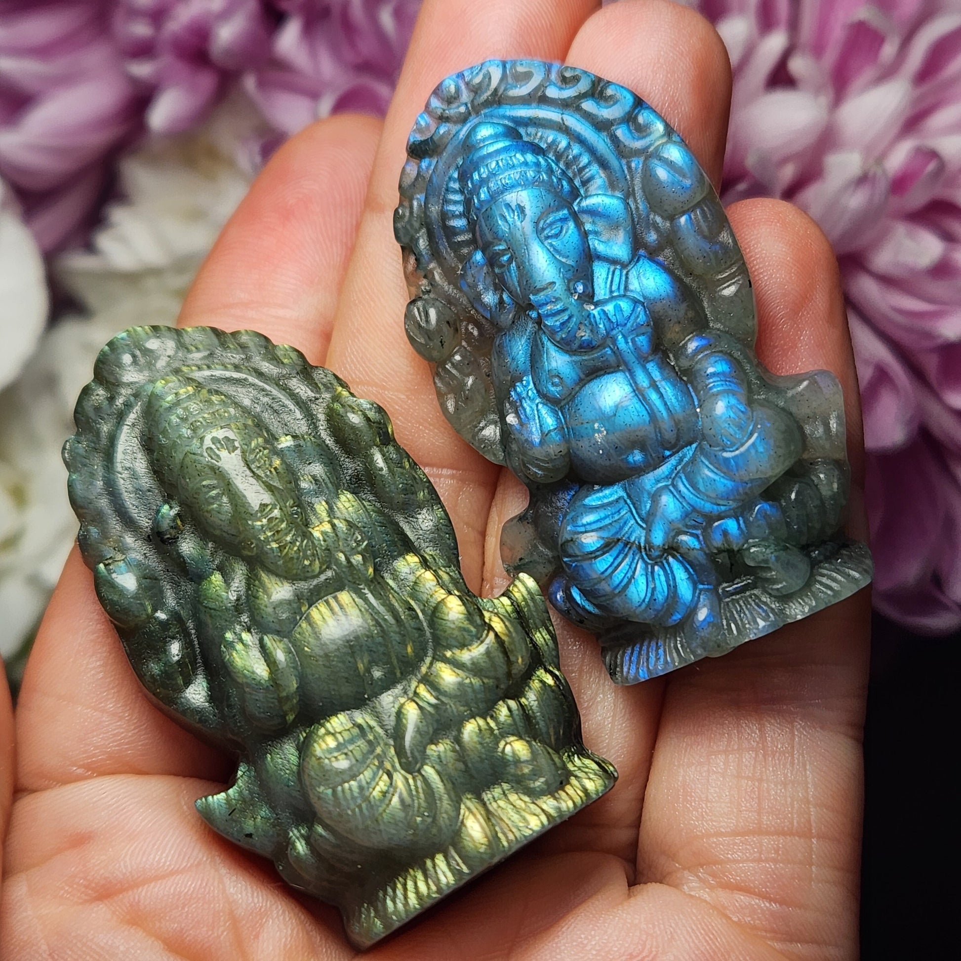 These Labradorite crystals have been carved into Ganesh shapes, with a flat back, and have been polished to a high sheen. They exhibit strong flashes labradorescence with brilliant blue and gold hues. Each specimen measures approximately 50mm by 25mm.