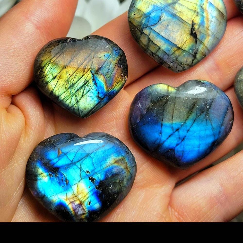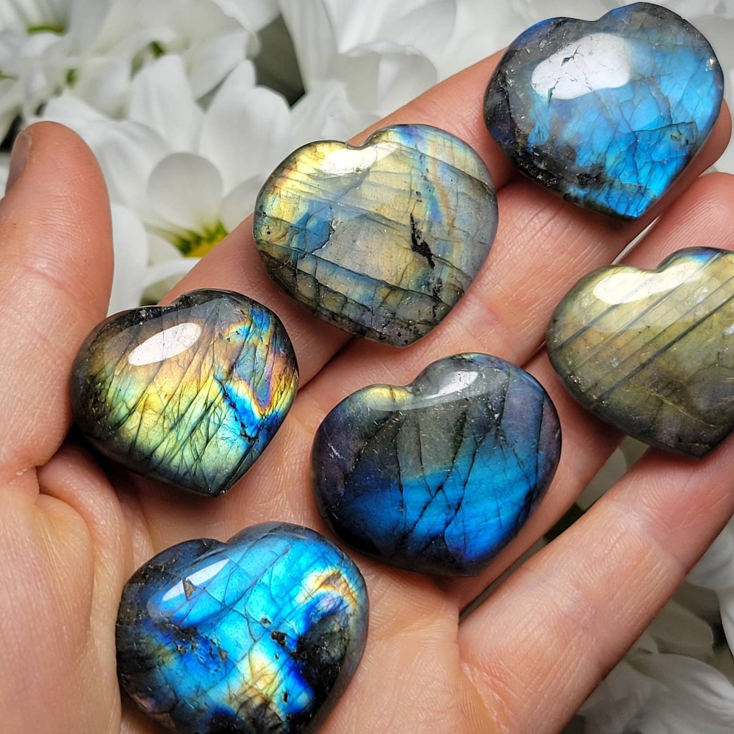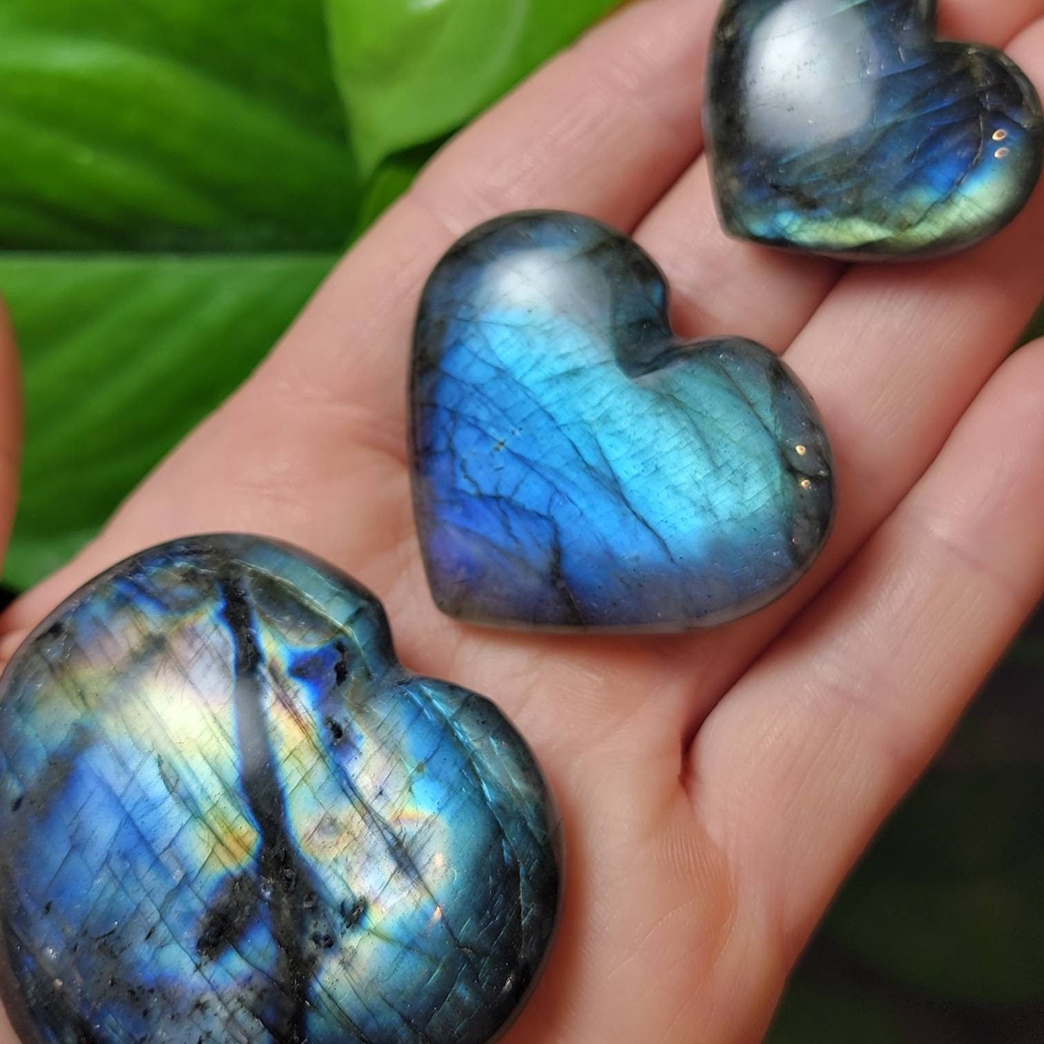 These Labradorite heart carvings have gorgeous flashes of color and a high polish. These are perfect pocket or altar talismans. Each labradorite heart is completely unique, so expect inclusions or black streaks and chatoyant glows in any