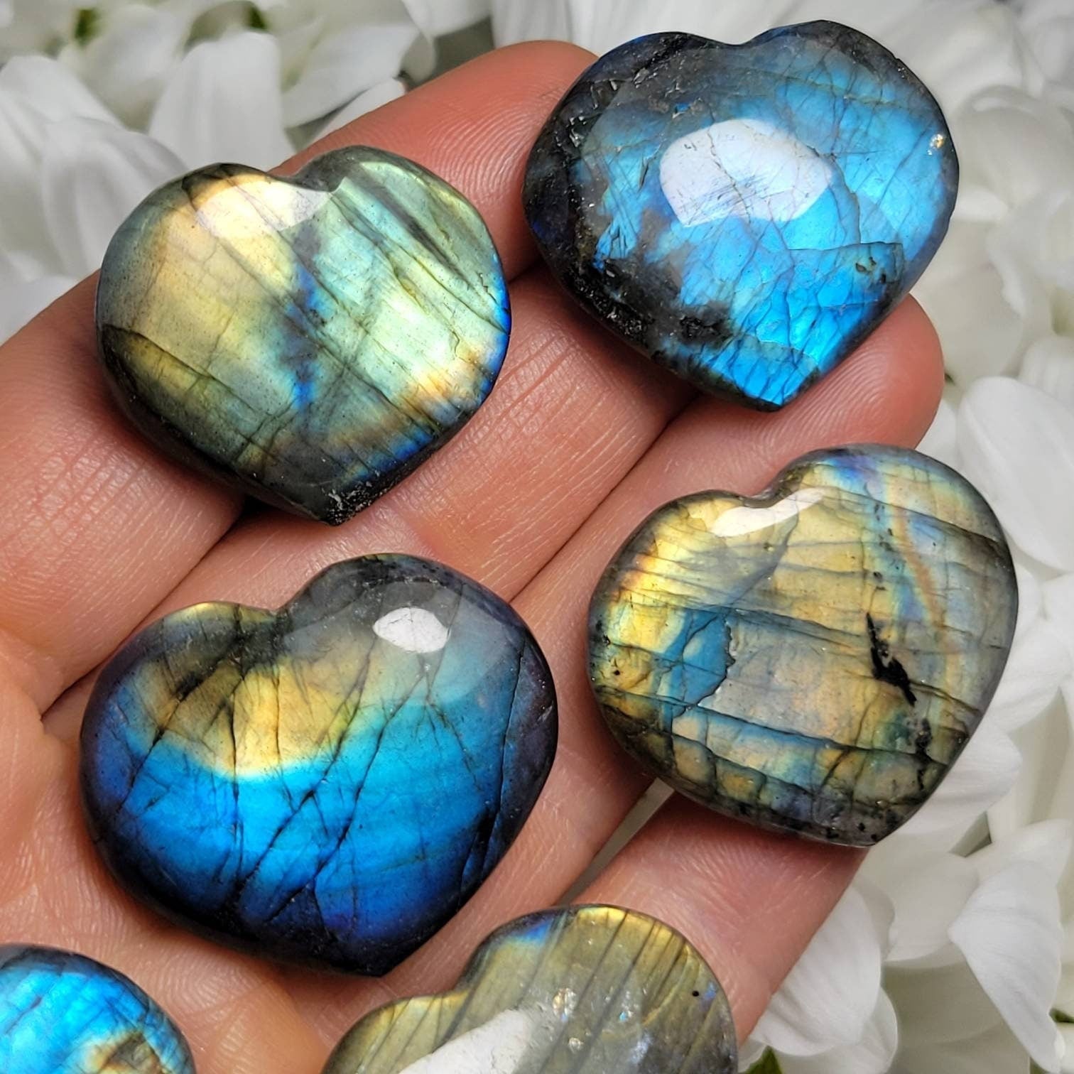 This listing is for ONE (1) intuitively selected Labradorite crystal heart specimen. All stones have been hand picked and examined for quality. Each unique crystal has a flash of color and a high polish.