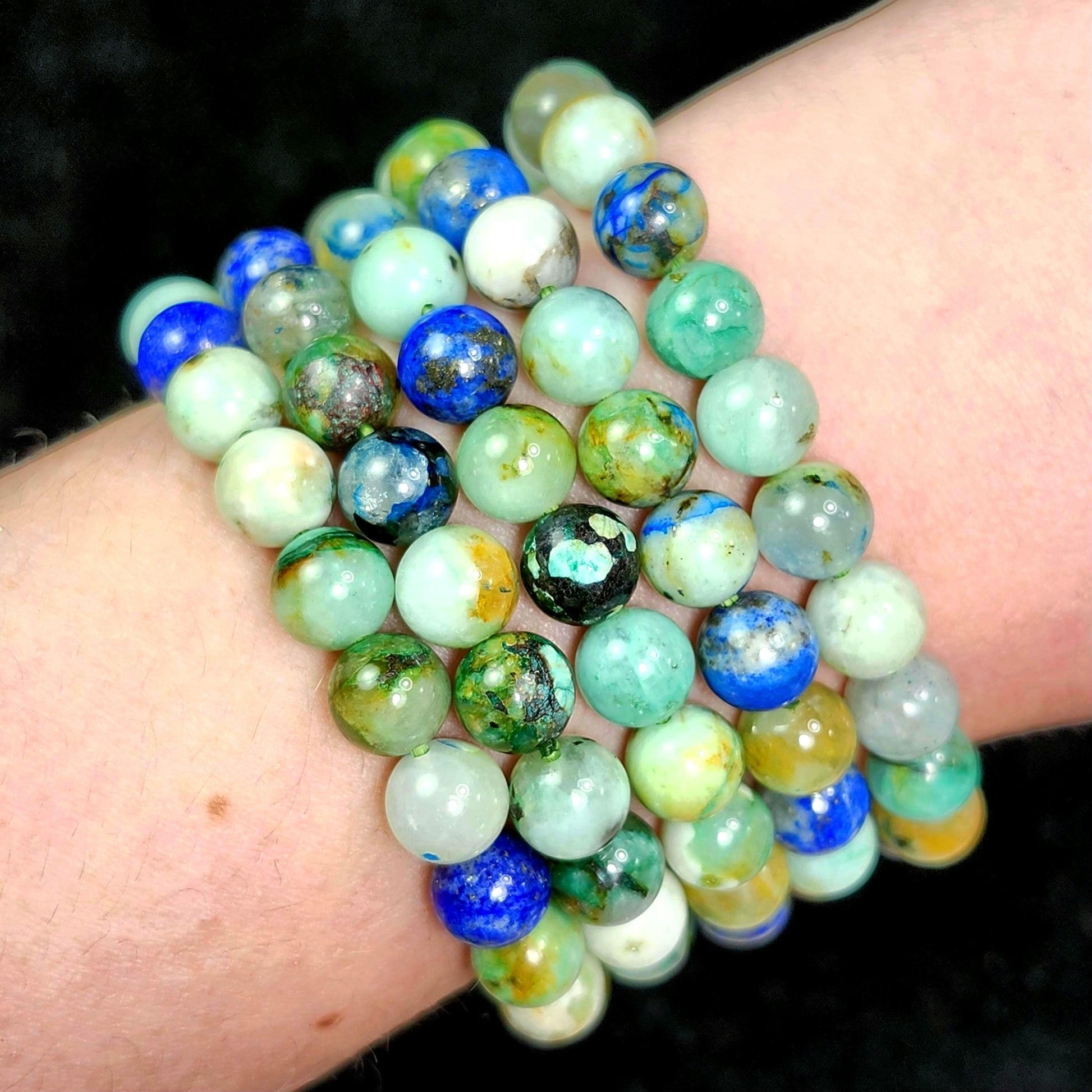 These Lapis Lazuli & Chrysocolla stretch bracelets are created with 7-8mm beads that have been polished to a high sheen. Each bracelet measures approximately 7 inches.