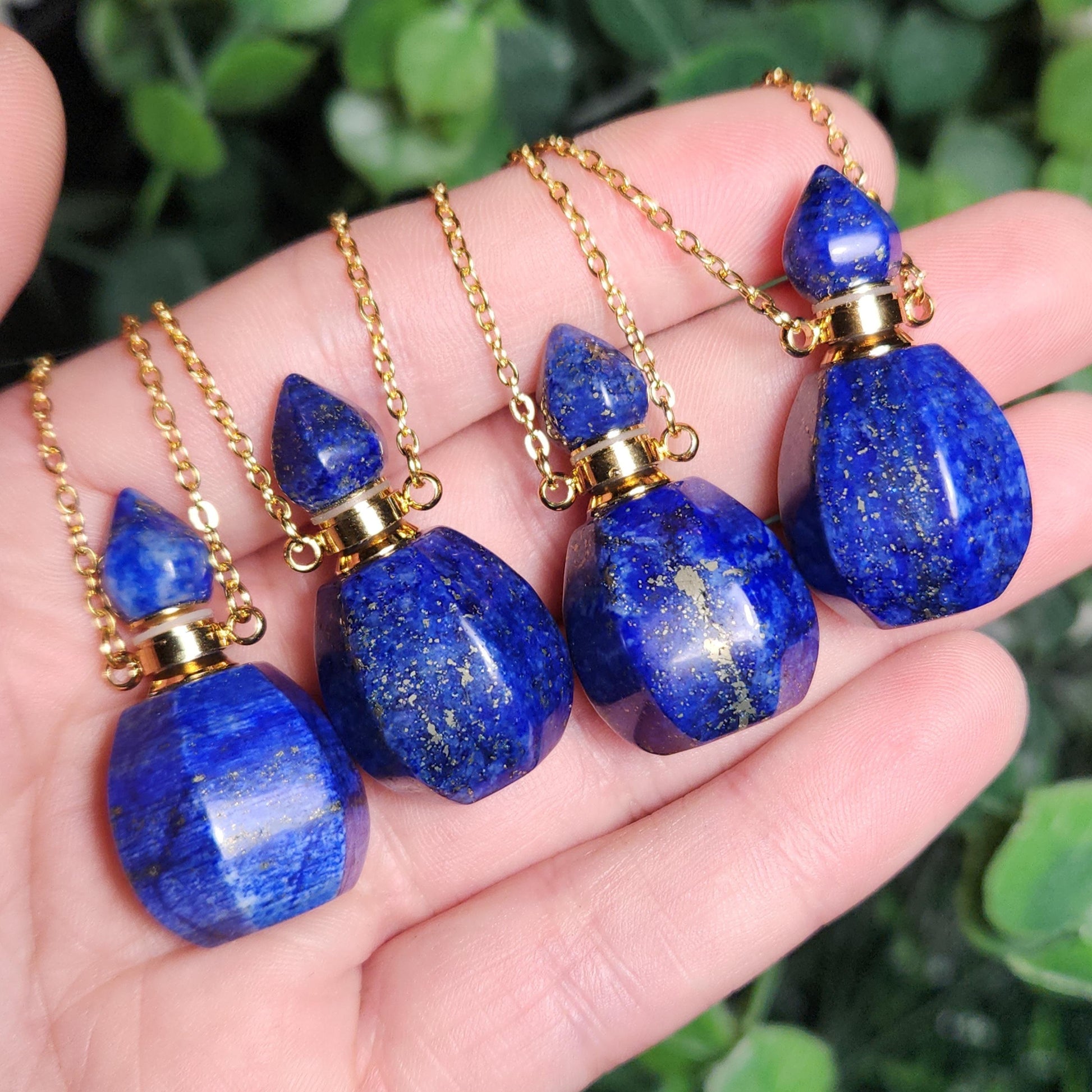 These functional oil bottles have been carved out of natural Lapis Lazuli gemstones. Their openings are approximately 3mm and they are held securely closed with screw-on tops. Each 30-35mm pendant hangs from a copper-colored necklace chain that measures approximately 18 inches in length and has a lobster clasp closure. Choose your preference from the drop-down menu!