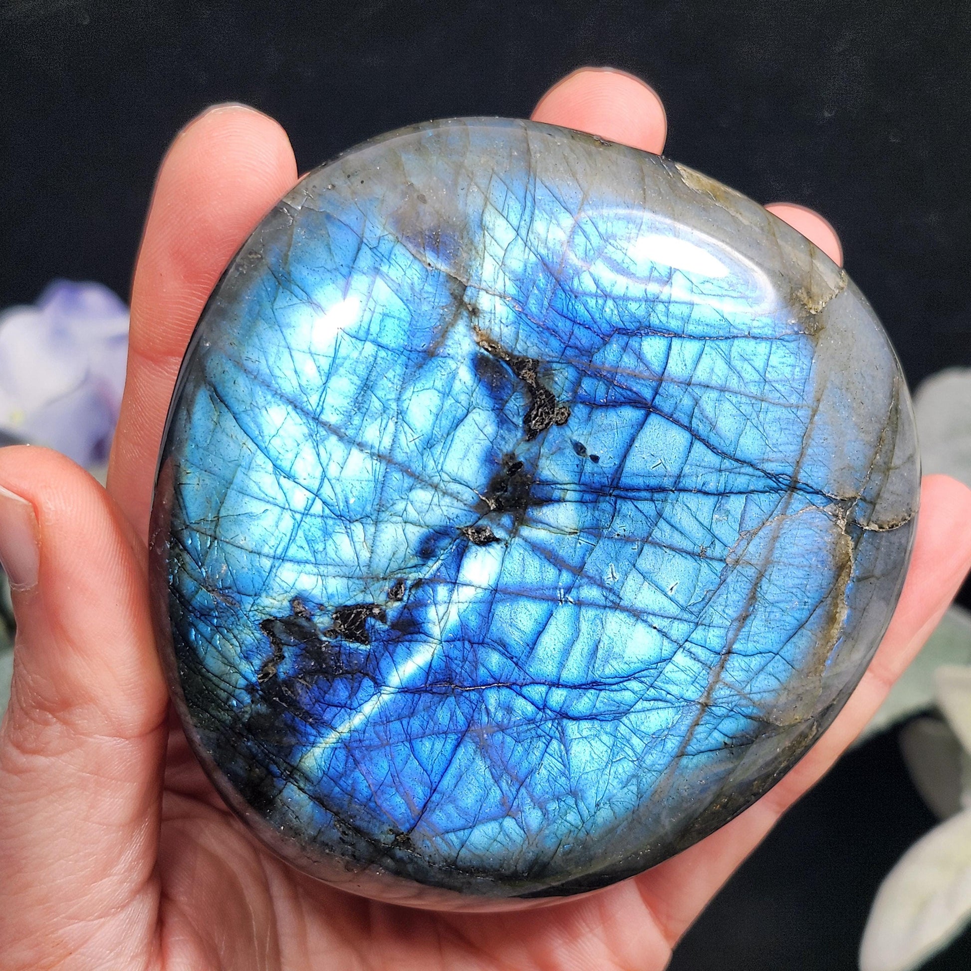This all natural Labradorite crystal from Madagascar is from some of the highest quality available. It has a beautiful flash of color and a shining polish. This specimen measures 92mm by 85mm by 25mm and weighs 454 grams.