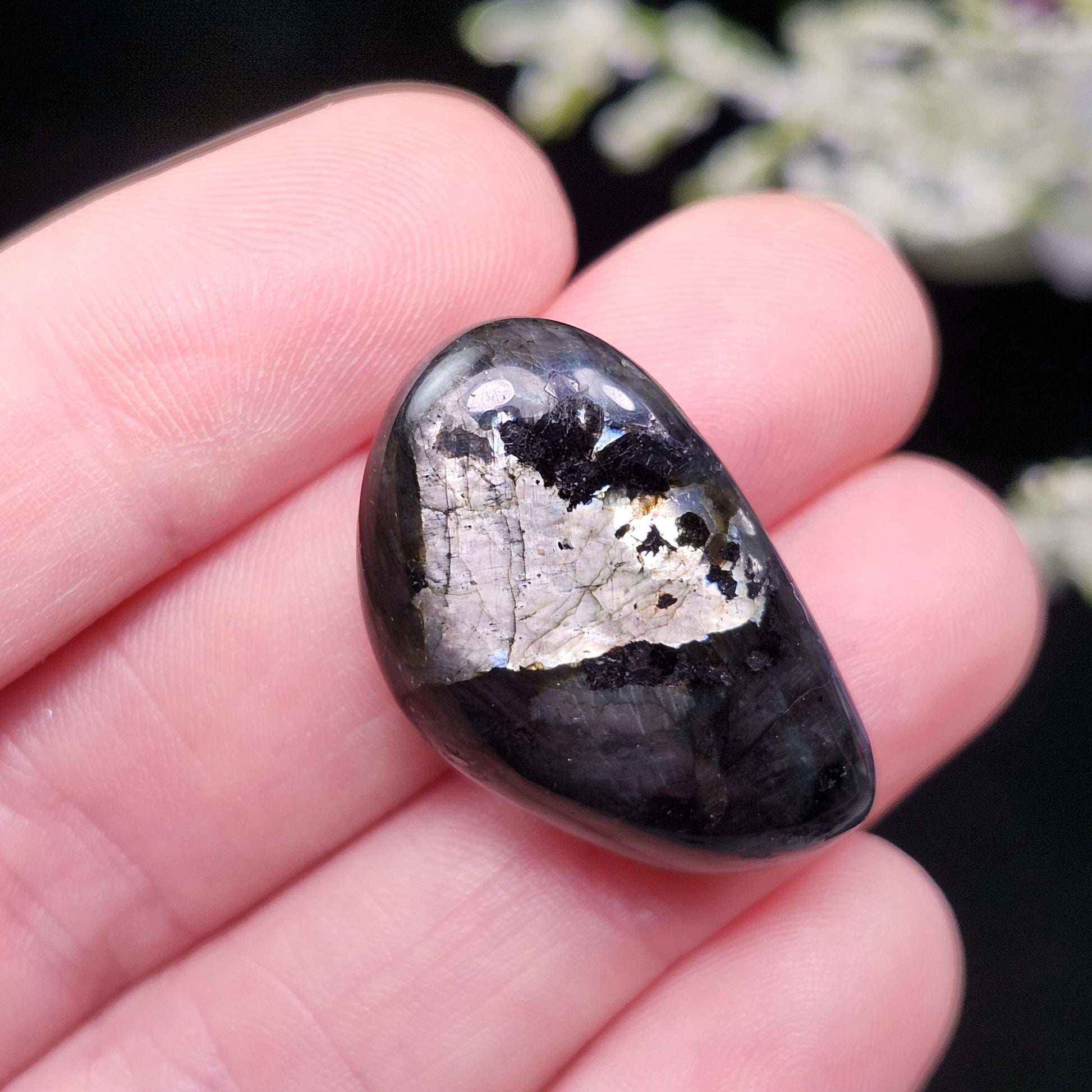 These Larvikite stones have freeform shapes and have been tumbled to a smooth polish. They have a deep, dark coloring and reveal flashes of chatoyant color play when held at an angle. Each specimen measures approximately .75 inches.