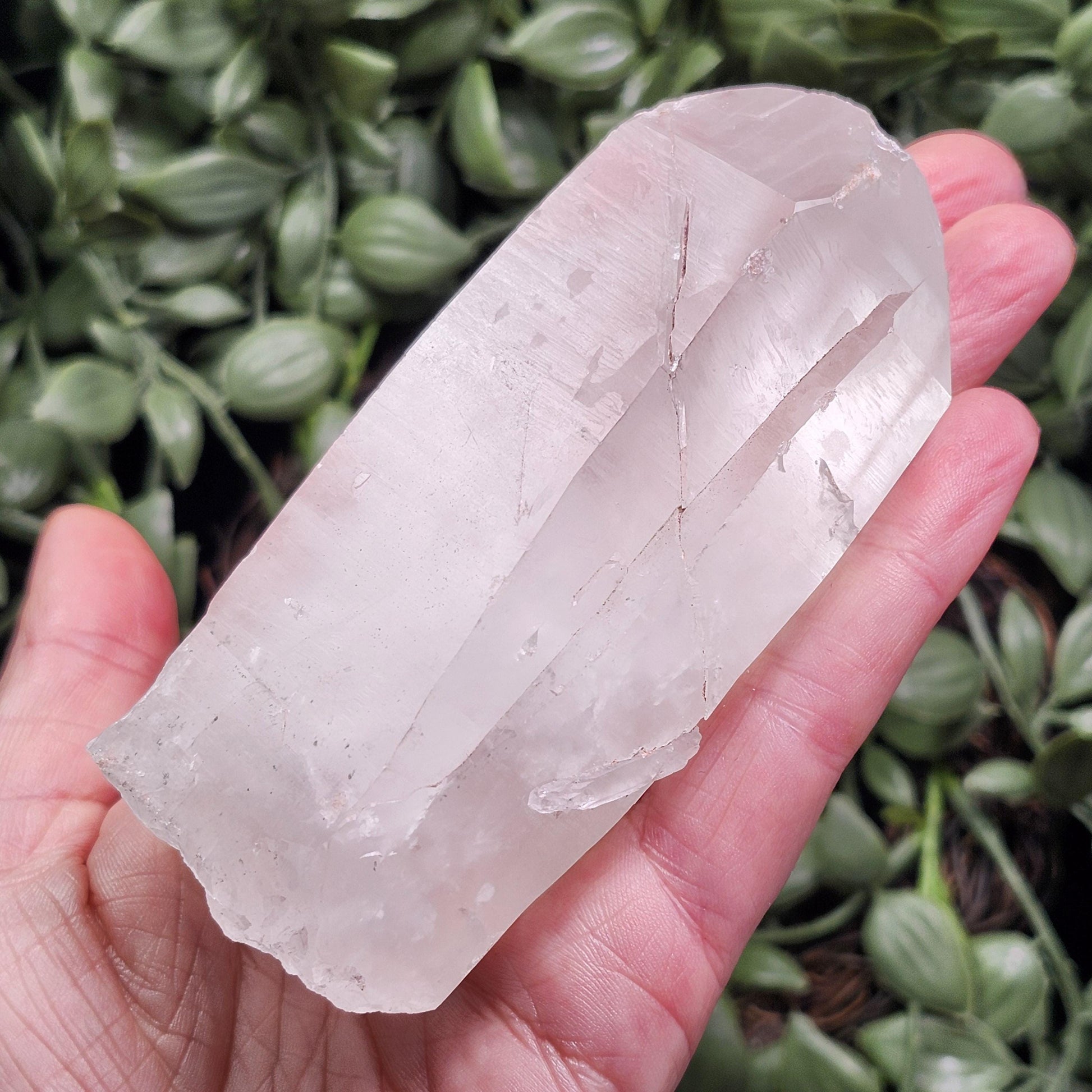 This Lemurian Seed Quartz crystal from Madagascar has visible horizontal etchings on its surface and features a large, distinct termination with smaller terminated bridge crystals. Bridge/manifestation crystals are formations where a stark termination grows partially or fully within a larger host crystal. This unique structure highlights a natural process of inclusion and intergrowth, representing the complex beauty of mineral development. This specimen measures approximately 97mm by 47mm by 28mm and weighs 254 grams.