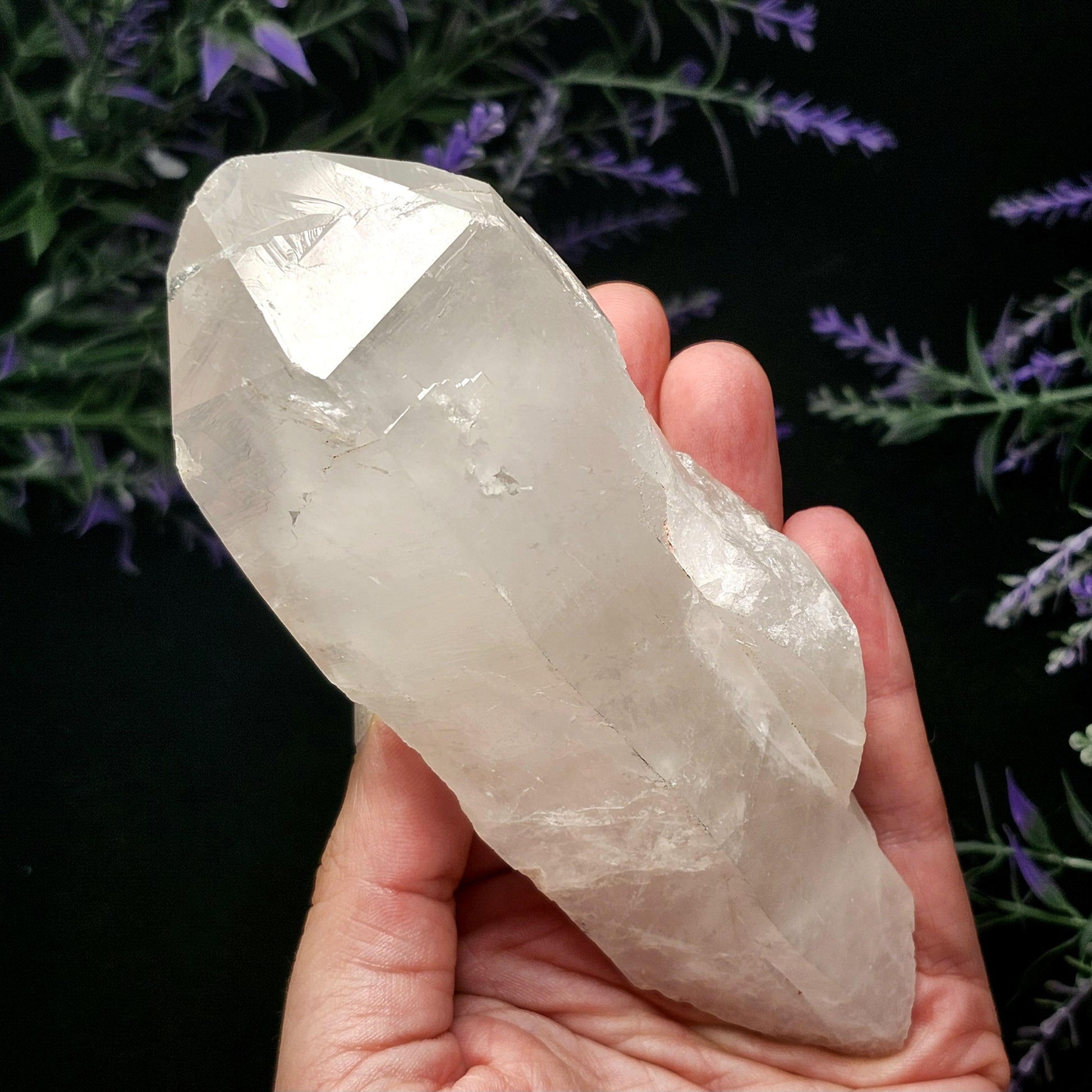 This Lemurian Seed Quartz crystal from Madagascar has visible horizontal etchings on its surface and features a large, distinct termination. This specimen measures approximately 140mm by 50mm by 40mm and weighs 304 grams.