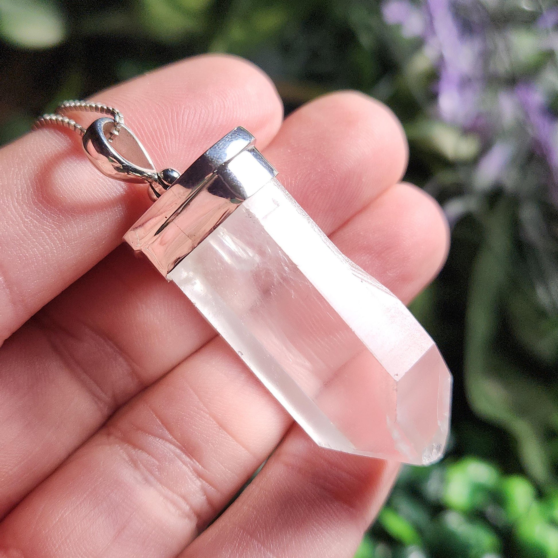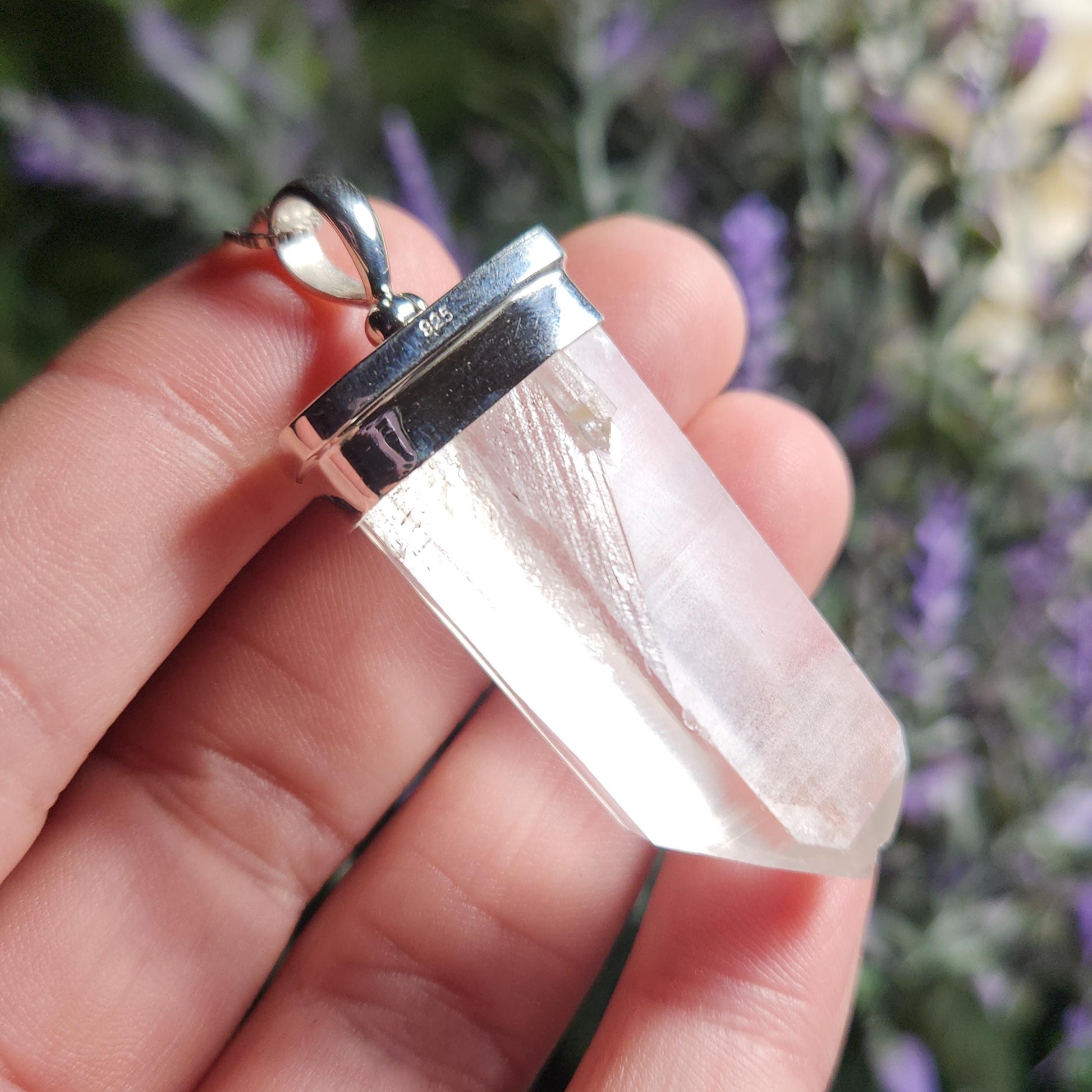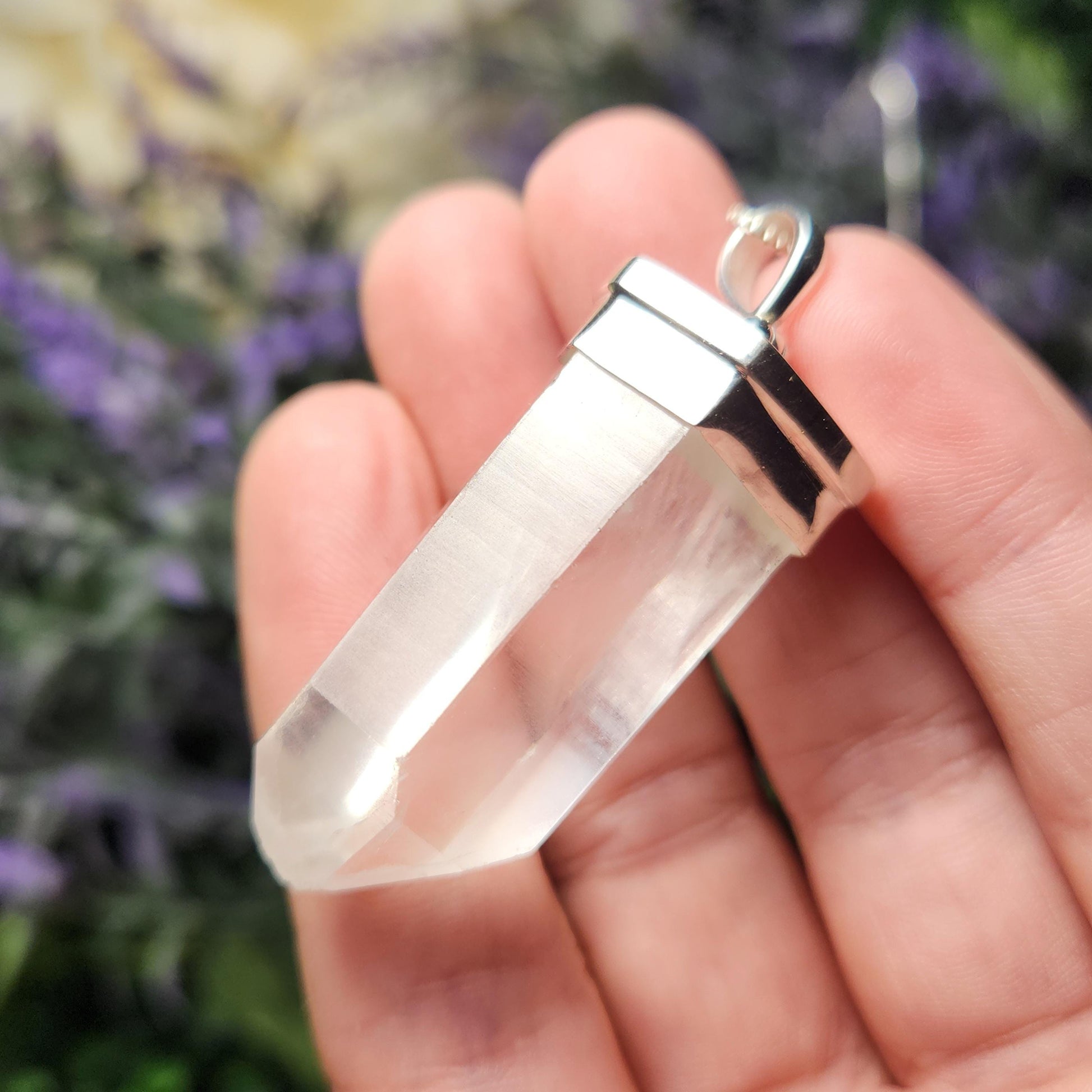 This naturally terminated Lemurian Seed Quartz crystal from Colombia has crisp clarity and a high shine. This crystal has been custom created into a sturdy piece of jewelry using .925 Sterling Silver. This pendant measures approximately 50mm by 17mm. The silver chain used in the photos is to help envision how this pendant will look while adorned but is not included in the listing.