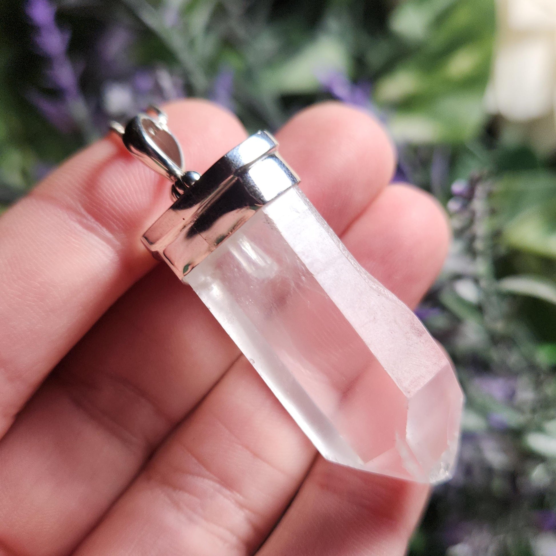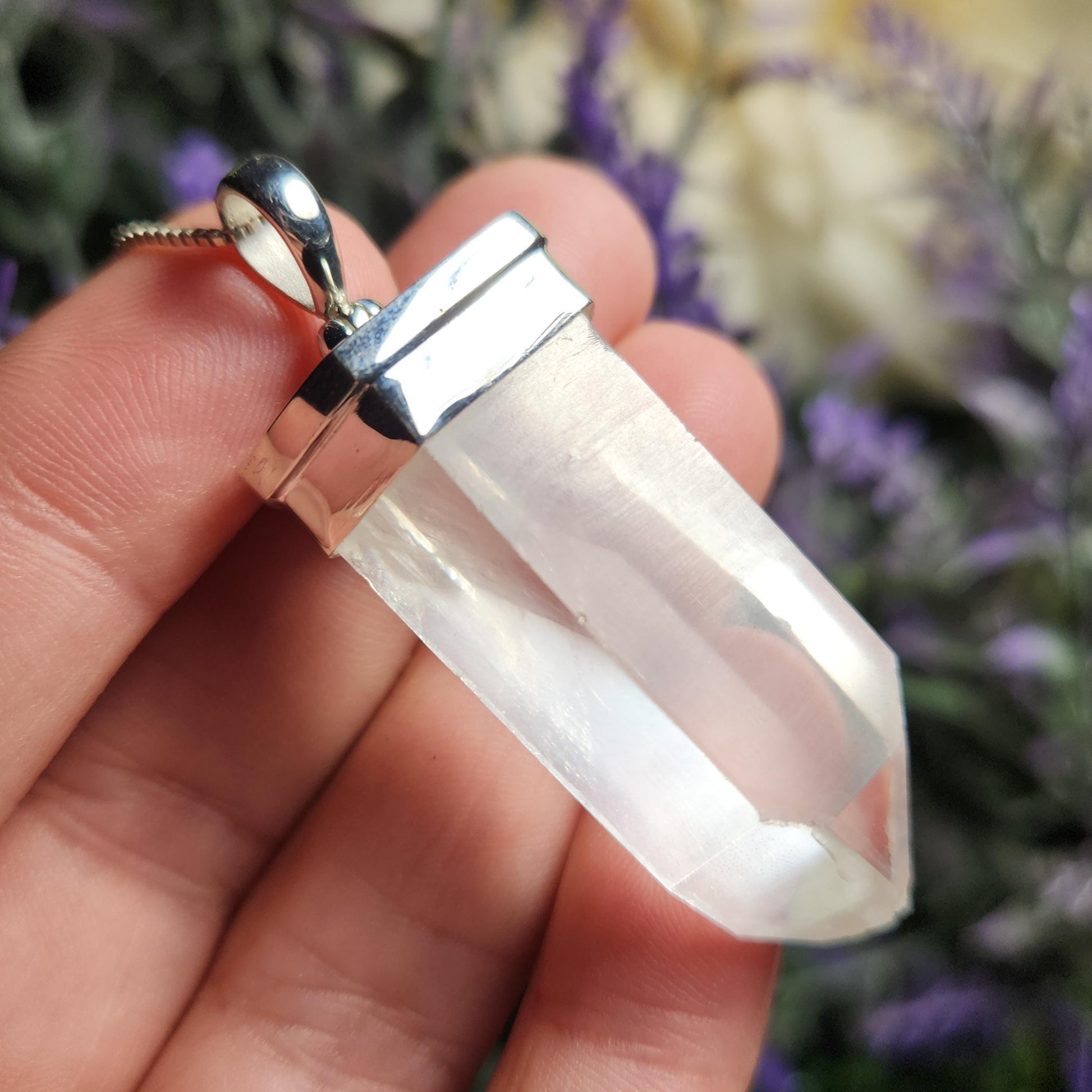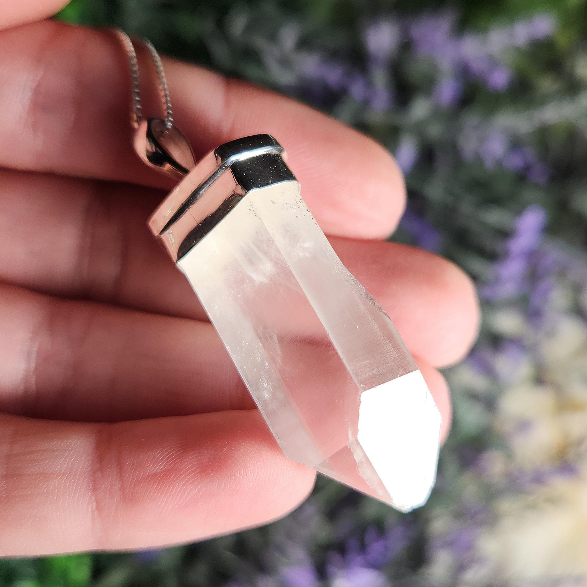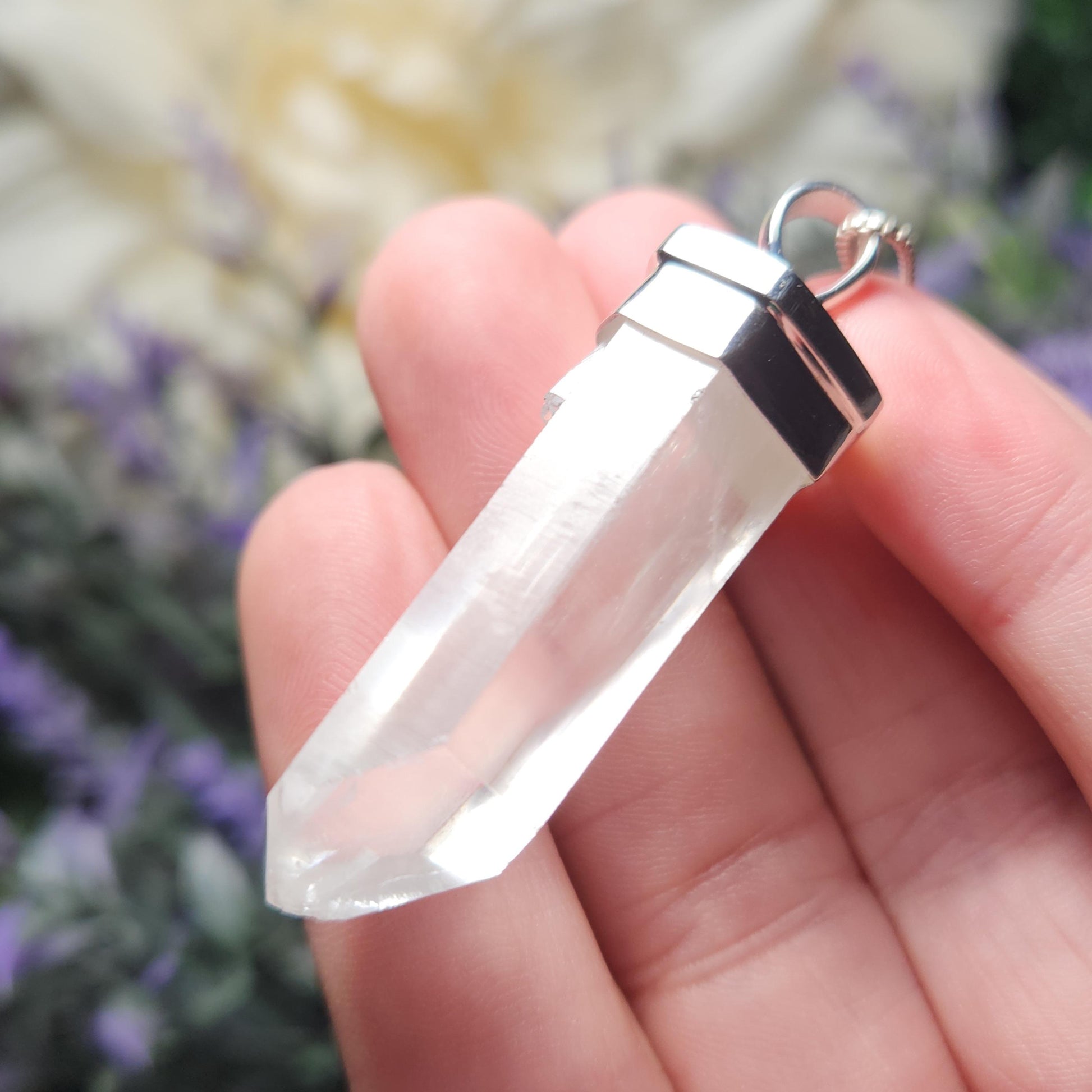 This naturally terminated Lemurian Seed Quartz crystal from Colombia has crisp clarity and a high shine. This crystal has been custom created into a sturdy piece of jewelry using .925 Sterling Silver. This pendant measures approximately 50mm by 17mm. The silver chain used in the photos is to help envision how this pendant will look while adorned but is not included in the listing.