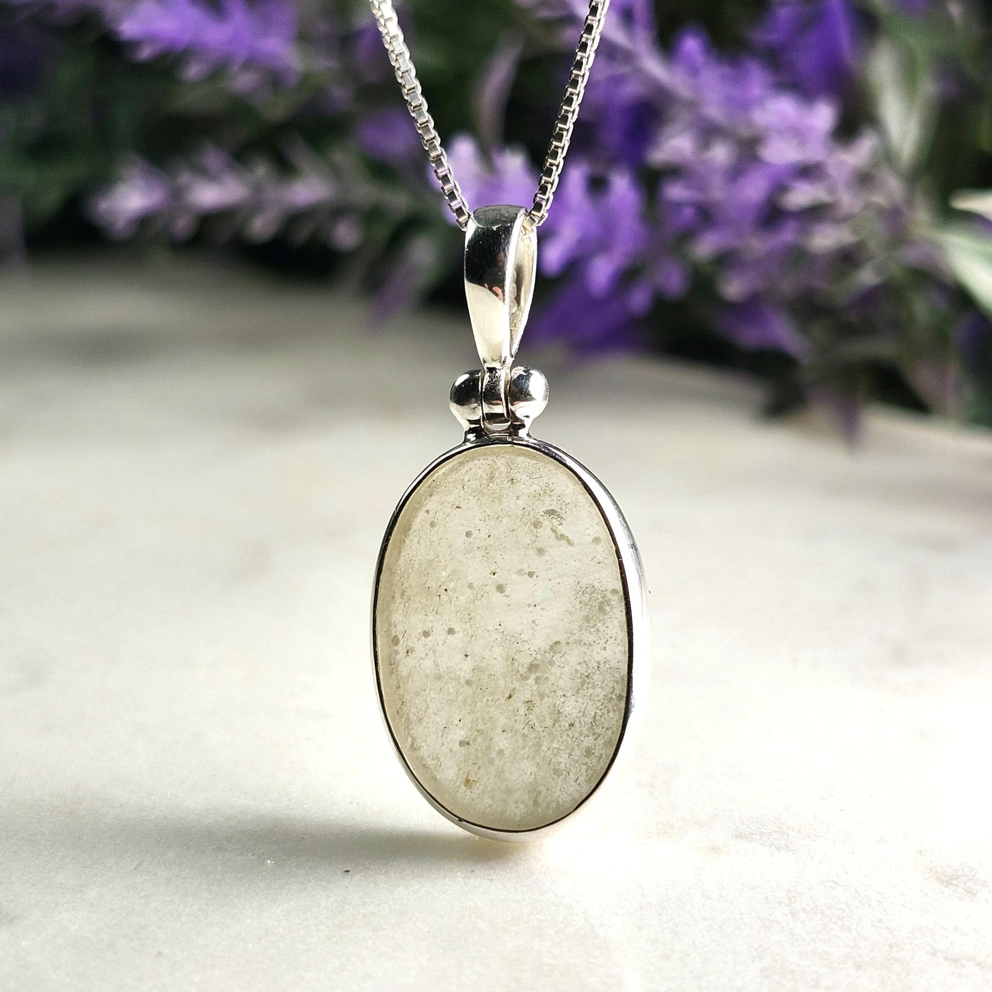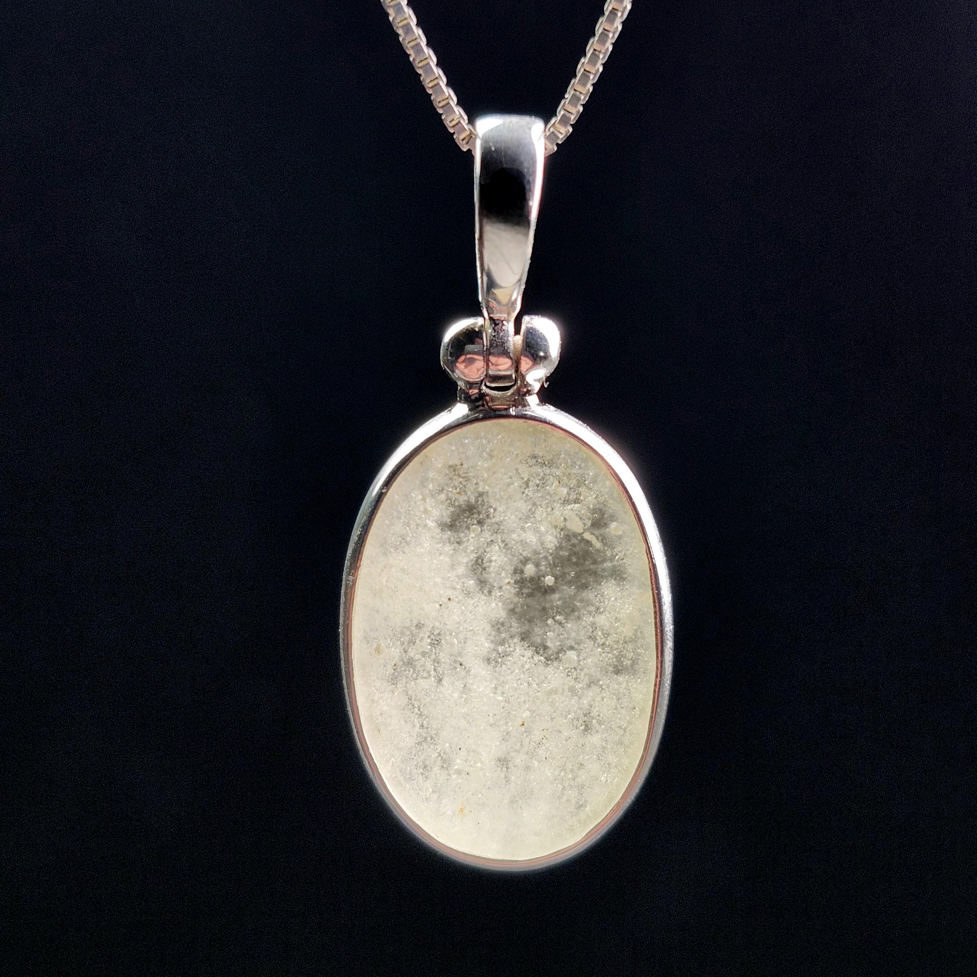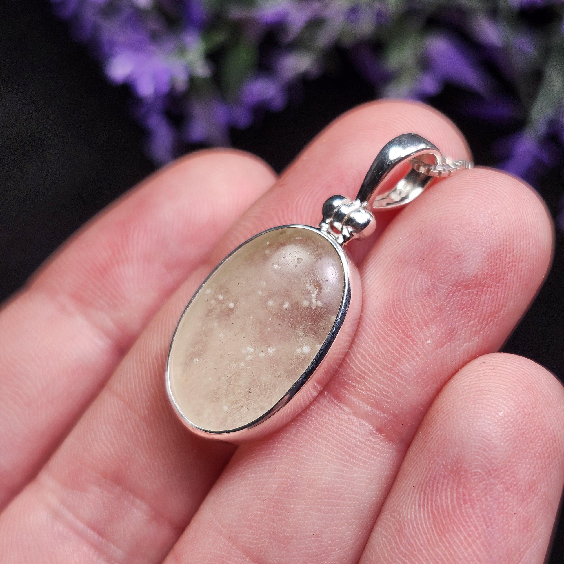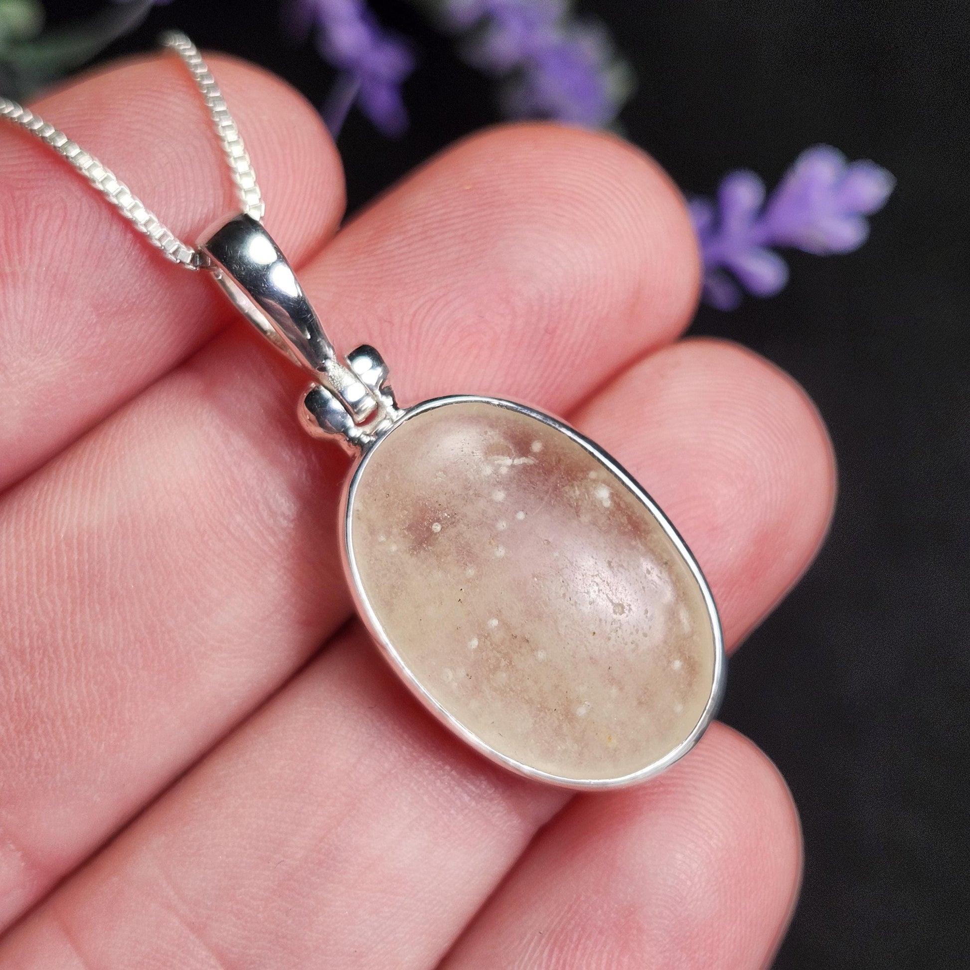 This polished Libyan Desert Glass cabochon displays a light golden coloring with a cloudy translucence. This tektite has been custom created into a sturdy piece of jewelry using .925 Sterling Silver. This pendant measures approximately 31mm by 13mm. The silver chain used in the photos is to help envision how this pendant will look while adorned but is not included in the listing.