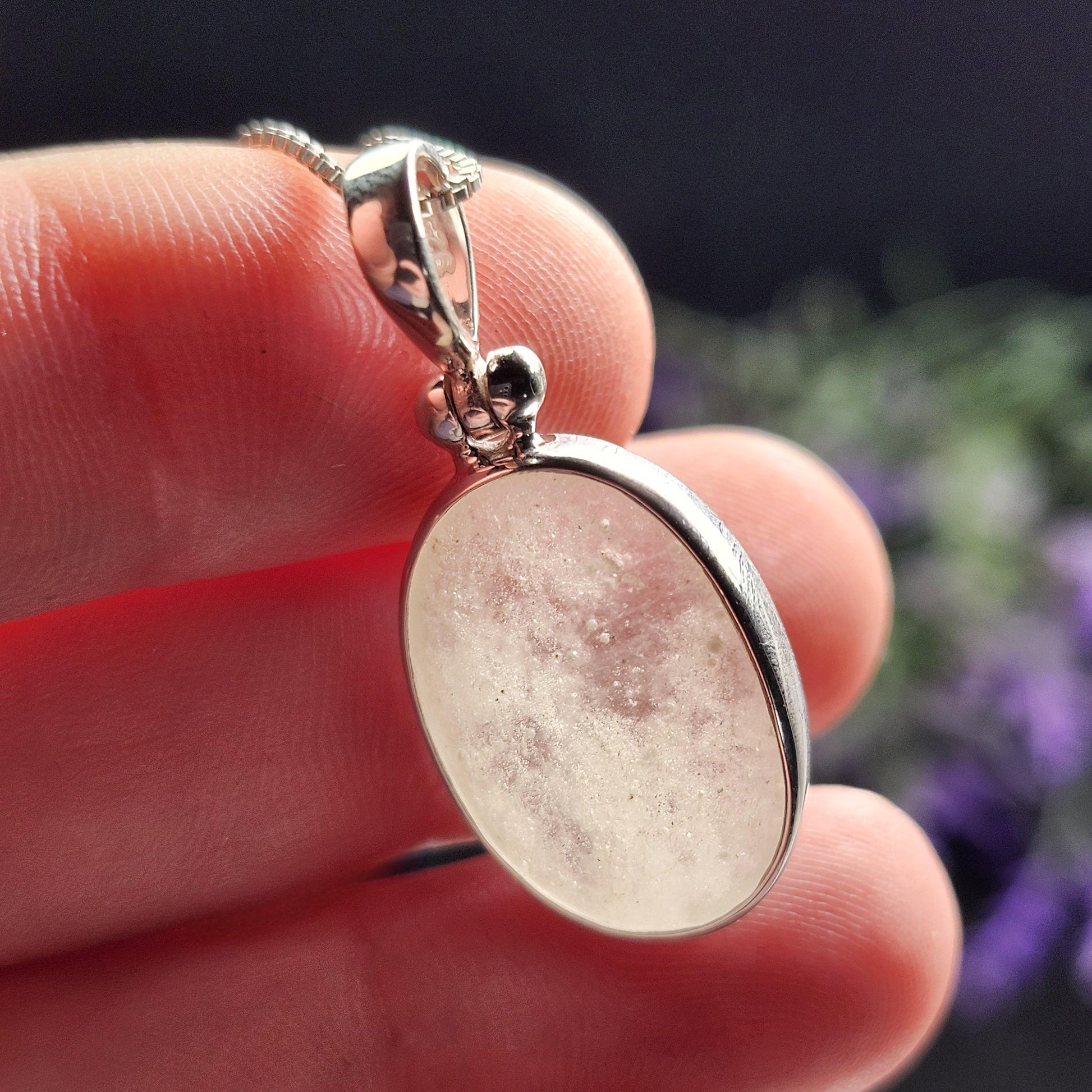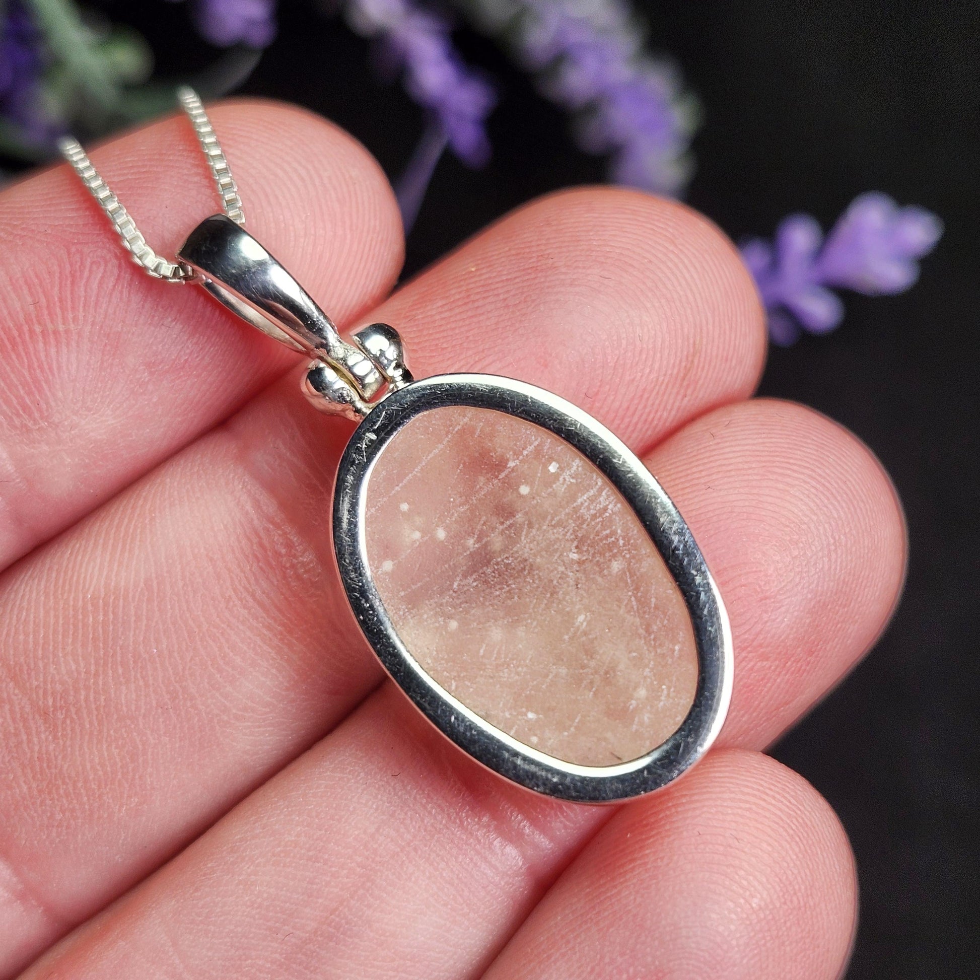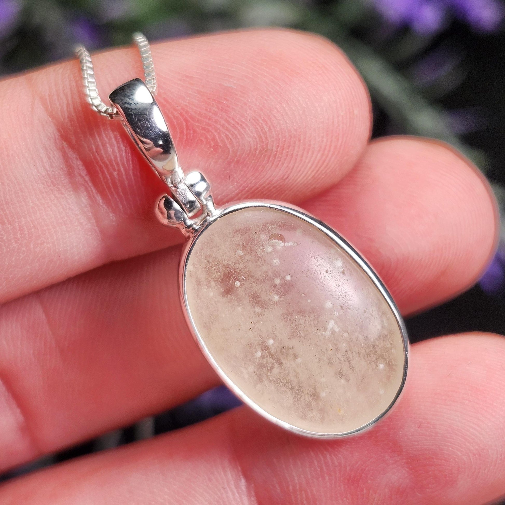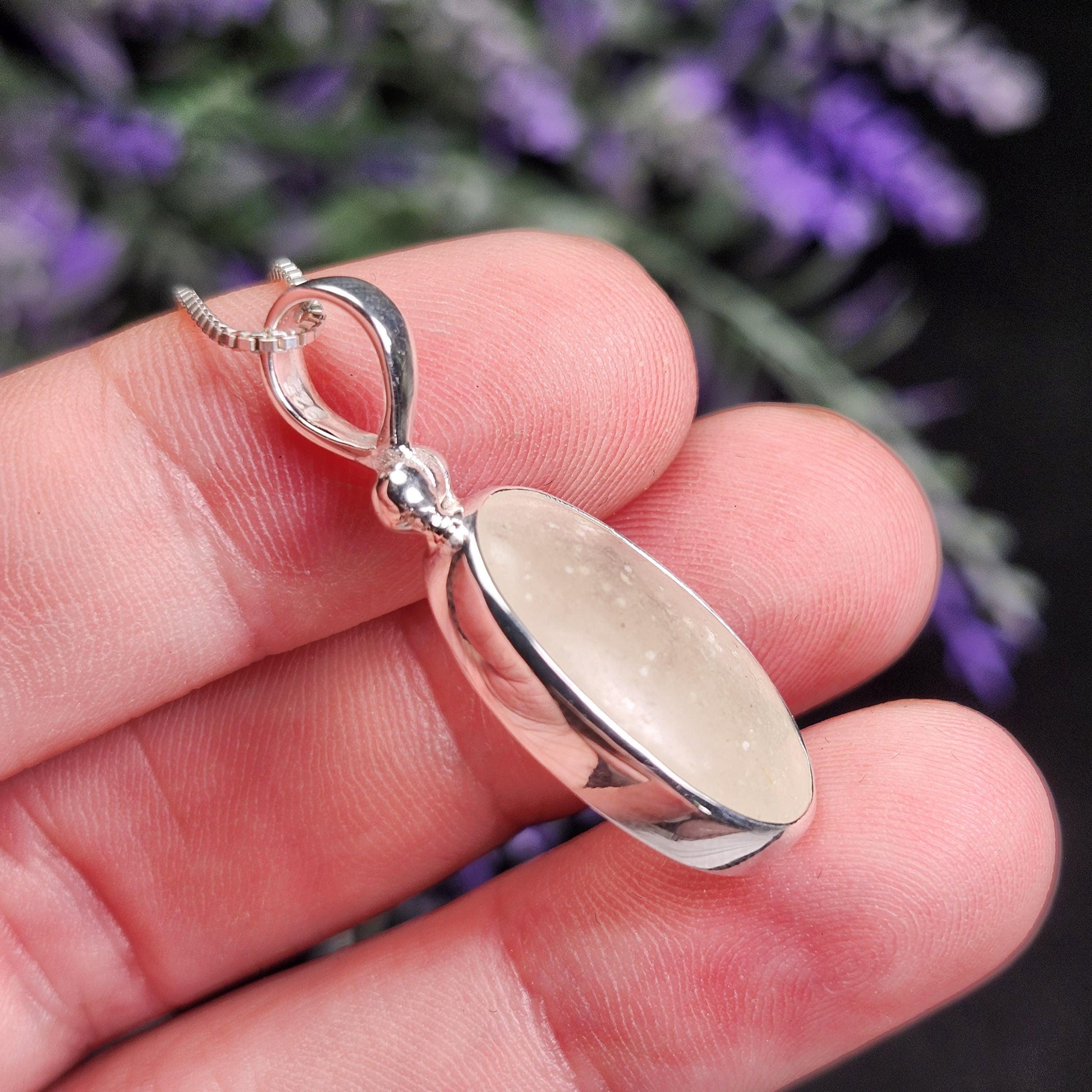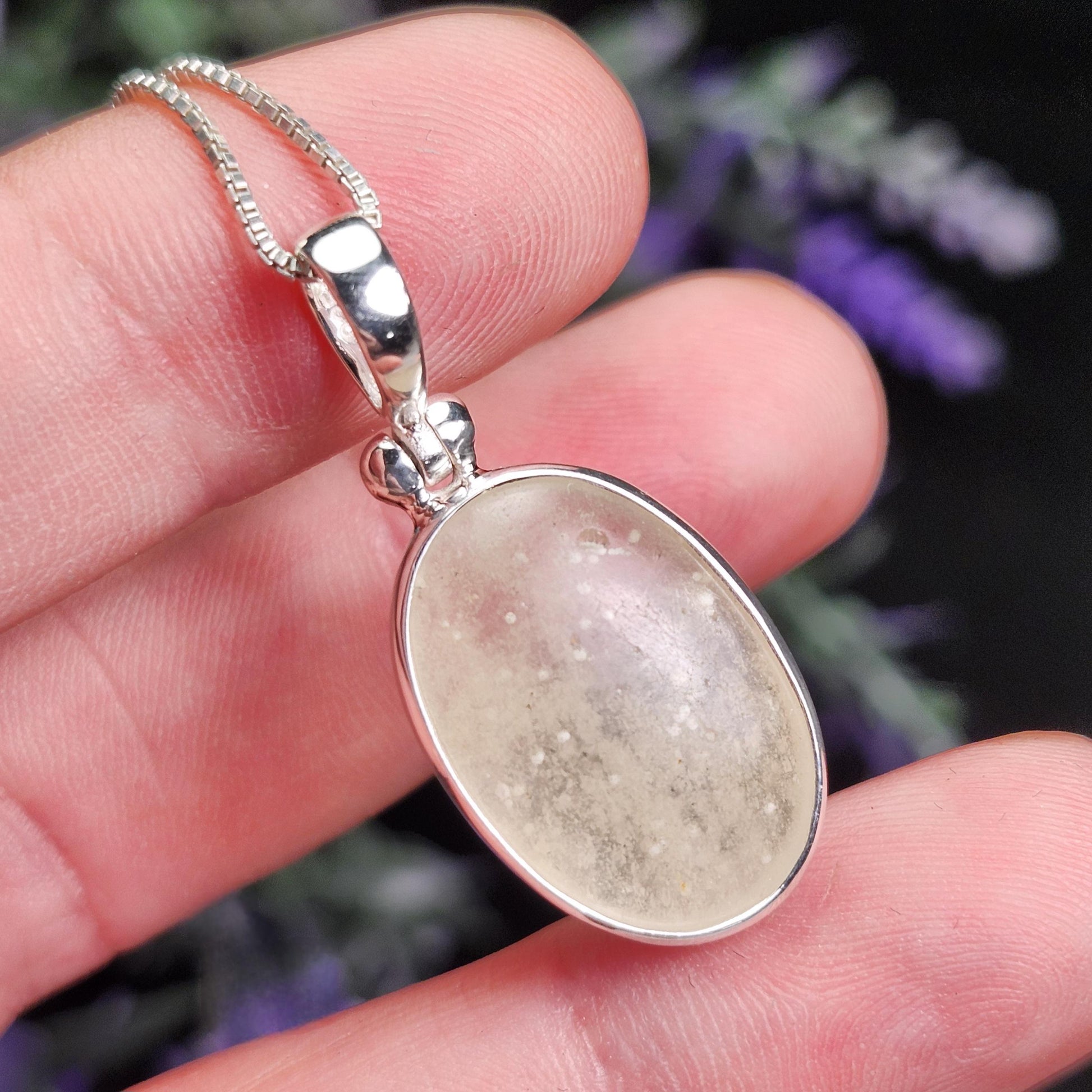 This polished Libyan Desert Glass cabochon displays a light golden coloring with a cloudy translucence. This tektite has been custom created into a sturdy piece of jewelry using .925 Sterling Silver. This pendant measures approximately 31mm by 13mm. The silver chain used in the photos is to help envision how this pendant will look while adorned but is not included in the listing.