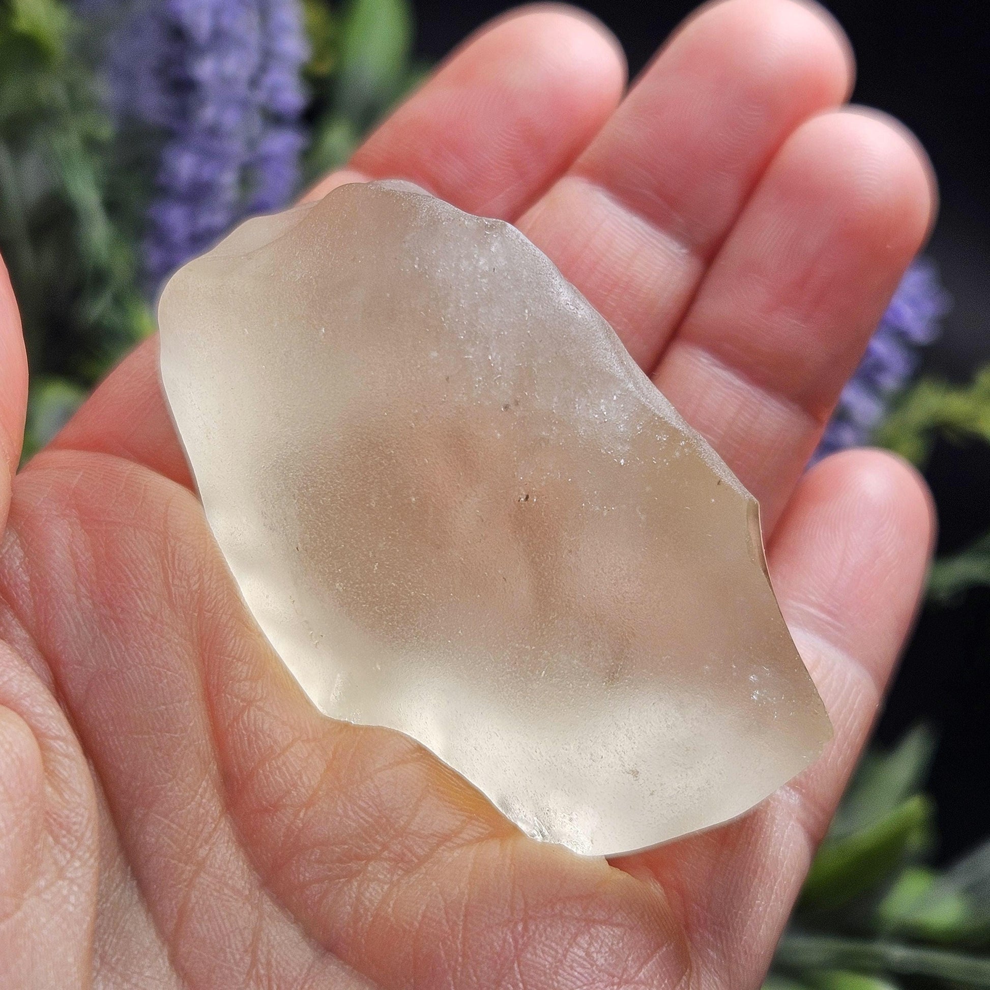 This Libyan Desert Glass is raw, exhibits classic pitting, and has a light golden coloring that illuminates with a bright translucence when backlit. It contains abrasions on its surface that reveal a glassy shine. This specimen measures approximately 55mm by 33mm by 24mm and weighs 57.3 grams.