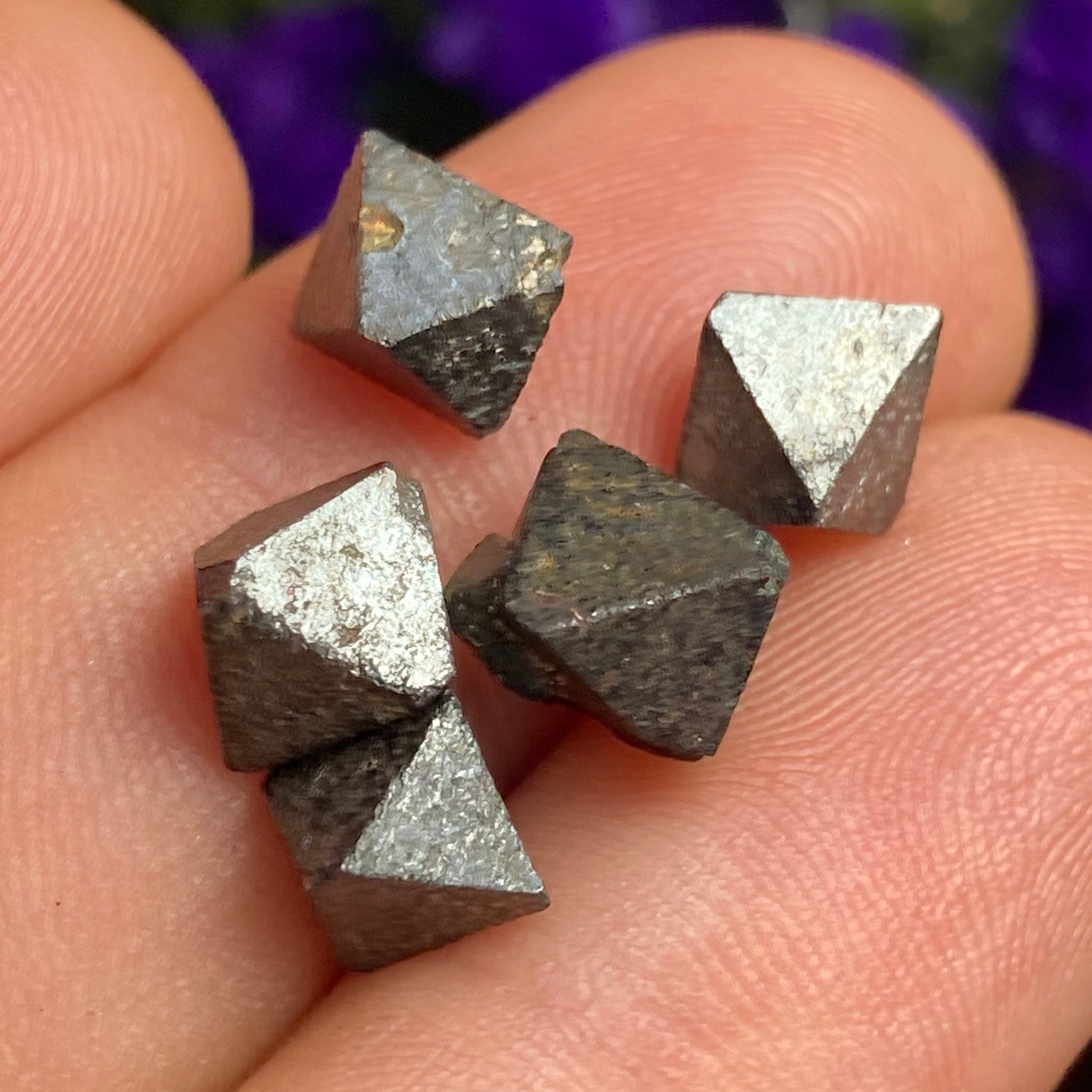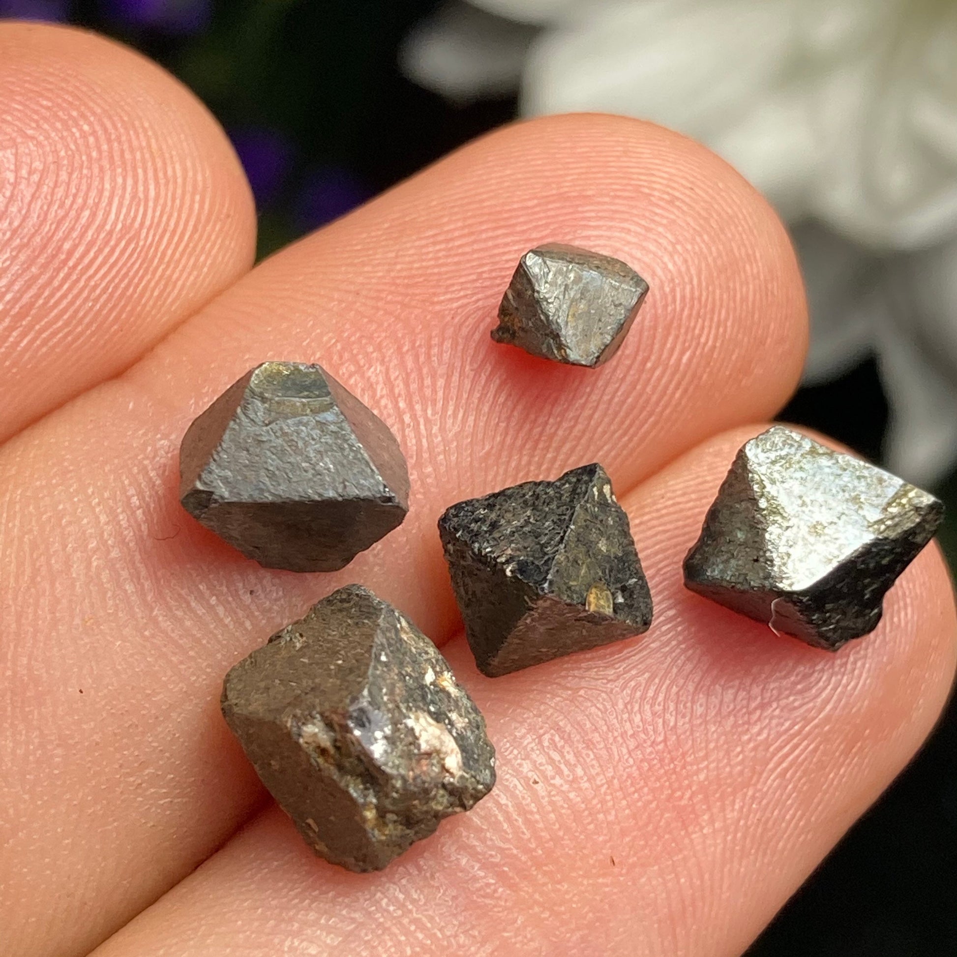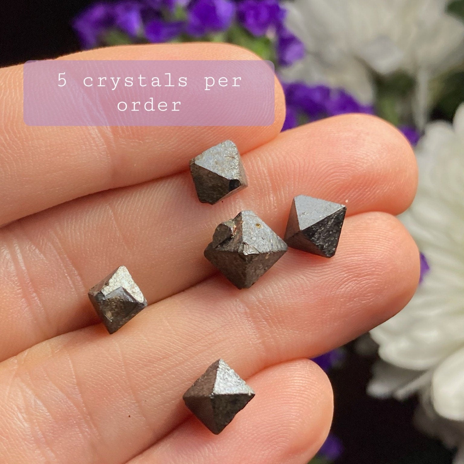 These Magnetite crystals are raw and exhibit terminations. These Magnetite crystals have a natural silver sheen and may include some light abrasions. Each specimen measures approximately 5mm.
