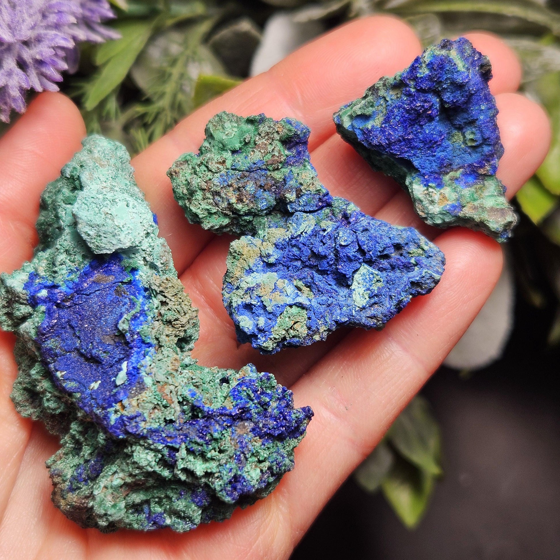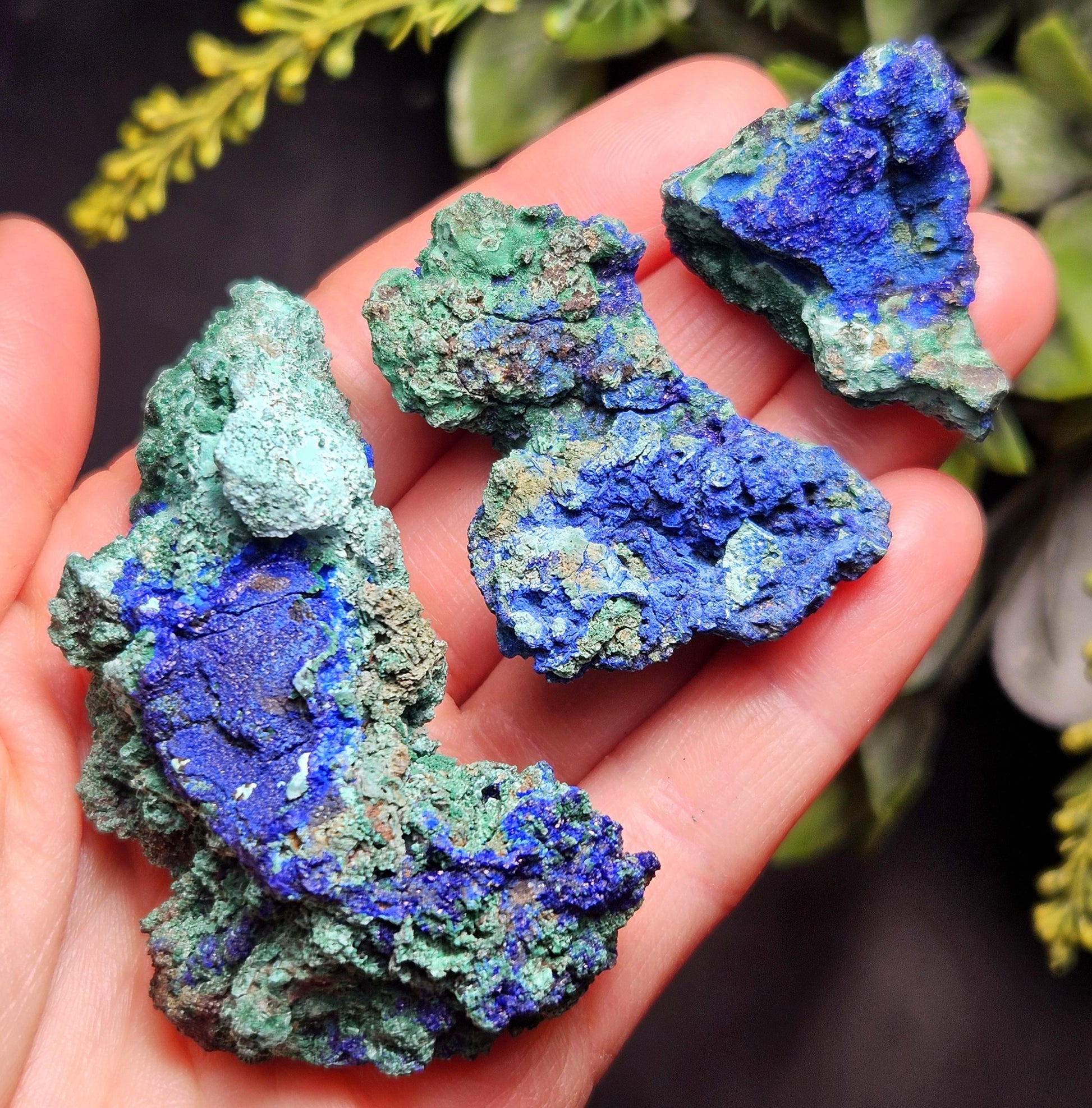 These raw, high-quality mineral specimens feature green Malachite coupled with classic blue pigmented Azurite. With freeform shapes, stark color contrast, and sparkling crystallization, each piece is completely unique.
