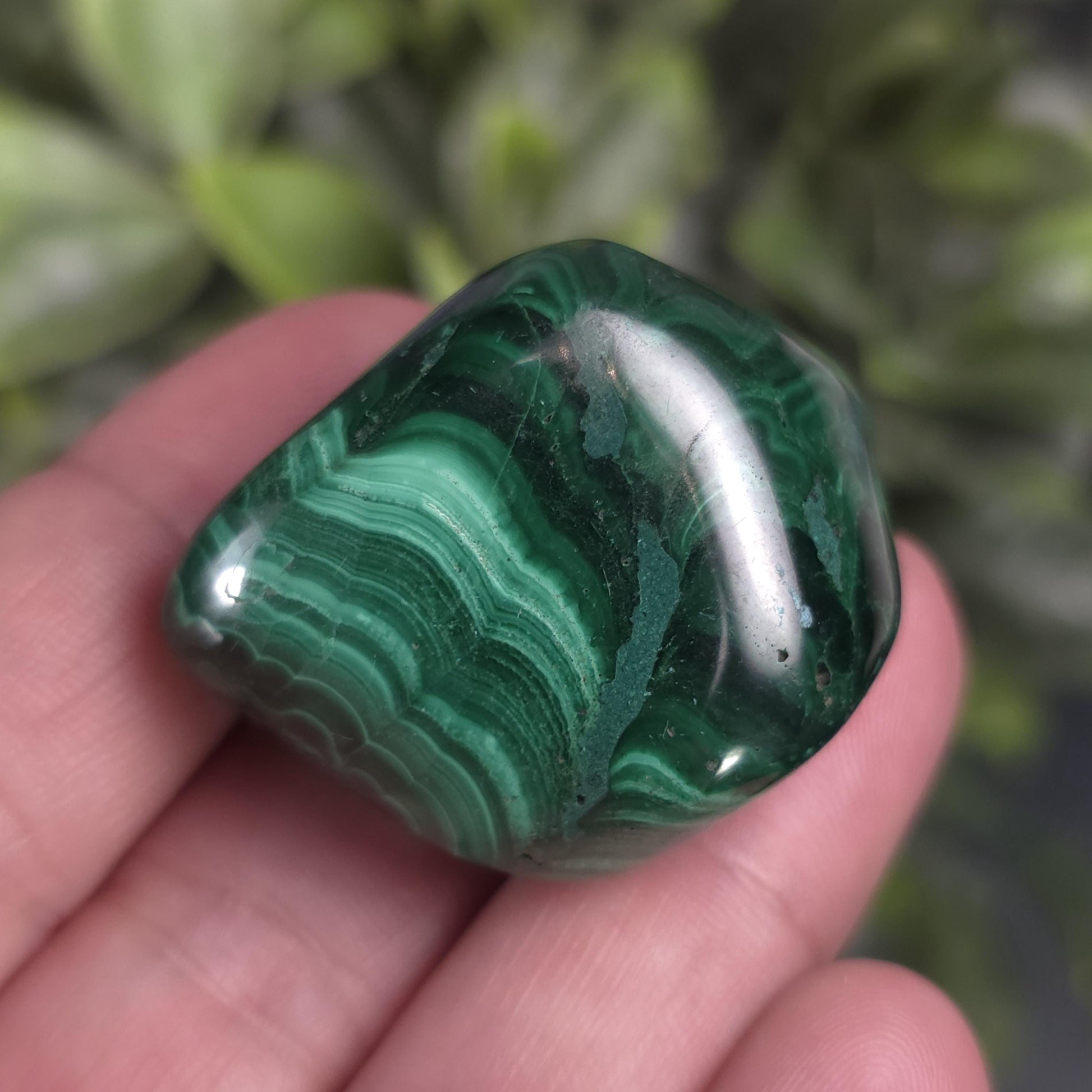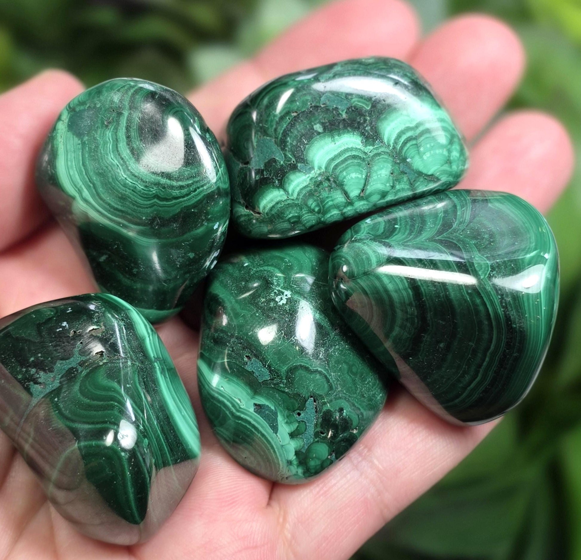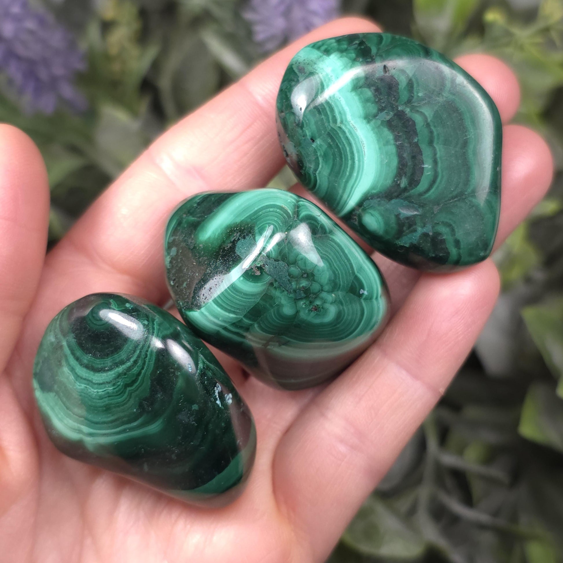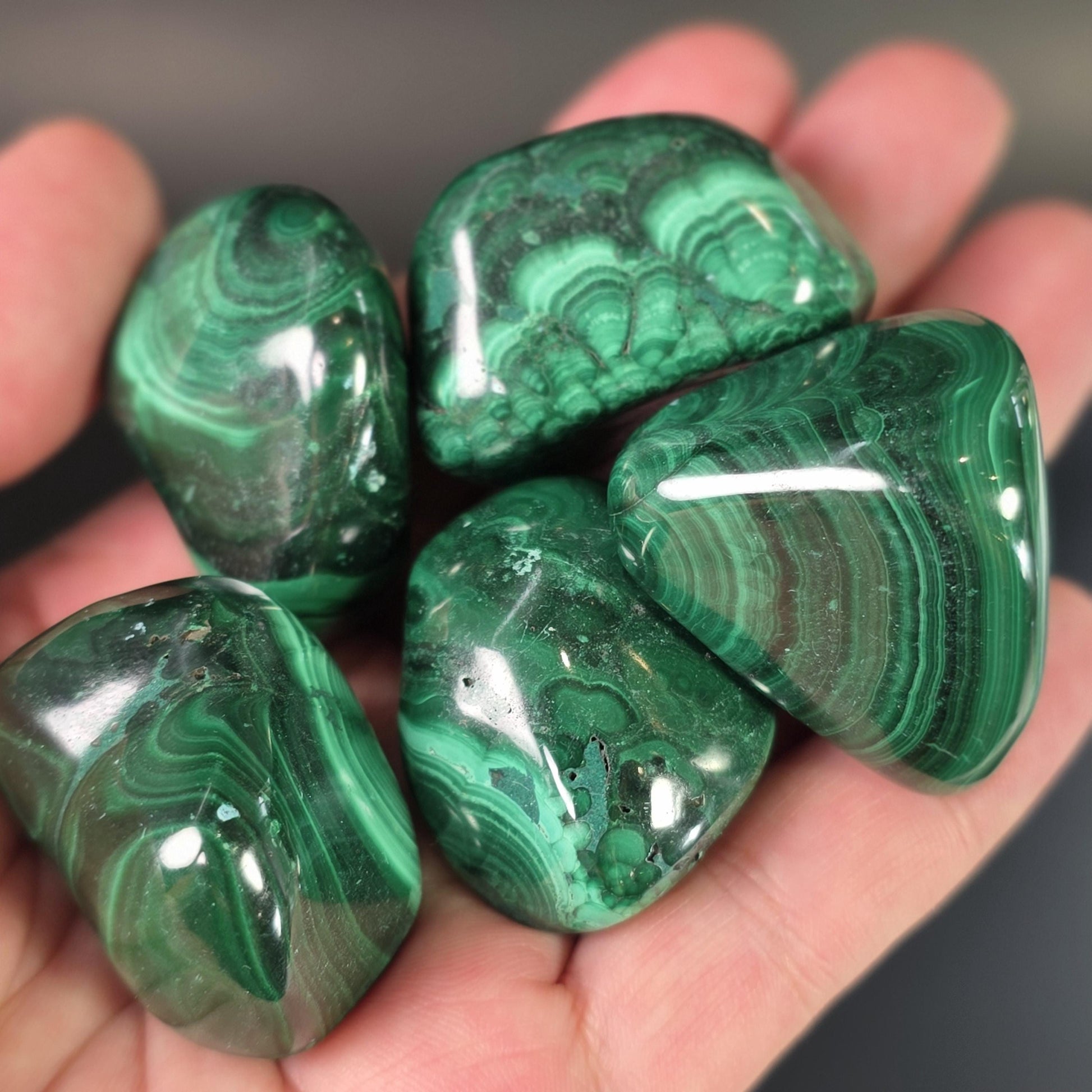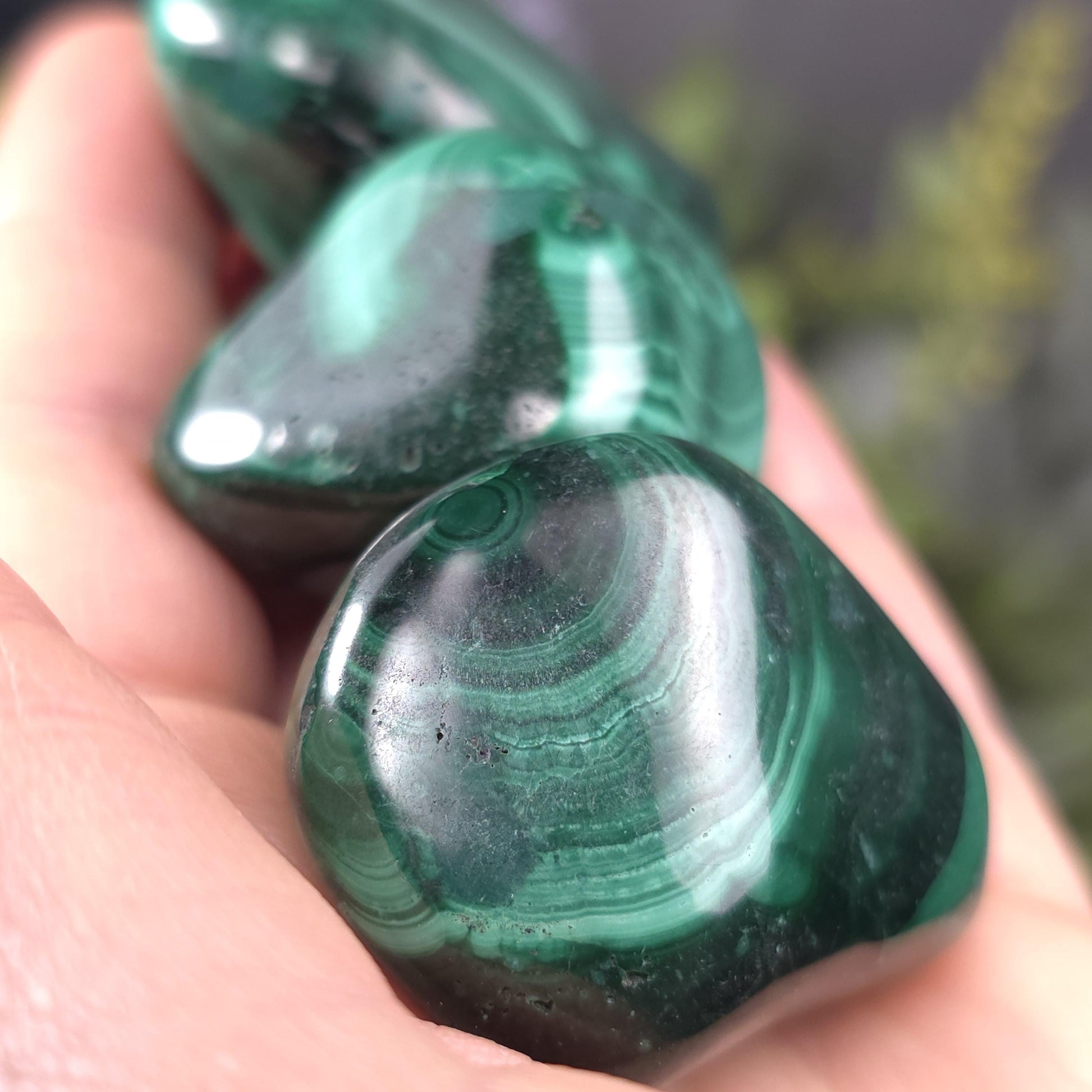 These tumbled Malachite stones have a range of green hues and concentric patterns that are classic to this African material. These polished specimens have smooth freeform shapes and weigh 45 grams to 55 grams each.
