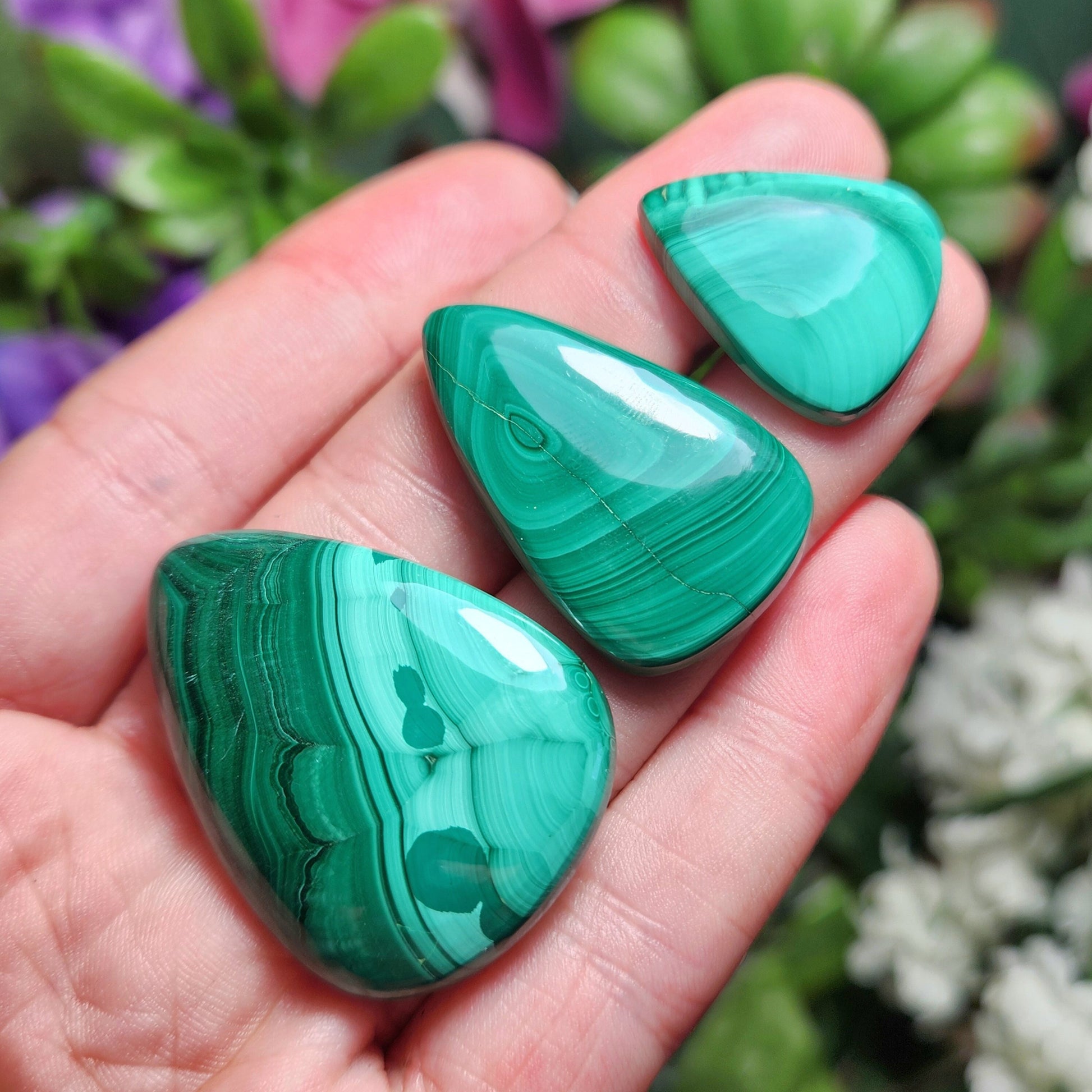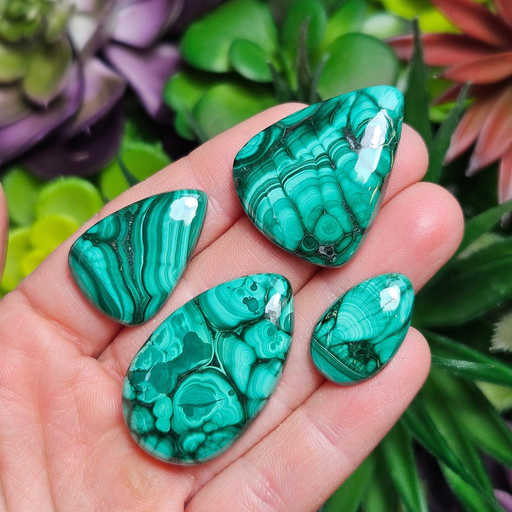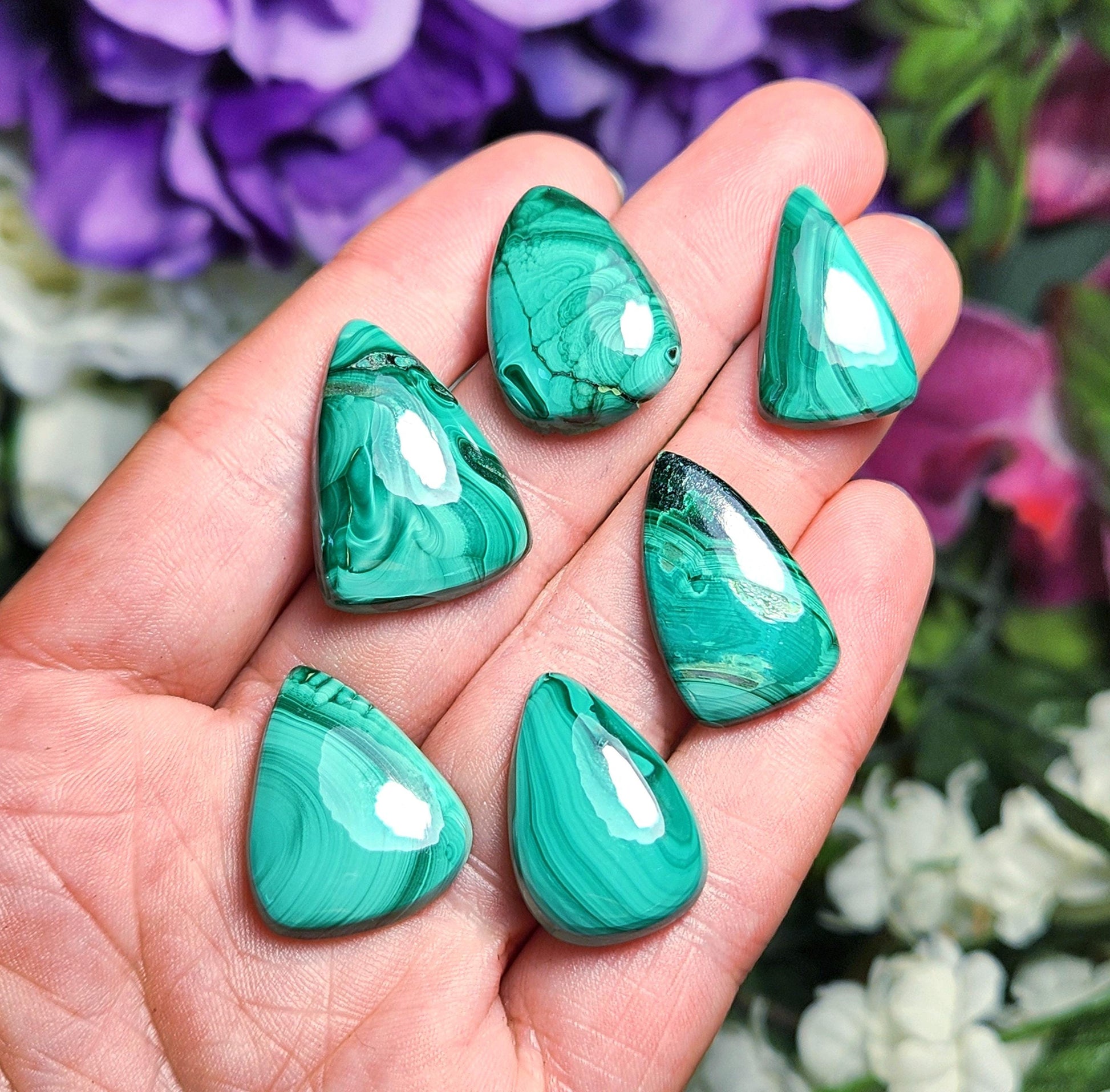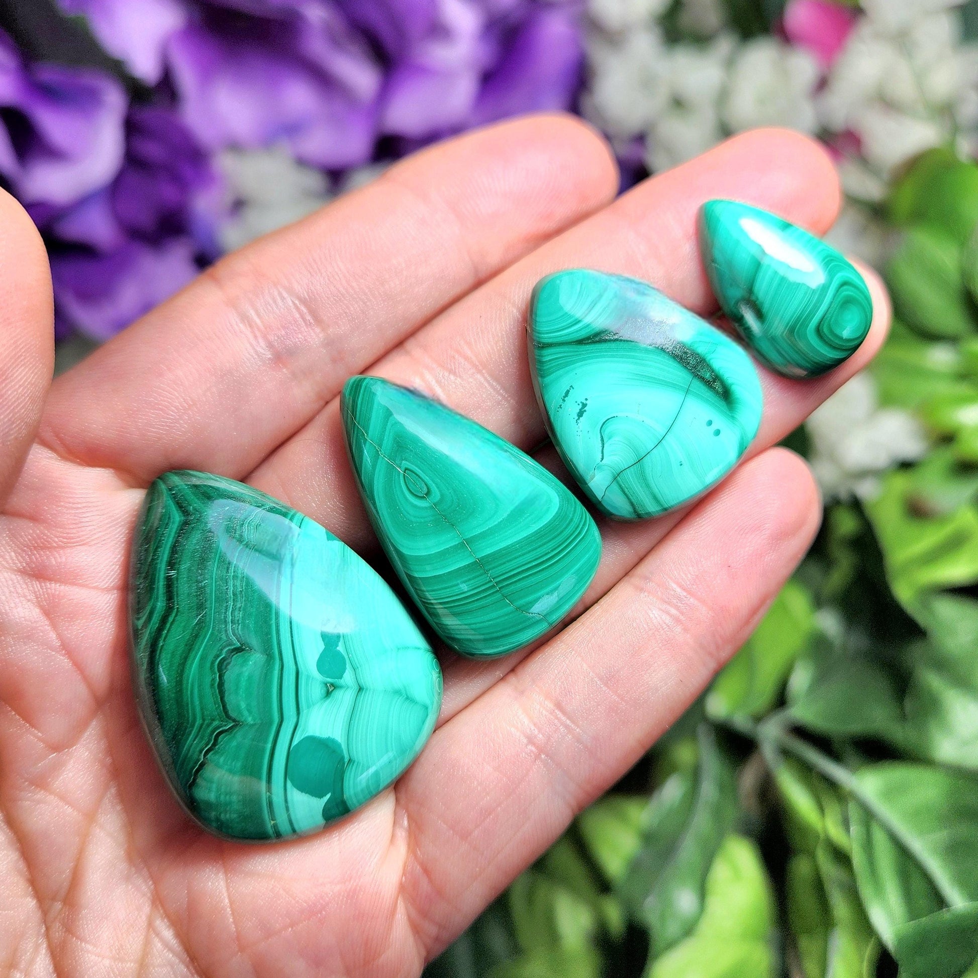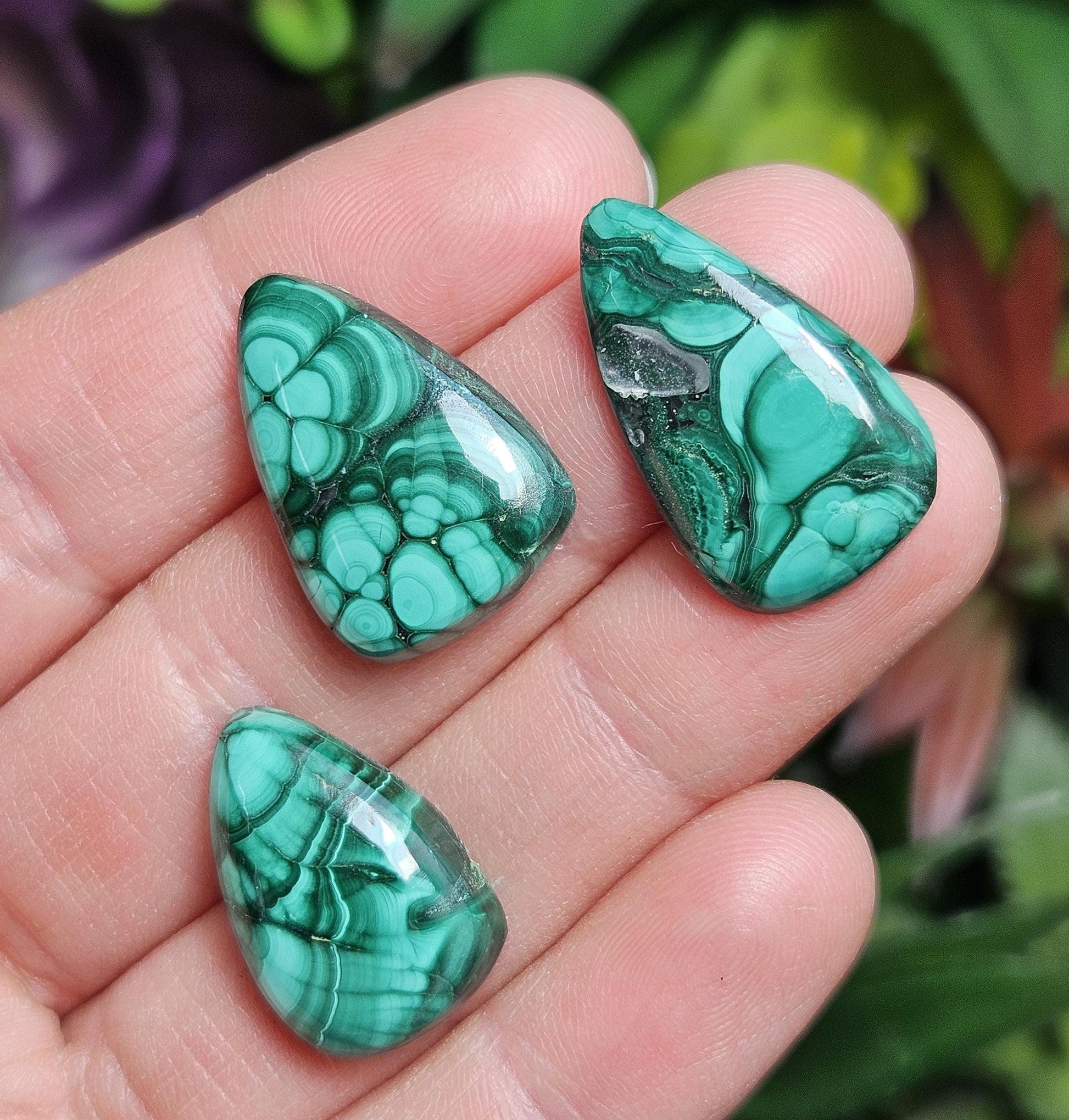 These Malachite cabochons have a range of green hues and concentric patterns classic to this African material. Each polished cabochon has a flat back that is unpolished and may contain hints of residue from the lapidary processing. They have a range of teardrop shapes.