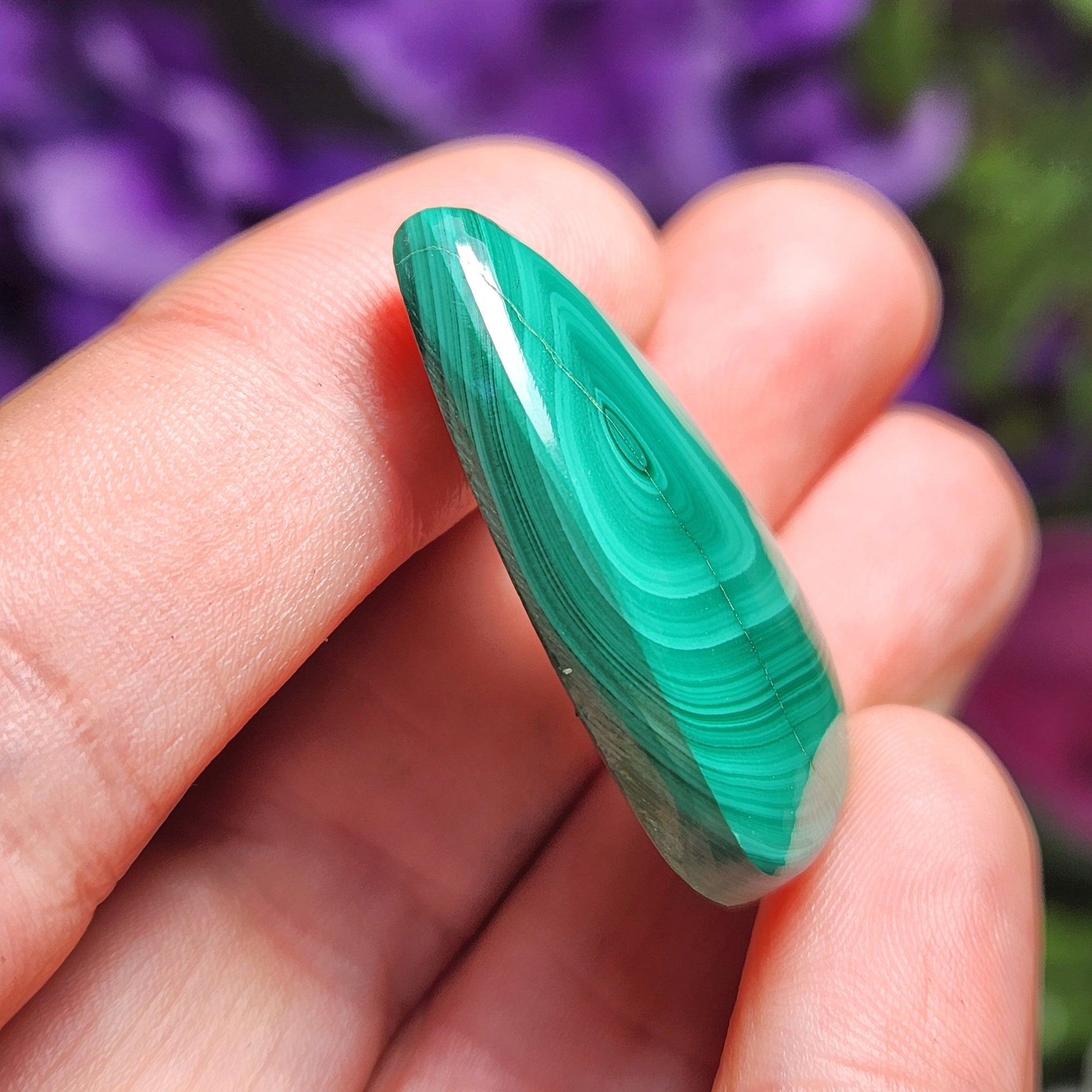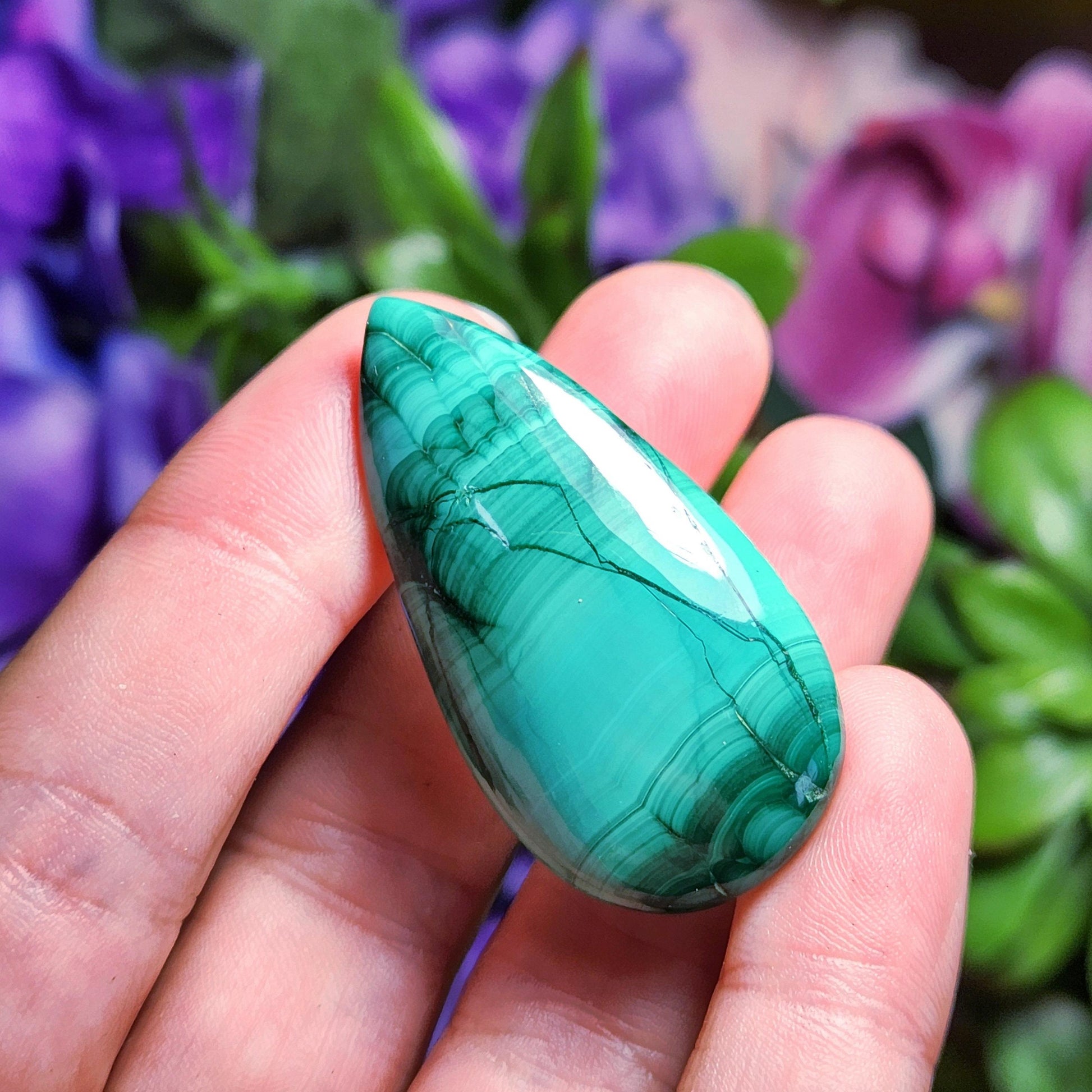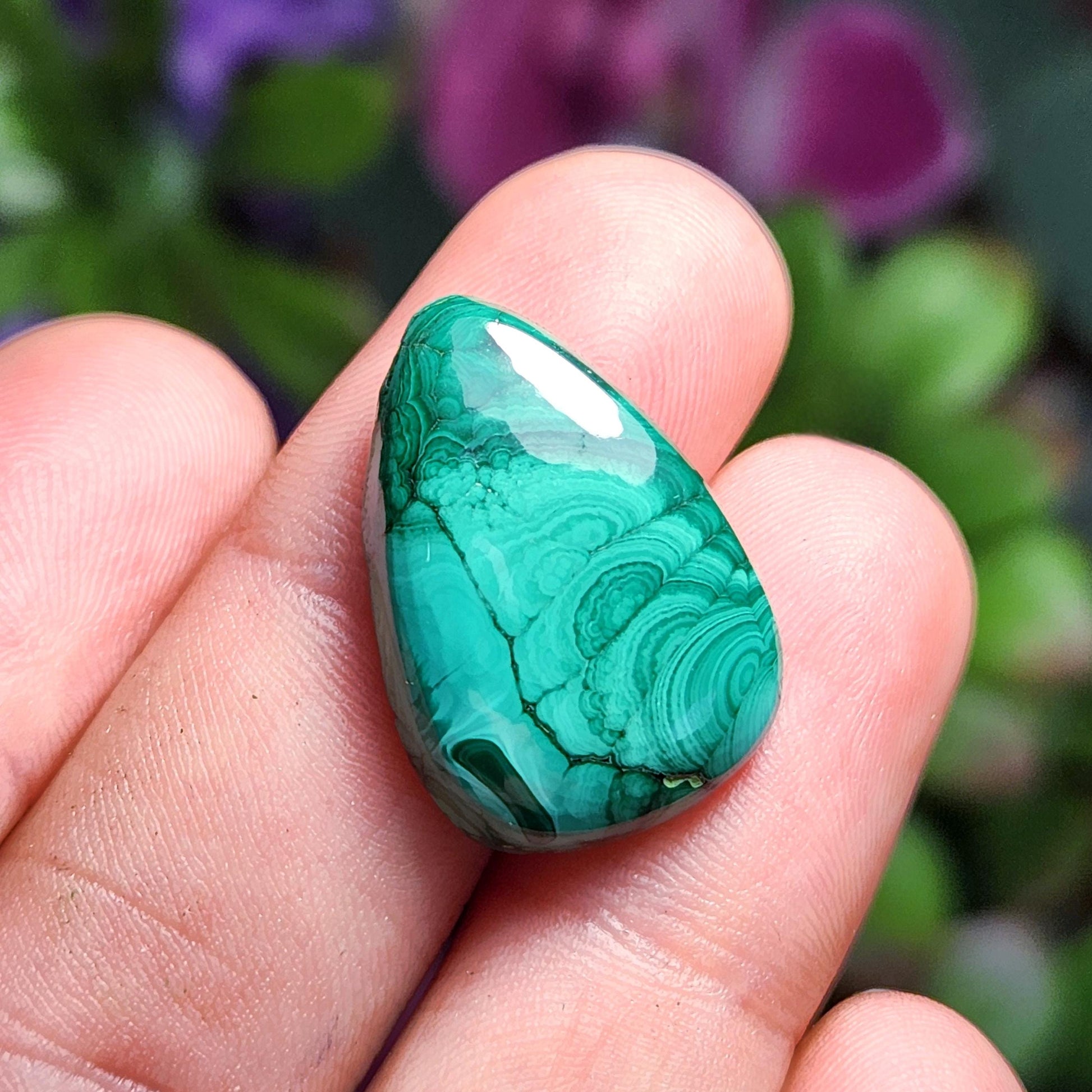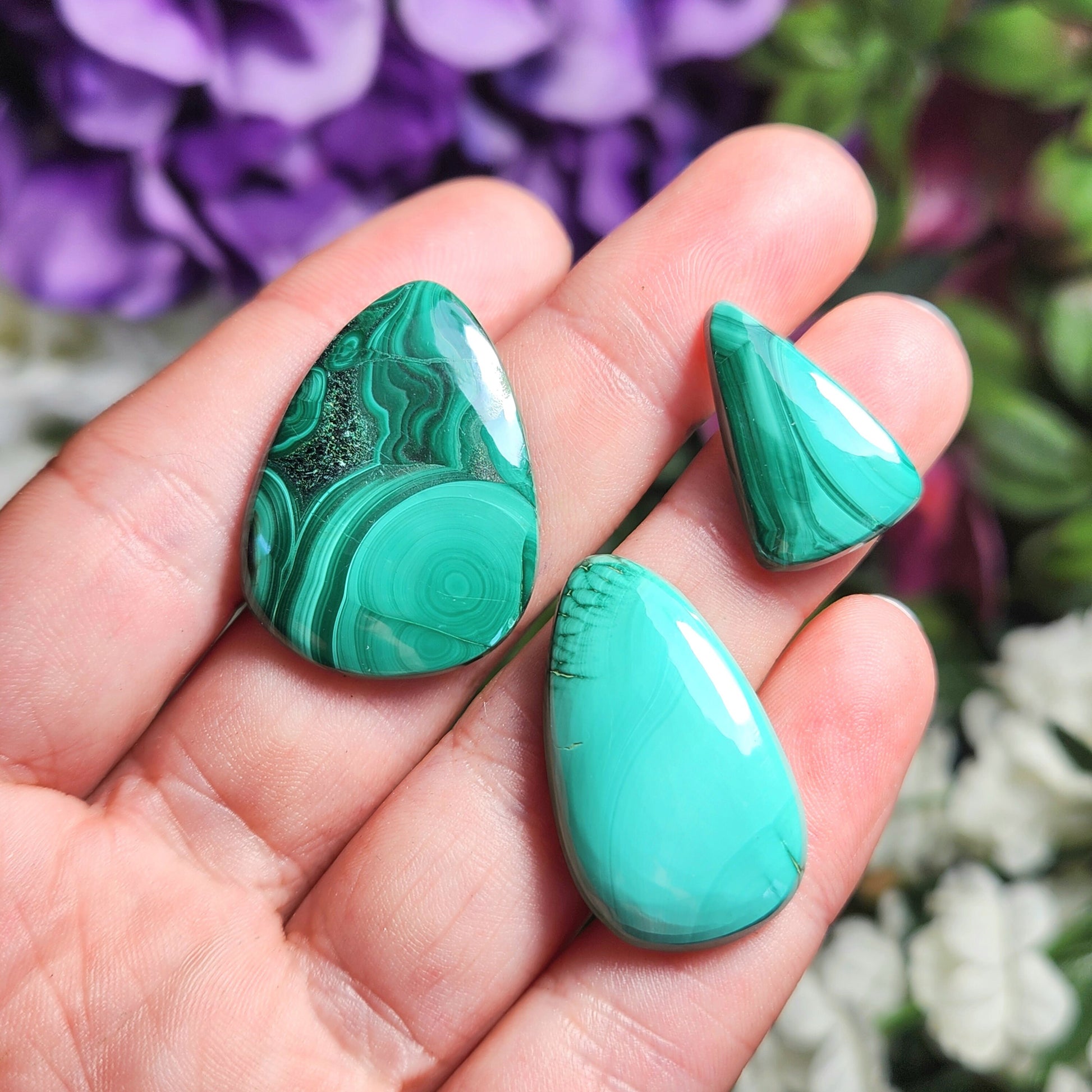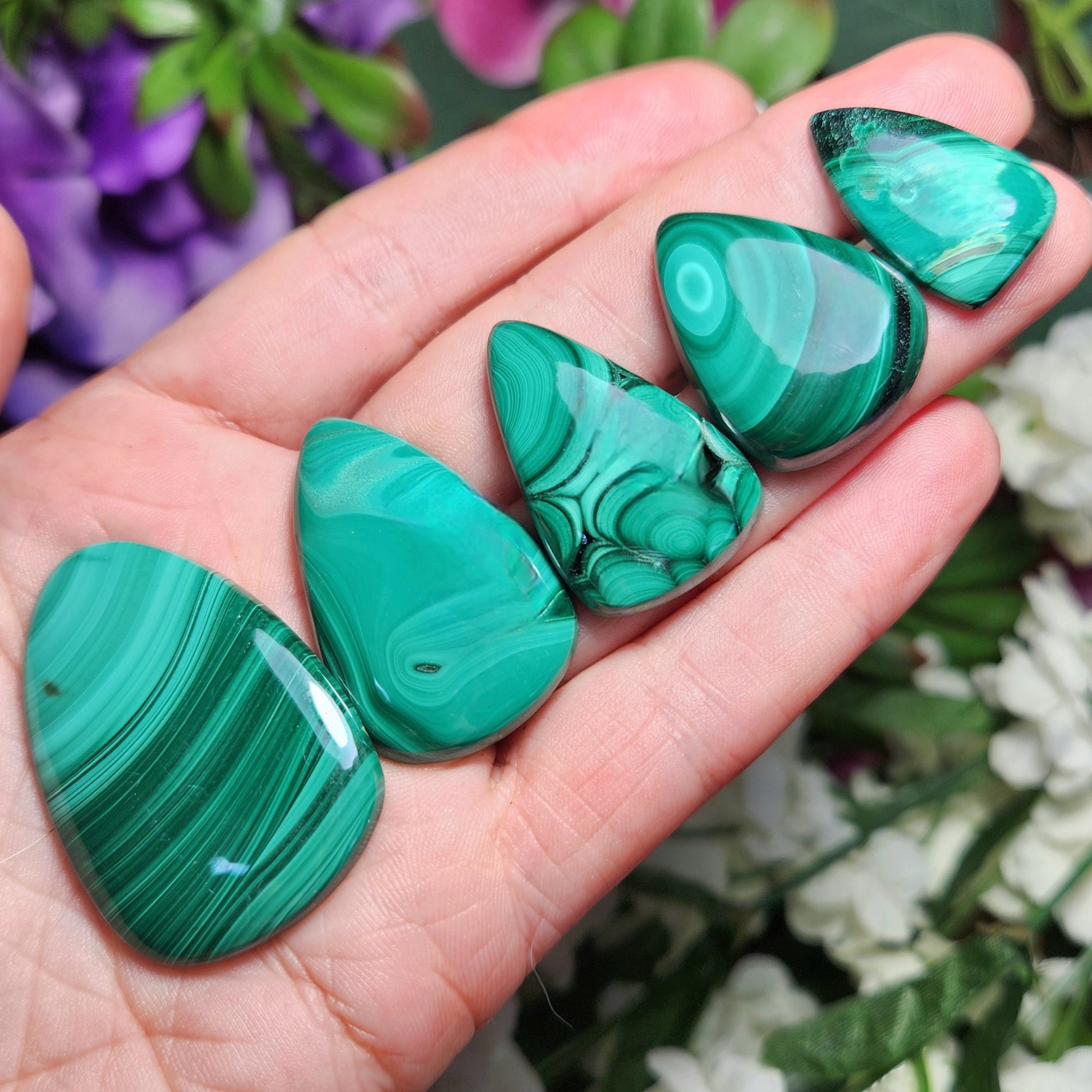 These Malachite cabochons have a range of green hues and concentric patterns classic to this African material. Each polished cabochon has a flat back that is unpolished and may contain hints of residue from the lapidary processing. They have a range of teardrop shapes.