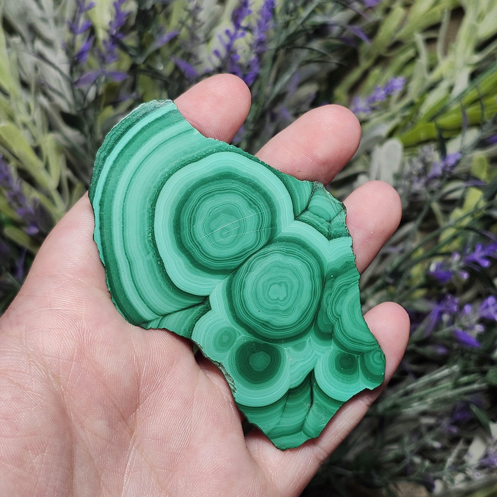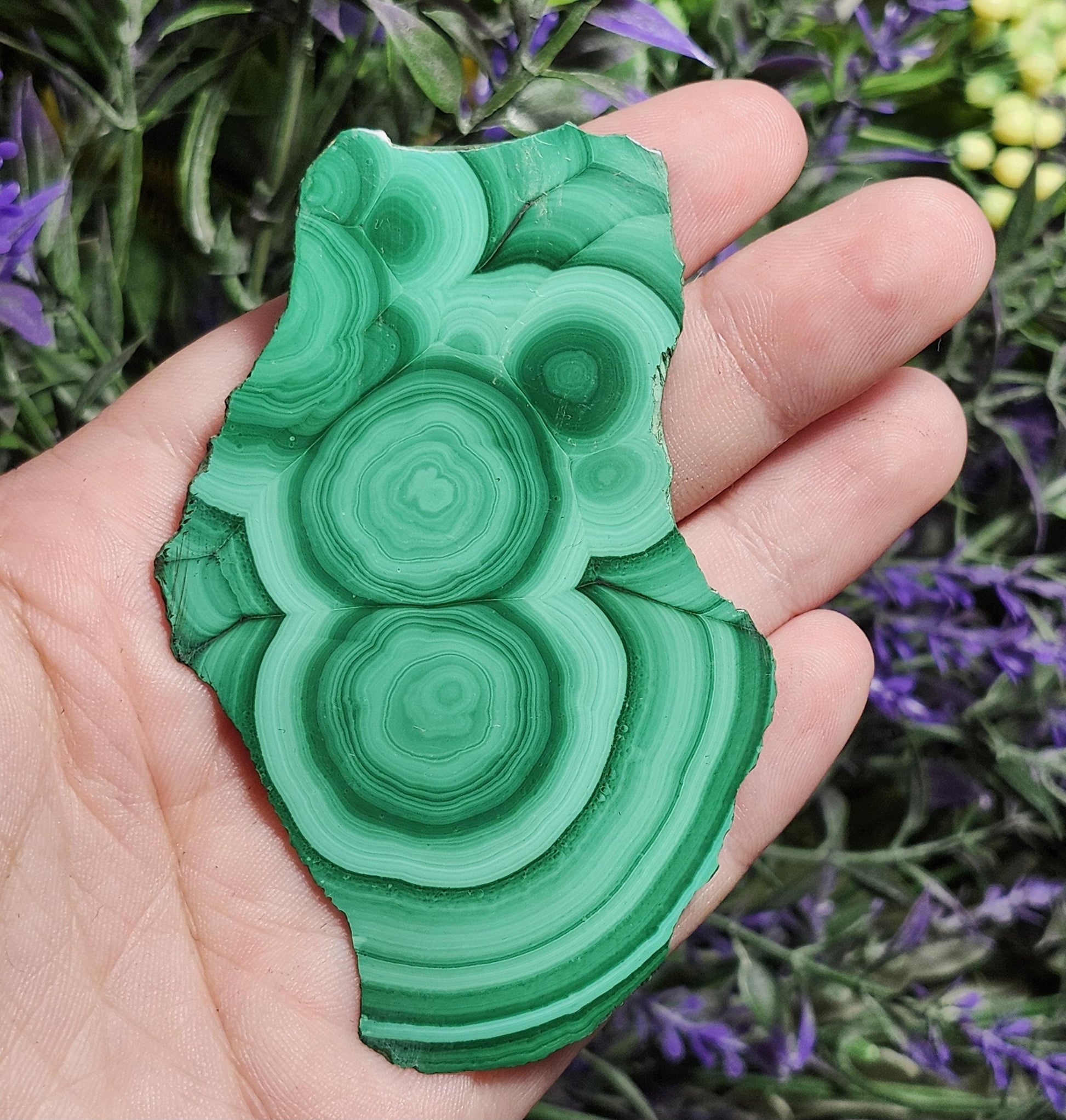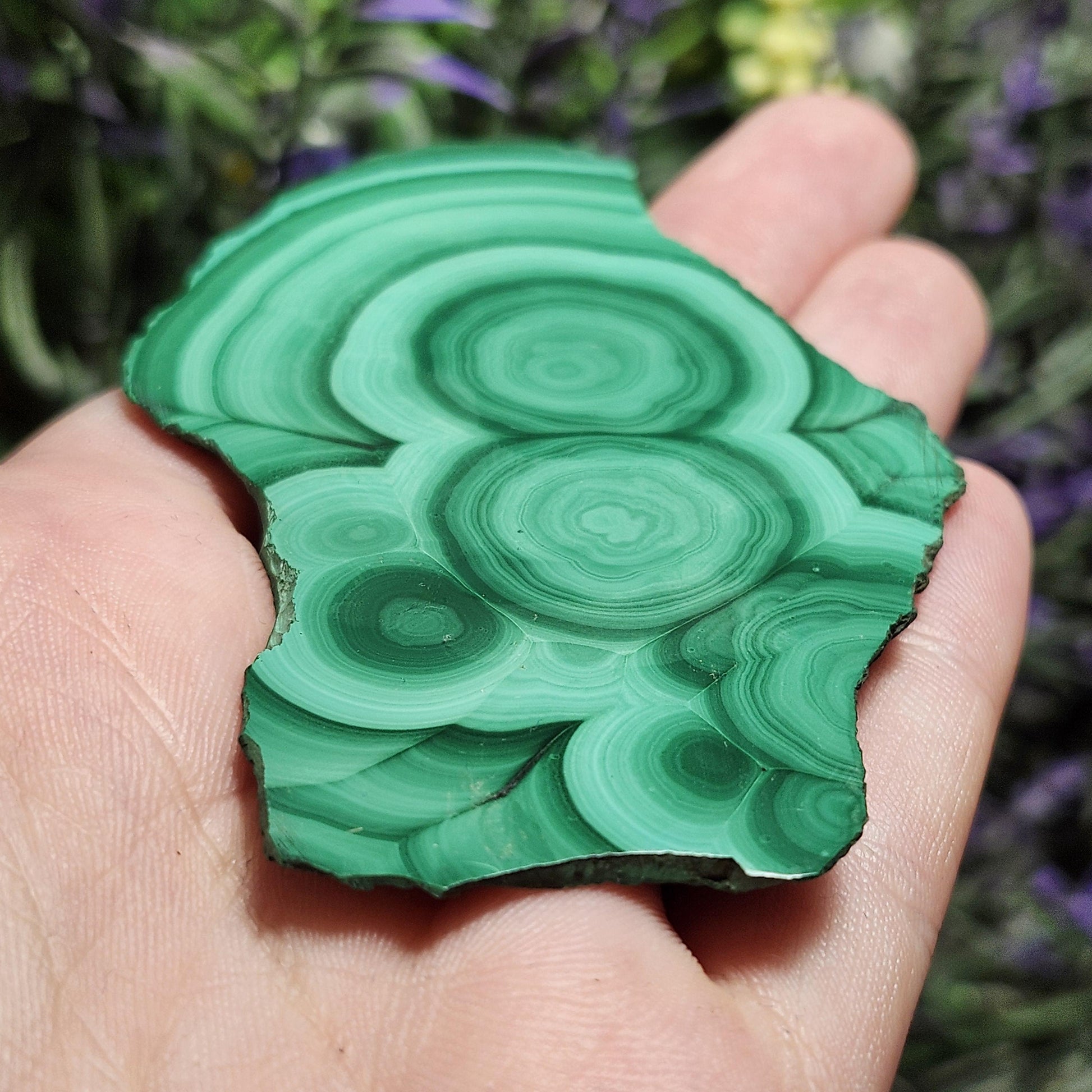 This Malachite crystal has been sliced and polished to a high sheen to show off its unique, concentric pattern. This specimen measures approximately 80 millimeters by 52 millimeters.