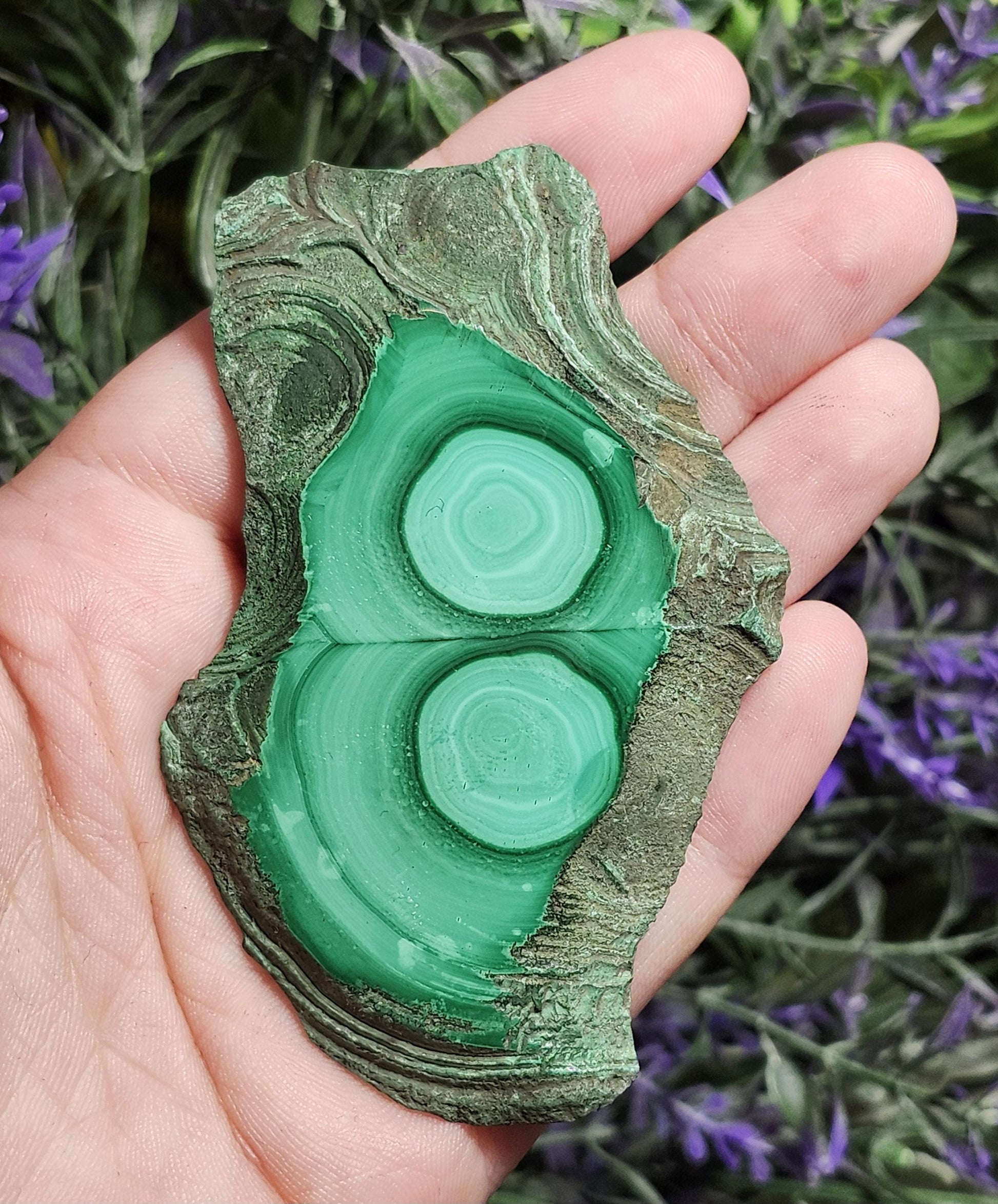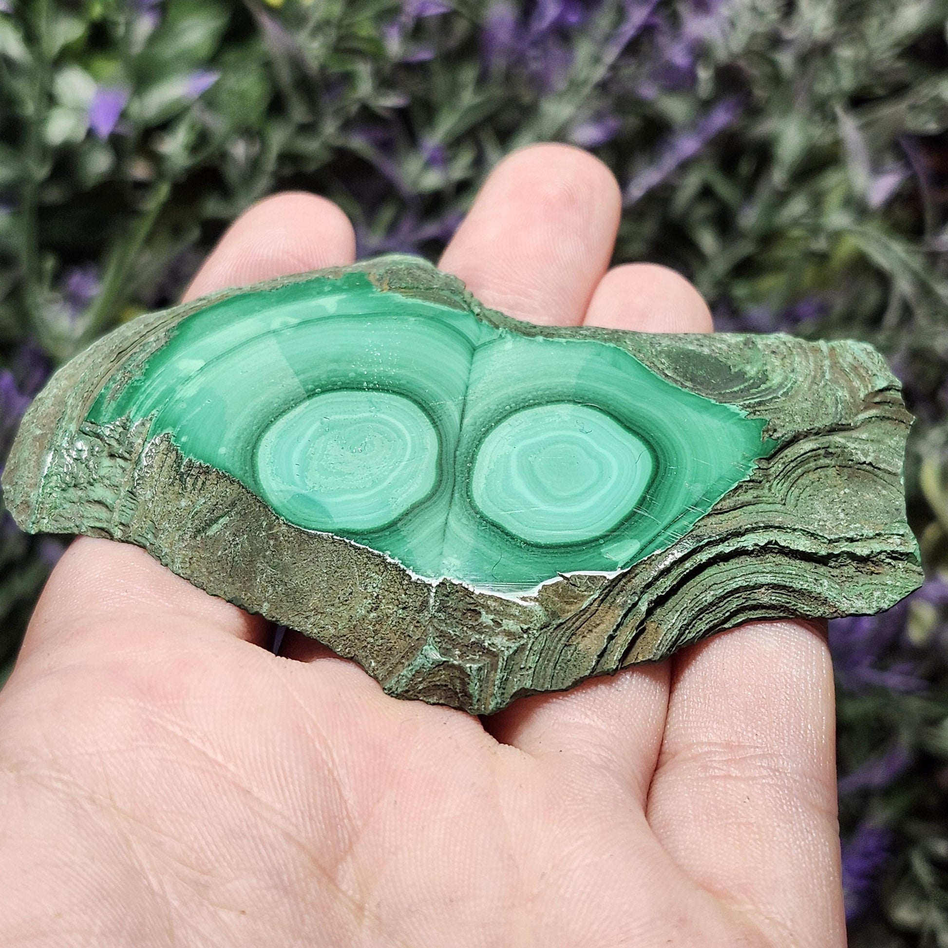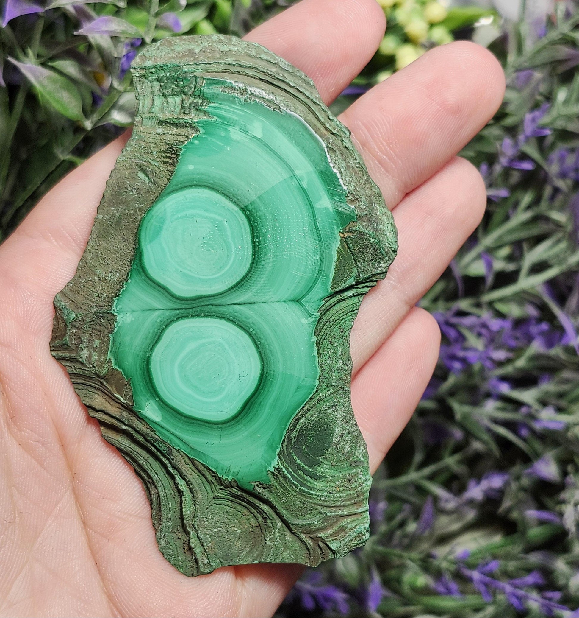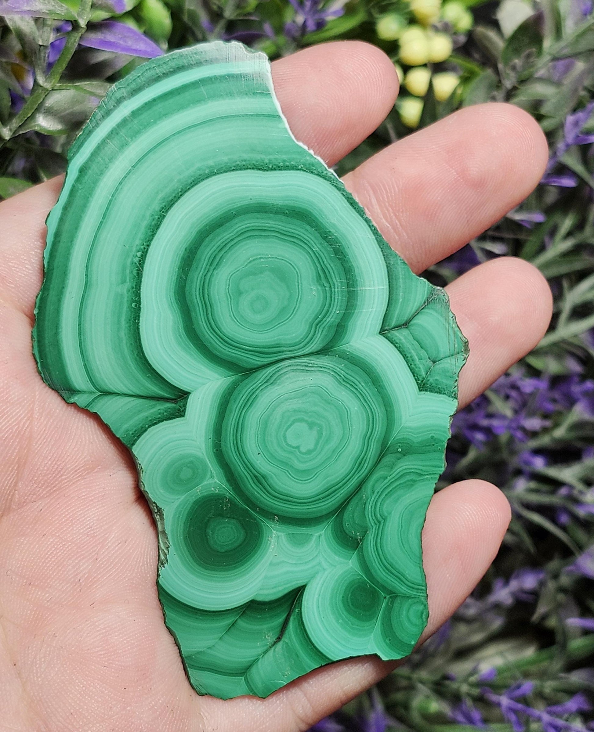 This Malachite crystal has been sliced and polished to a high sheen to show off its unique, concentric pattern. This specimen measures approximately 80 millimeters by 52 millimeters.