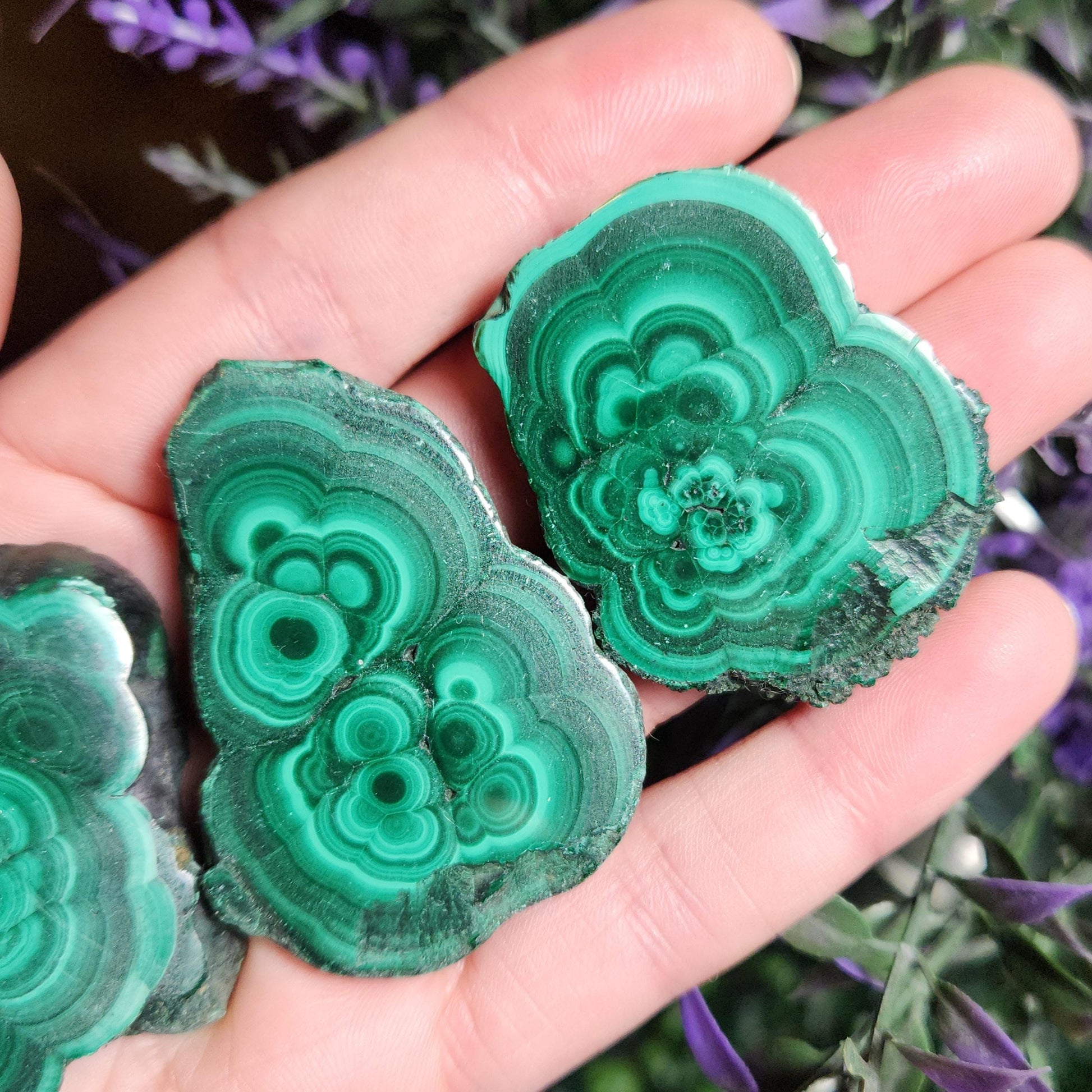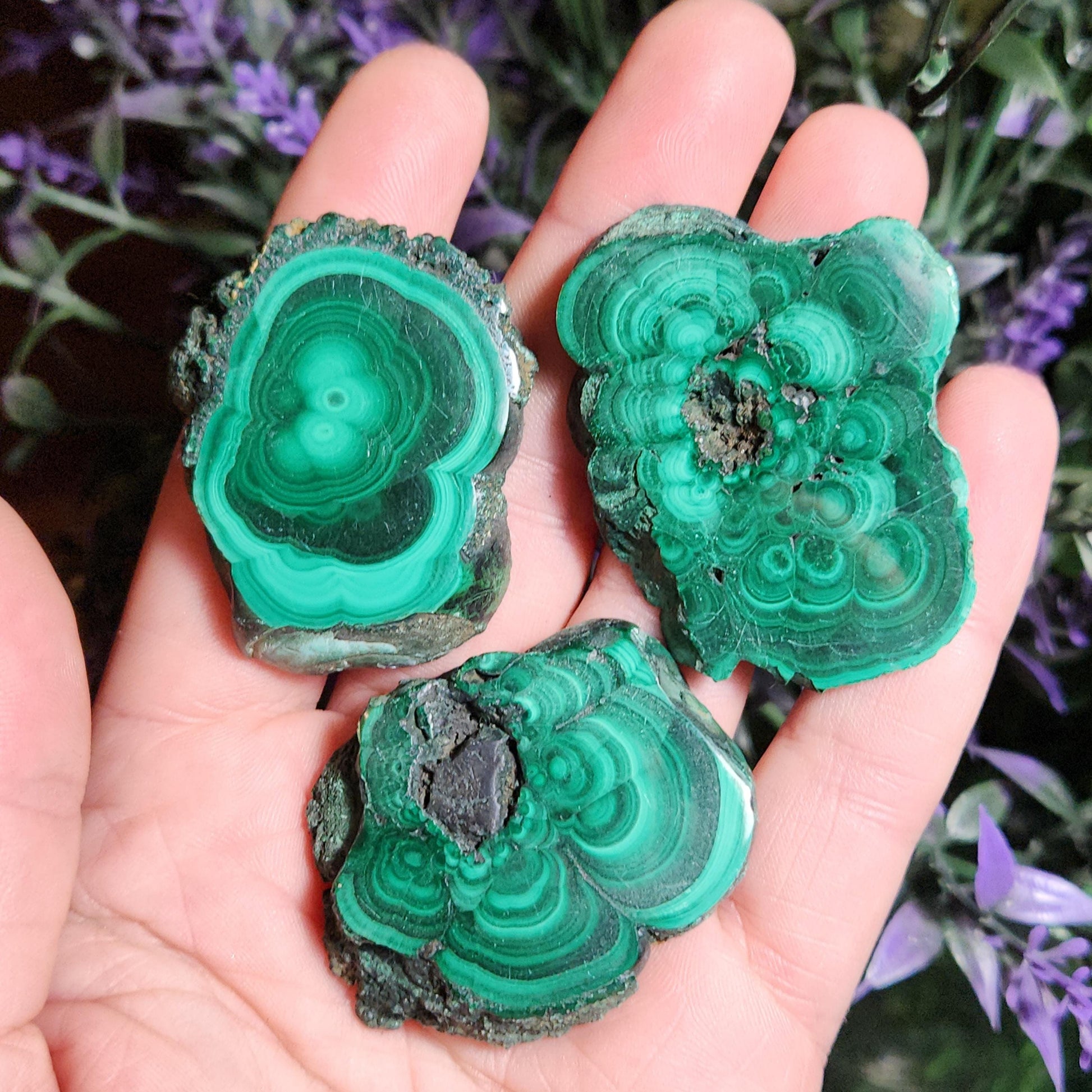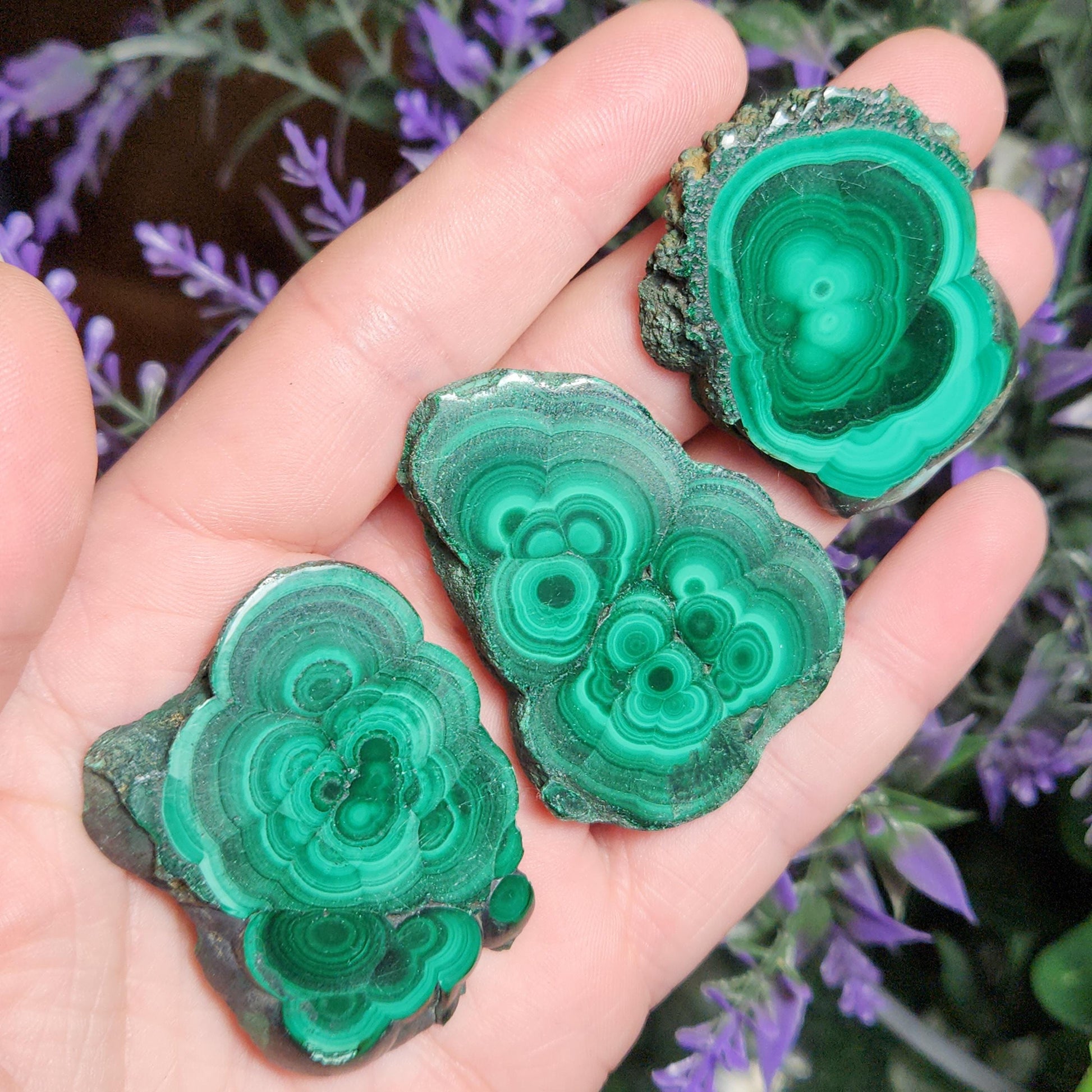These Malachite crystals have been sliced and polished to a high sheen to show off their unique, concentric patterns. Each specimen measures between 30 and 40 millimeters.