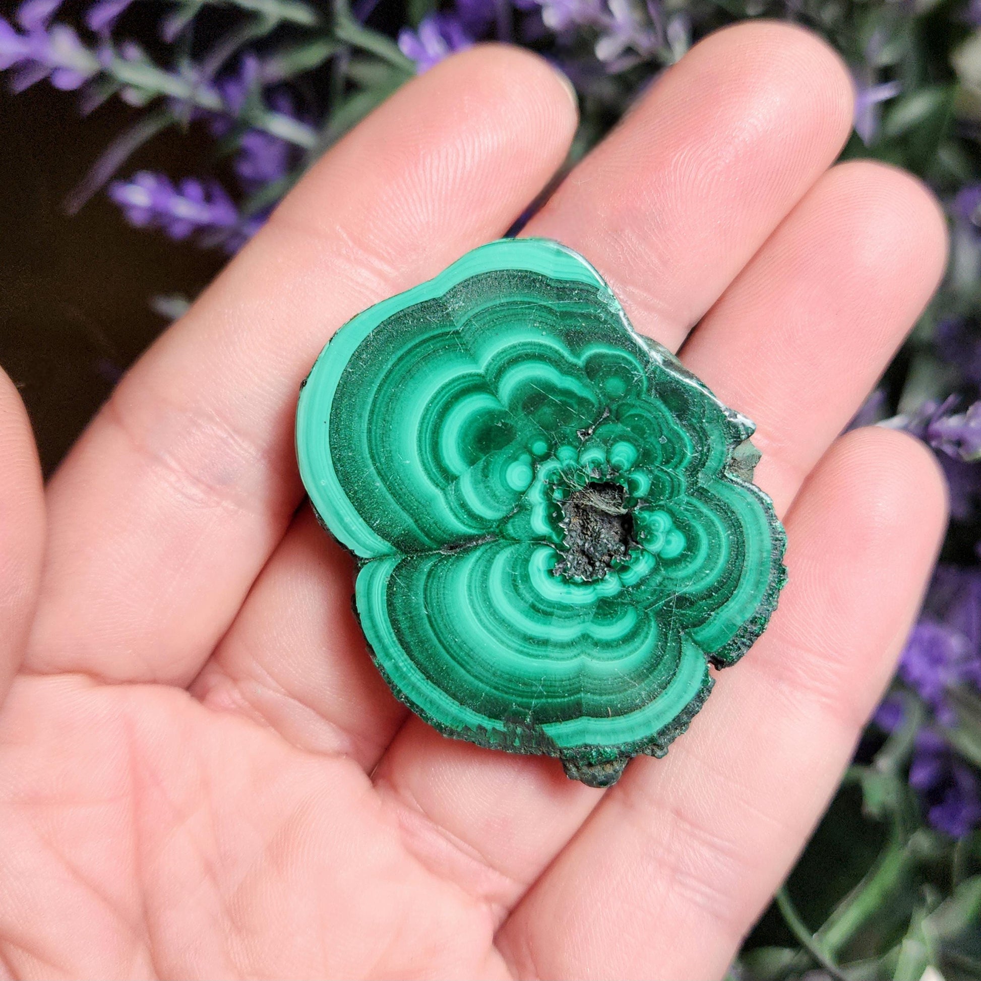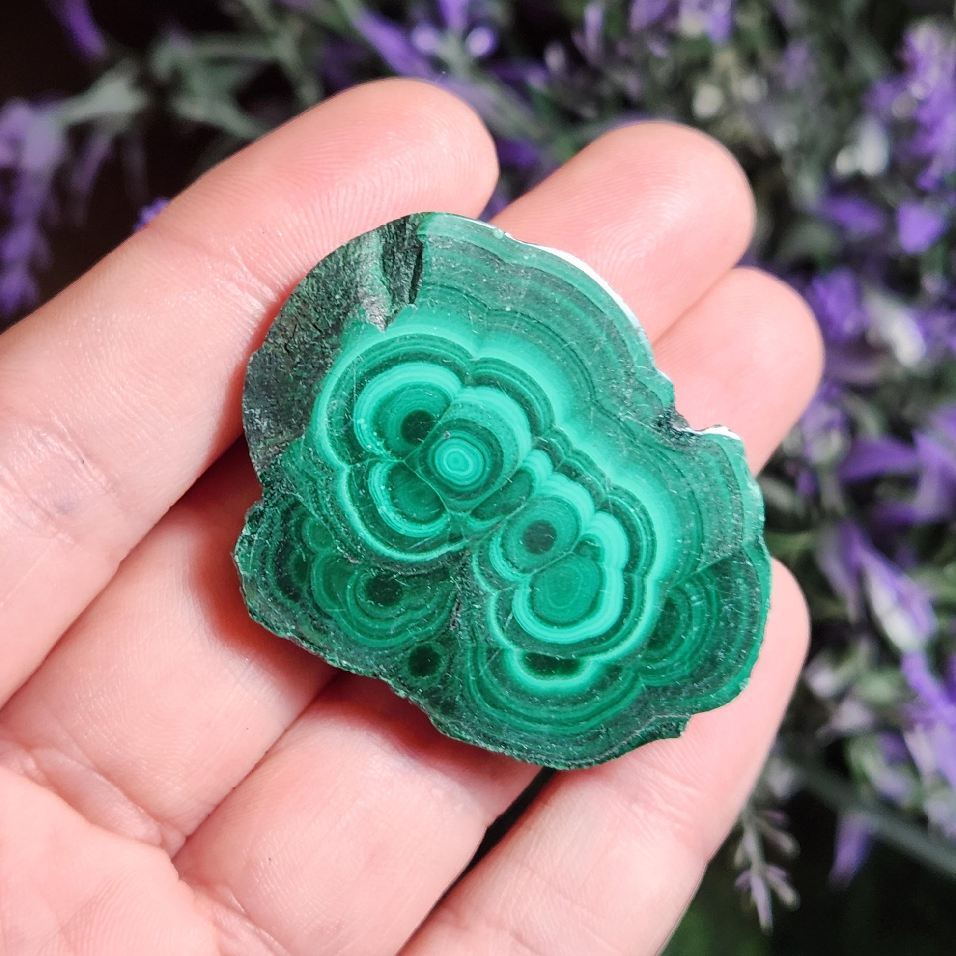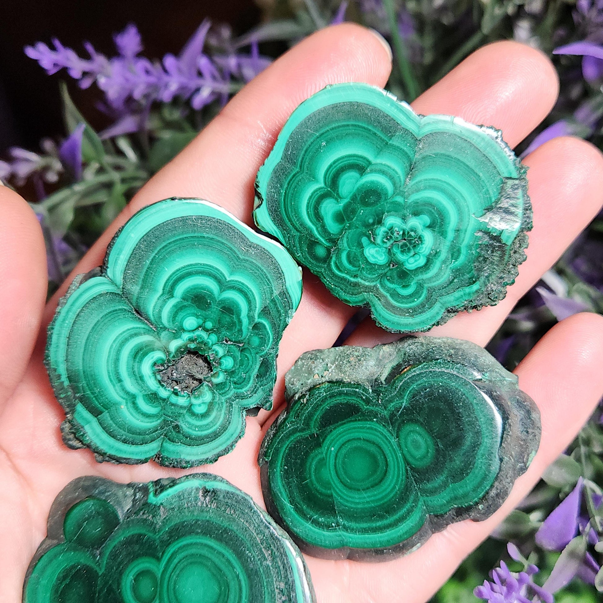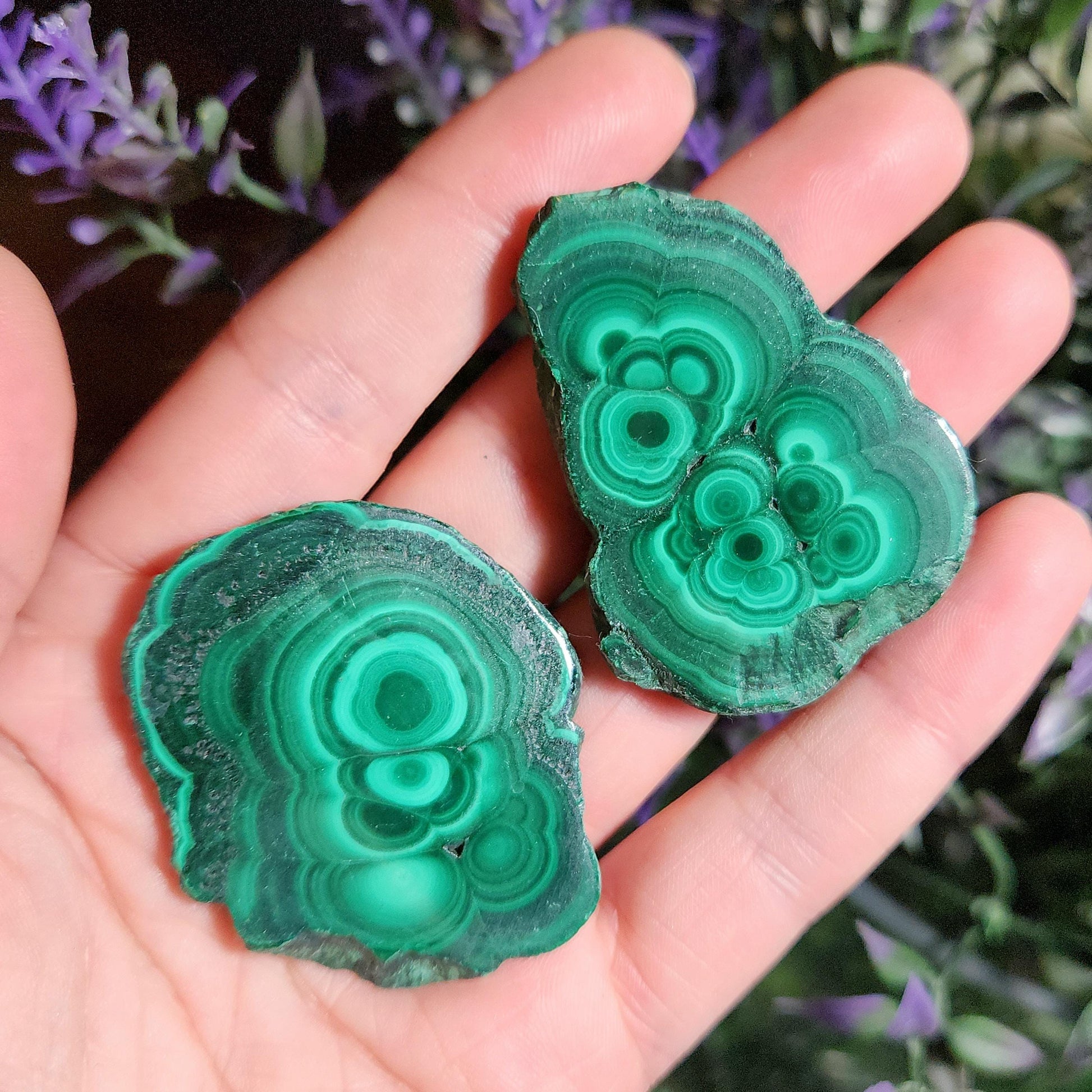 These Malachite crystals have been sliced and polished to a high sheen to show off their unique, concentric patterns. Each specimen measures between 30 and 40 millimeters.