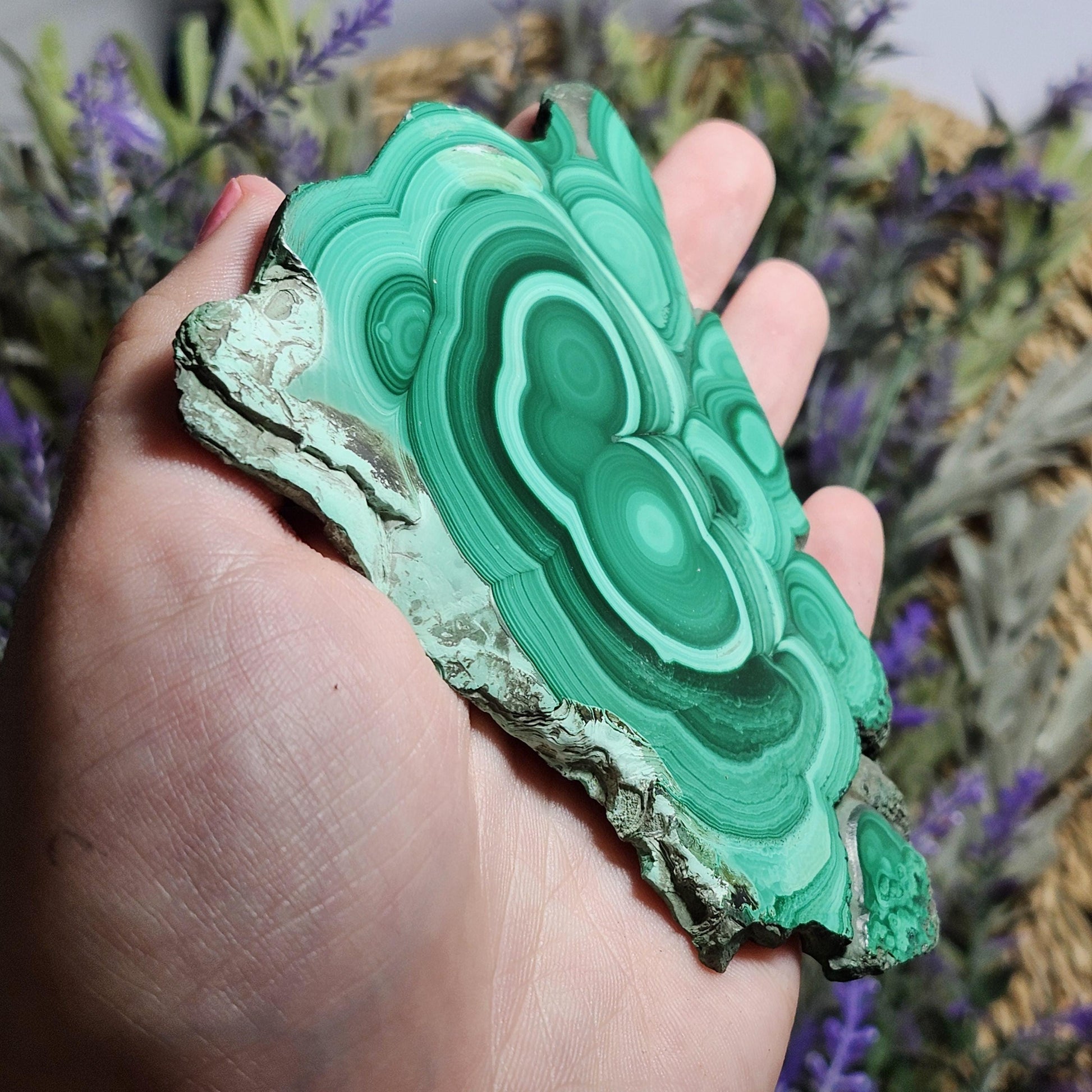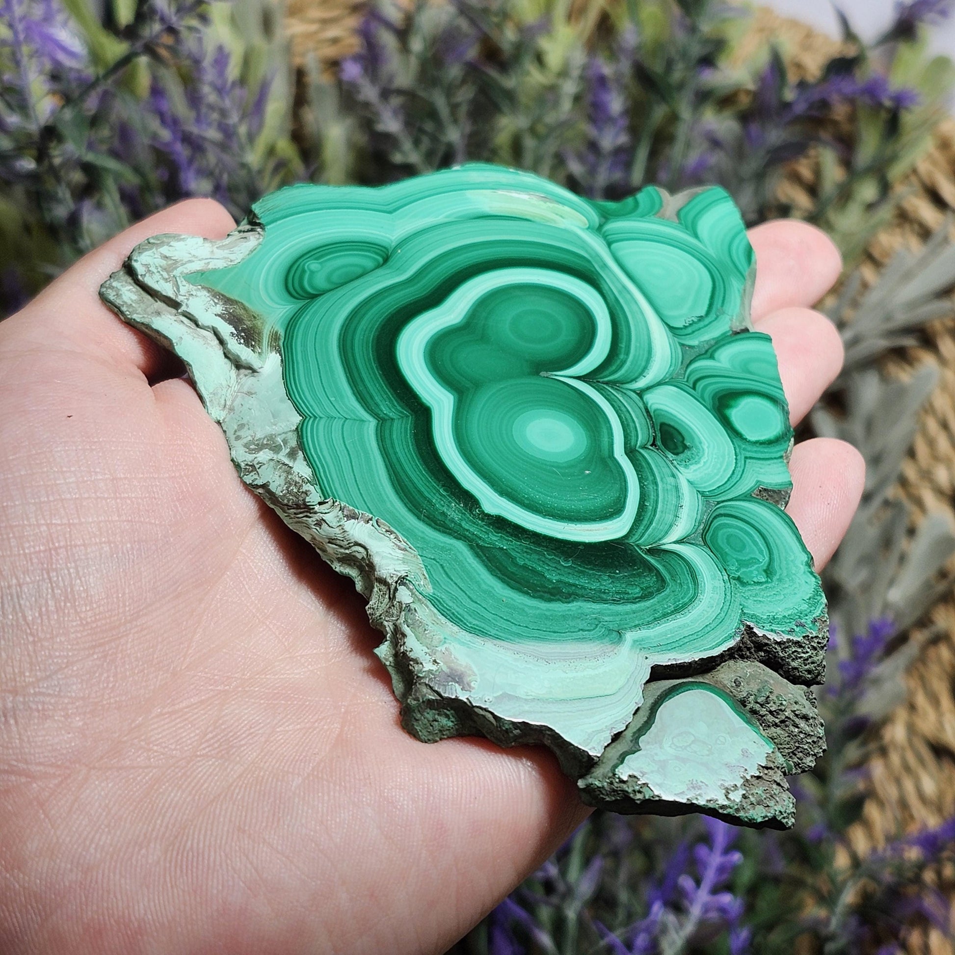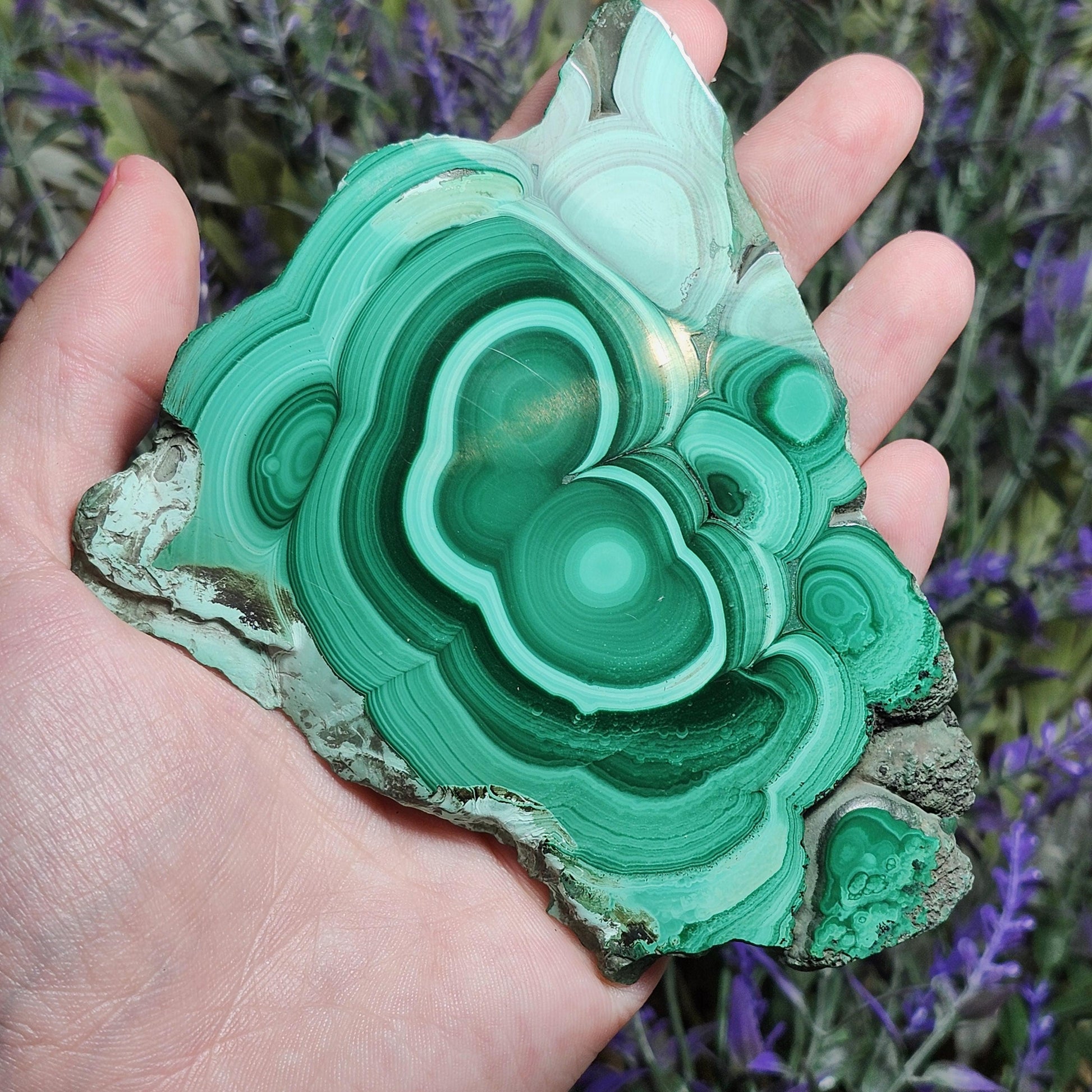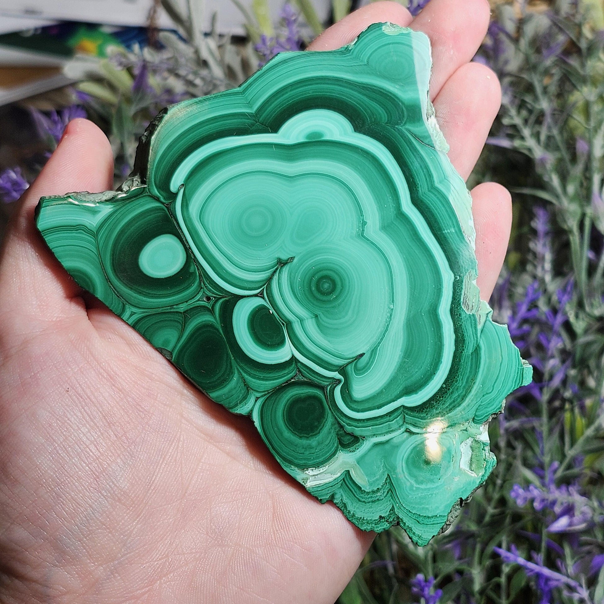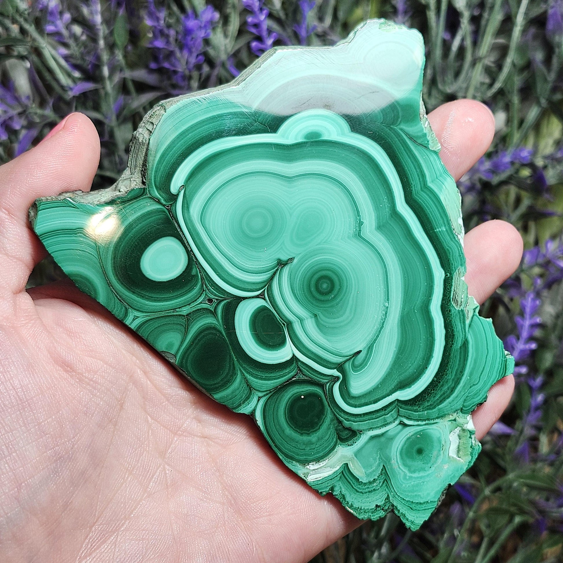 This unique Malachite crystal has been sliced and polished to a high sheen to show off its concentric surface and many patterns of green coloring. This specimen measures approximately 105 millimeters by 70 millimeters.