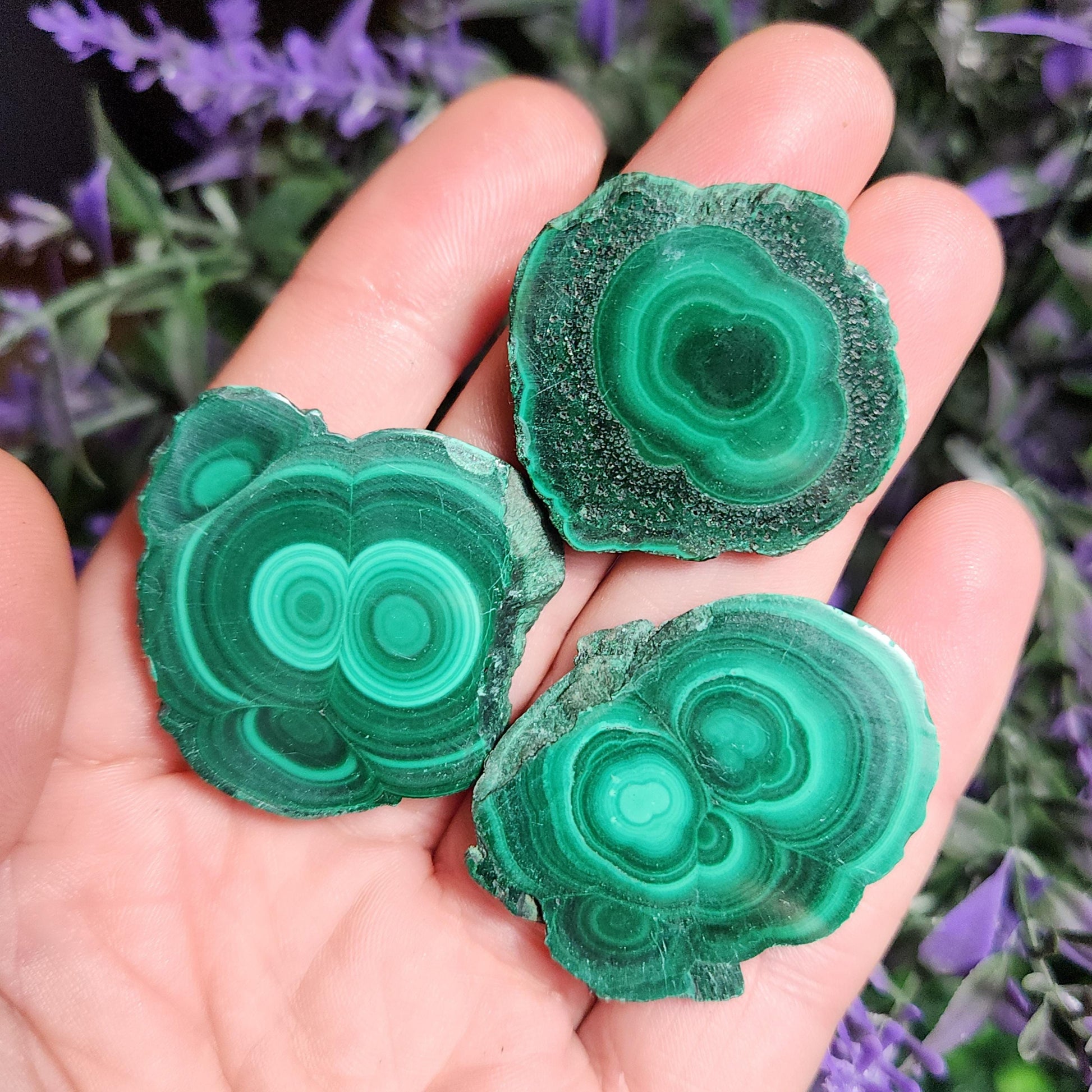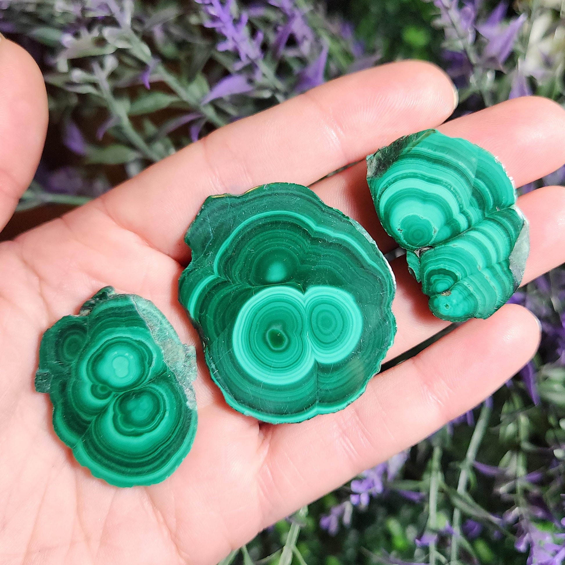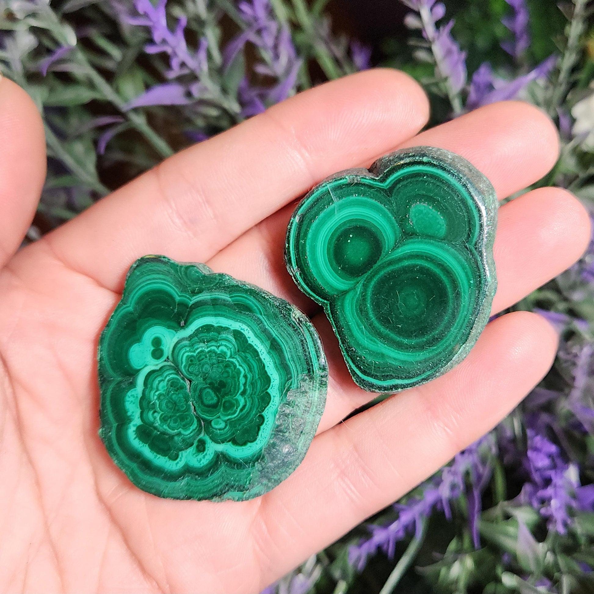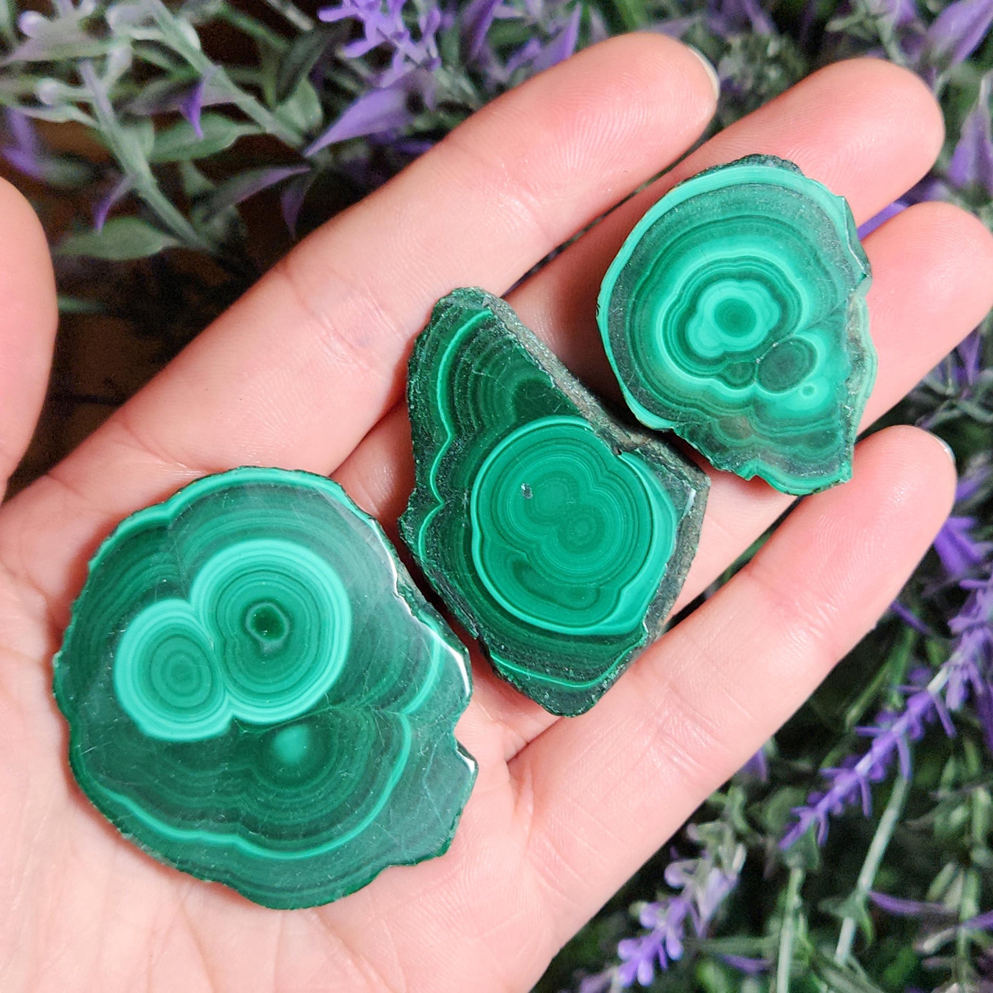 These high-quality Malachite crystals have been sliced and polished to a high sheen. They exhibit bright to dark shades of green and each showcase a uniquely captivating concentric pattern.