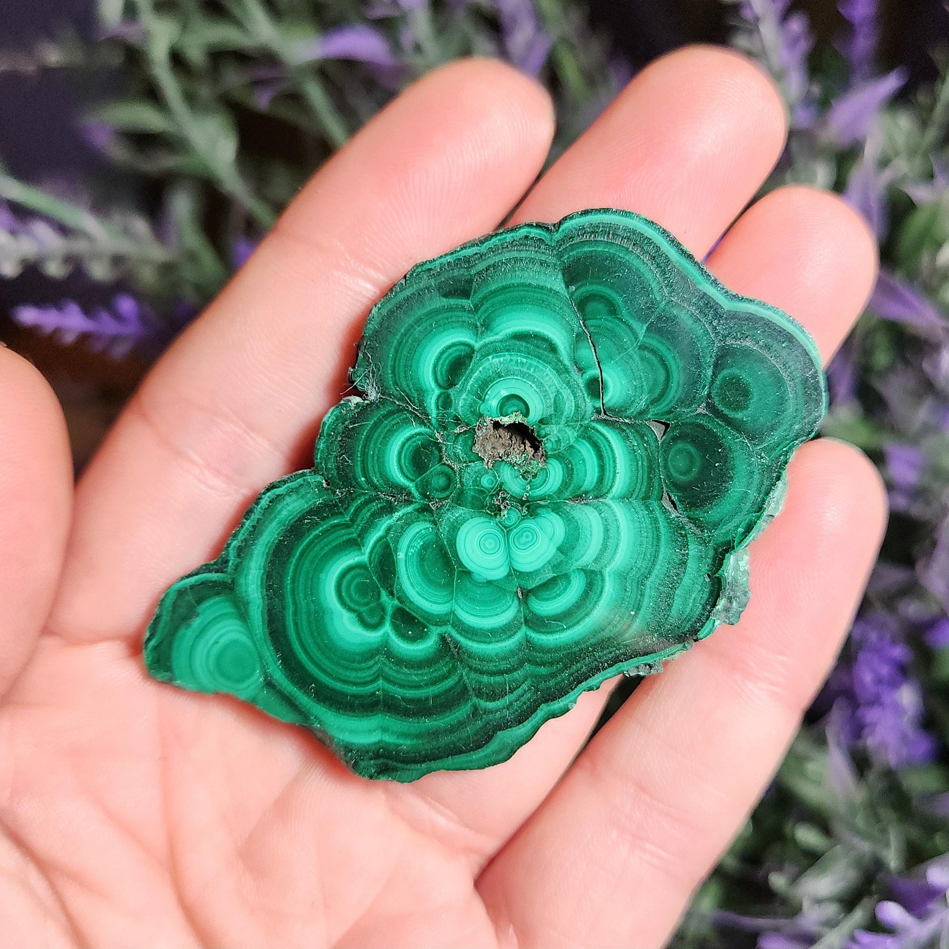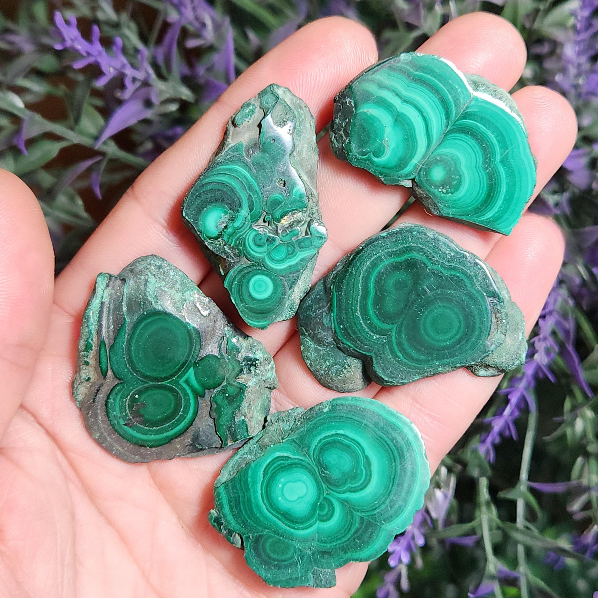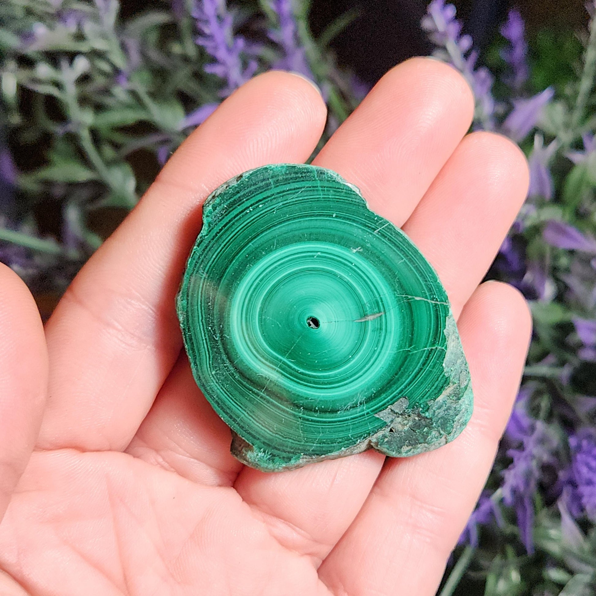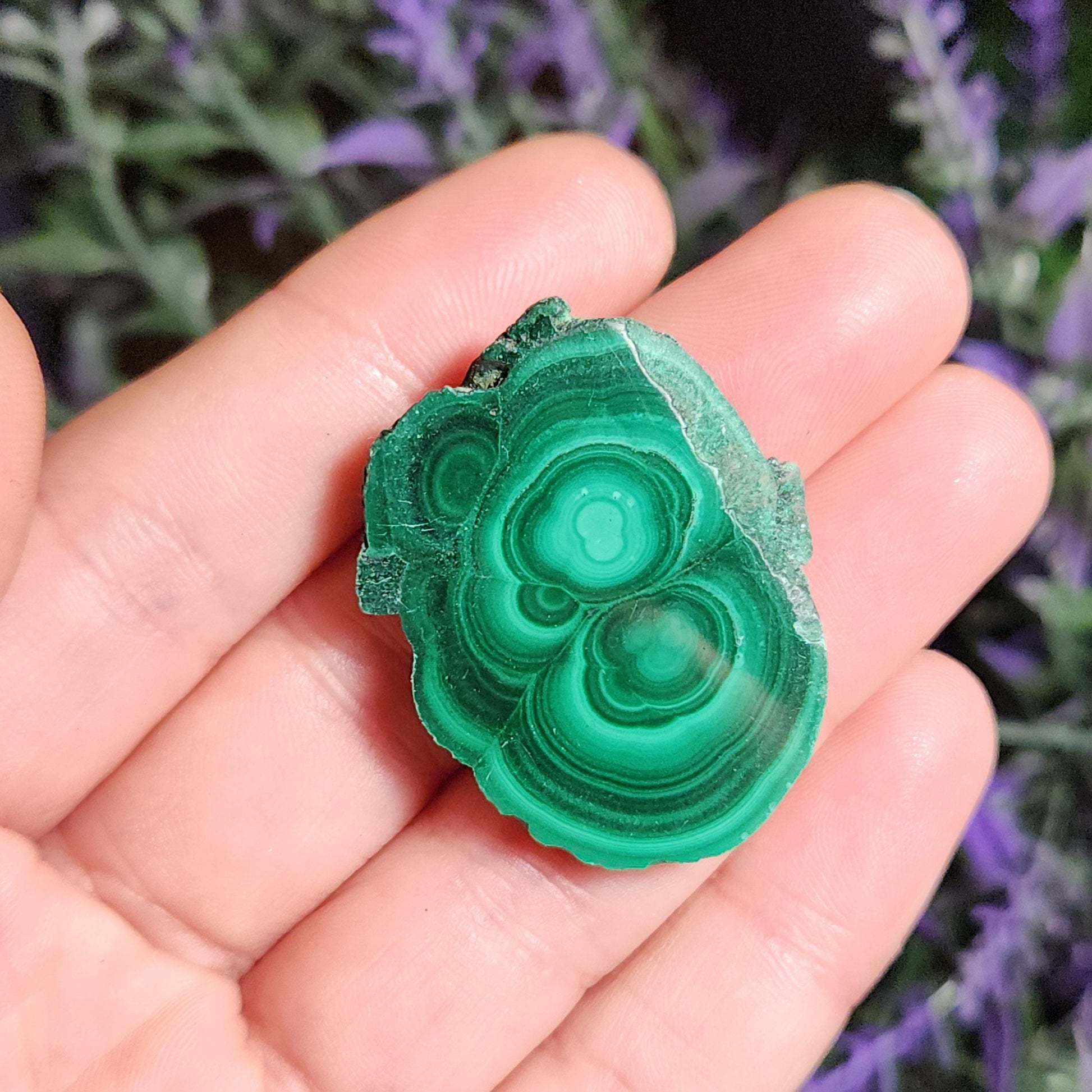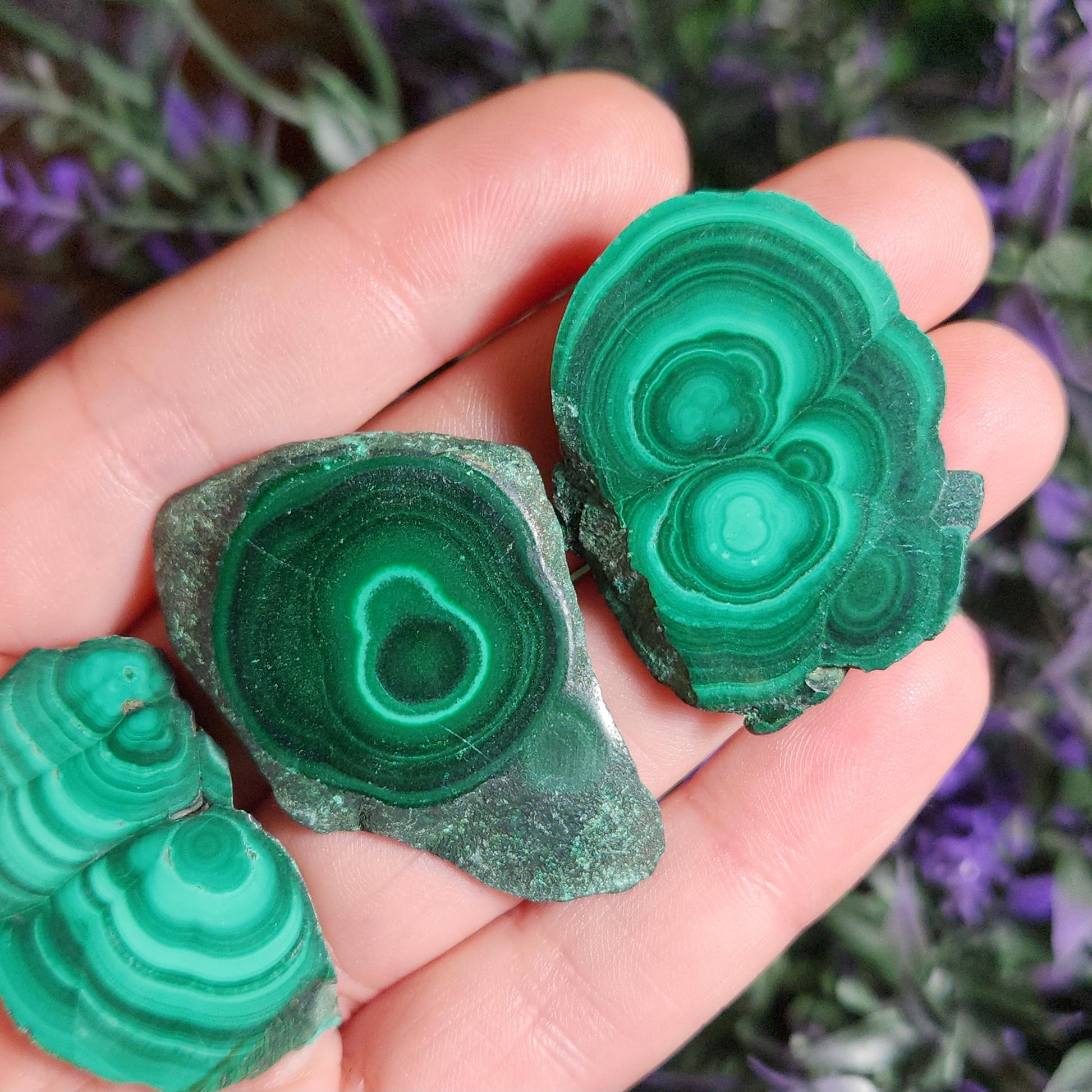 These high-quality Malachite crystals have been sliced and polished to a high sheen. They exhibit bright to dark shades of green and each showcase a uniquely captivating concentric pattern.