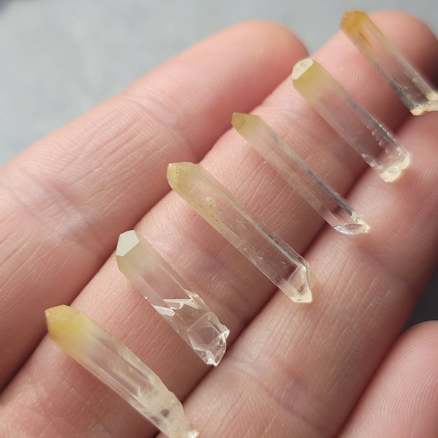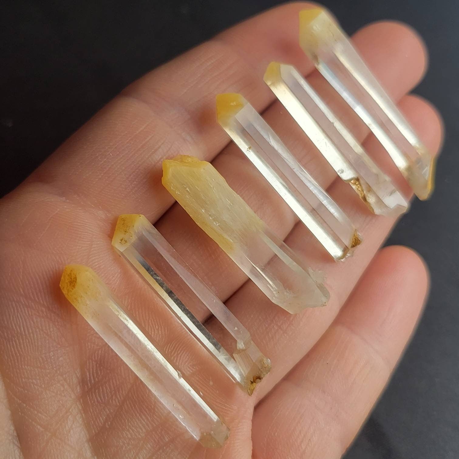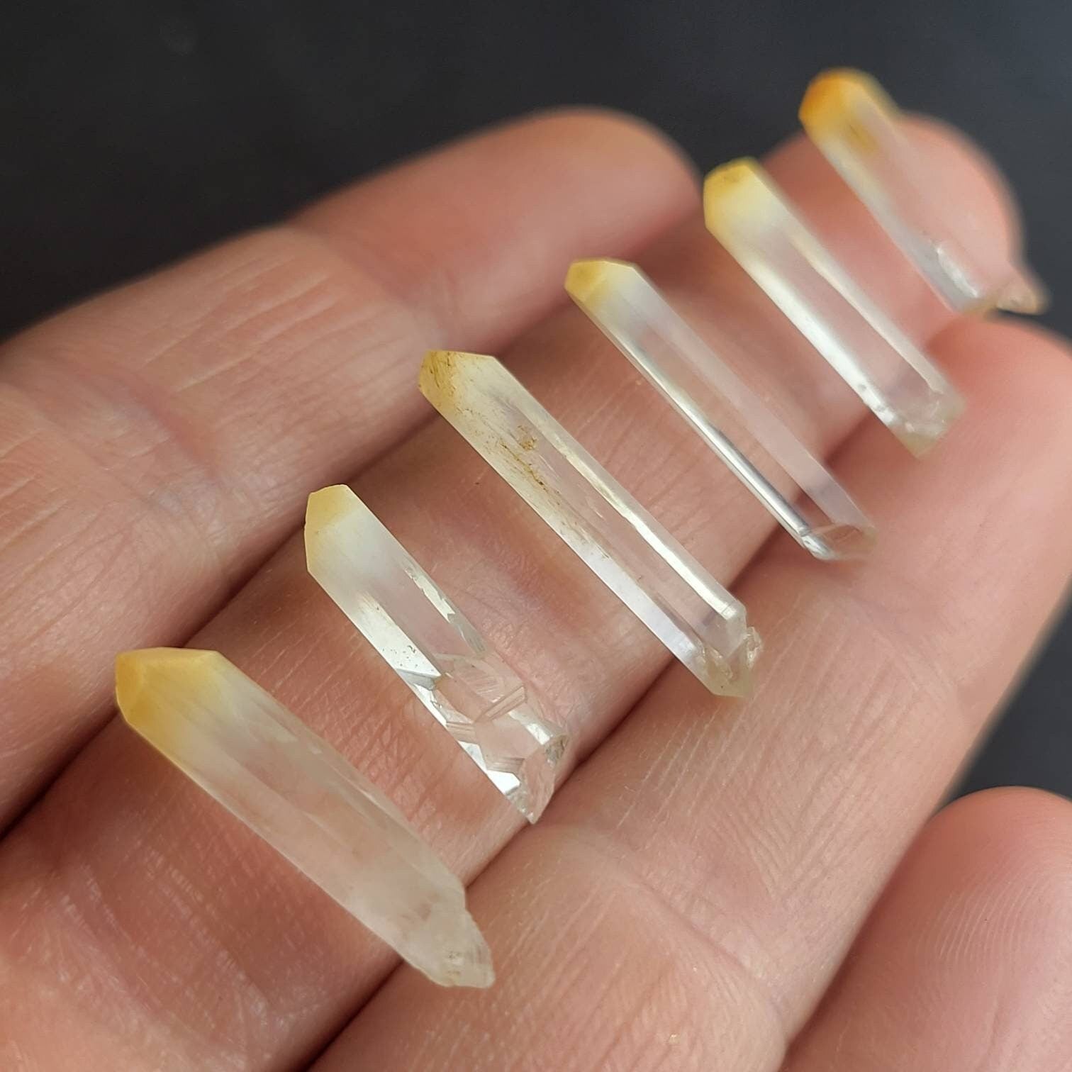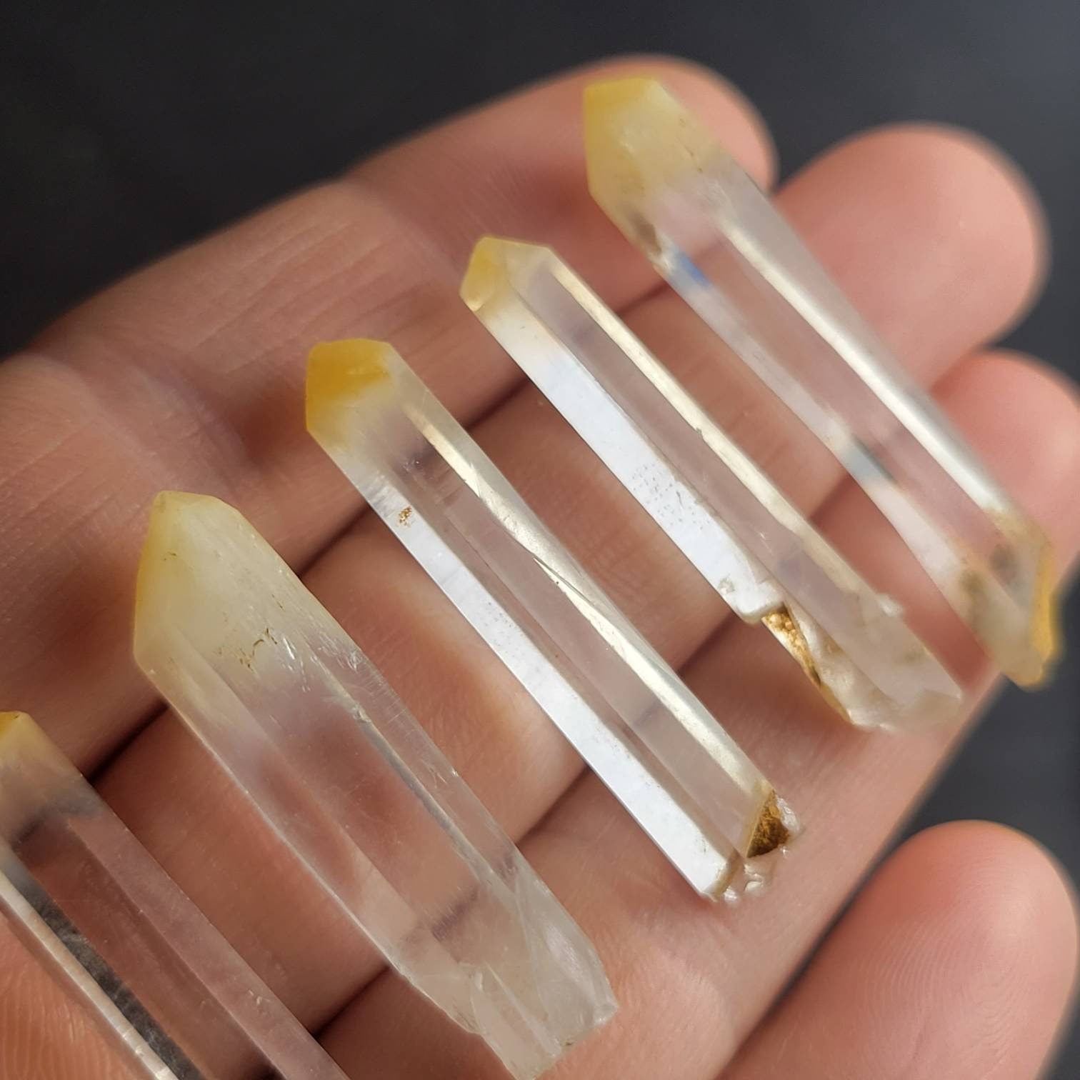 These Quartz crystals from Colombia have saturated golden inclusions within their terminated points.