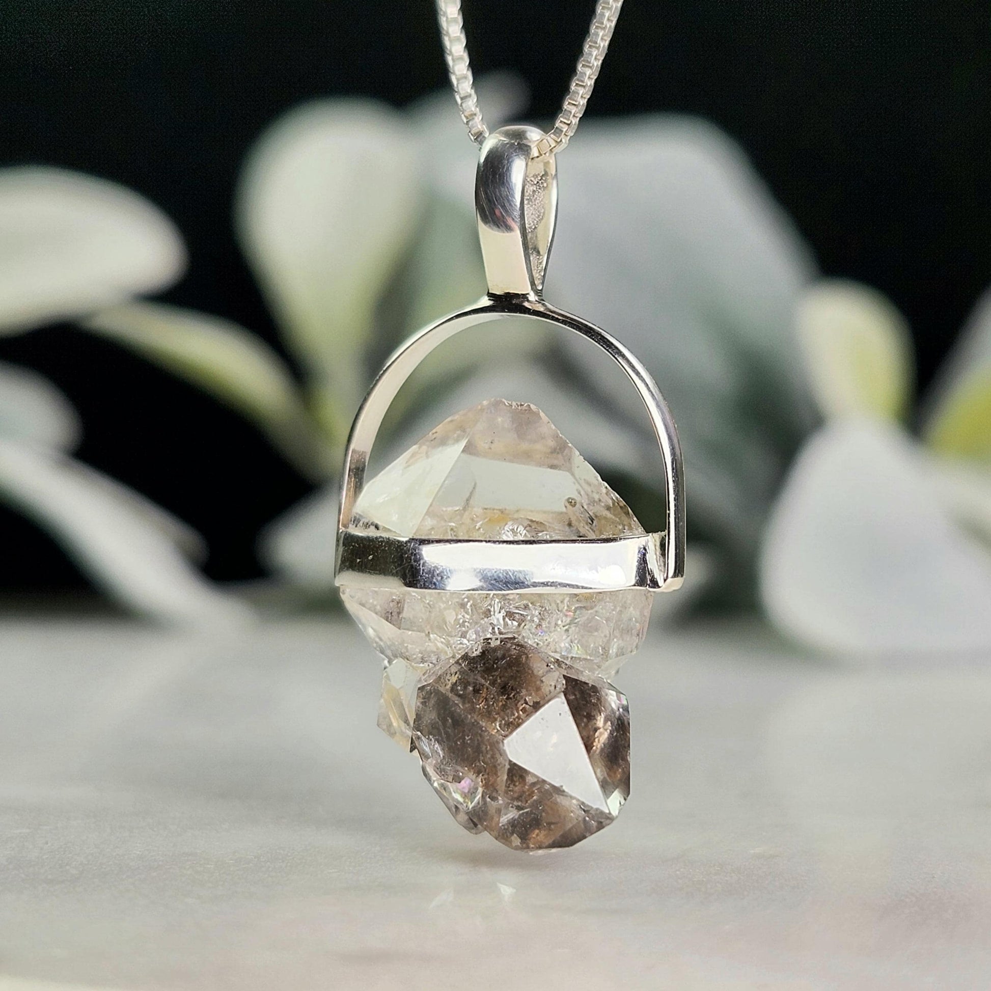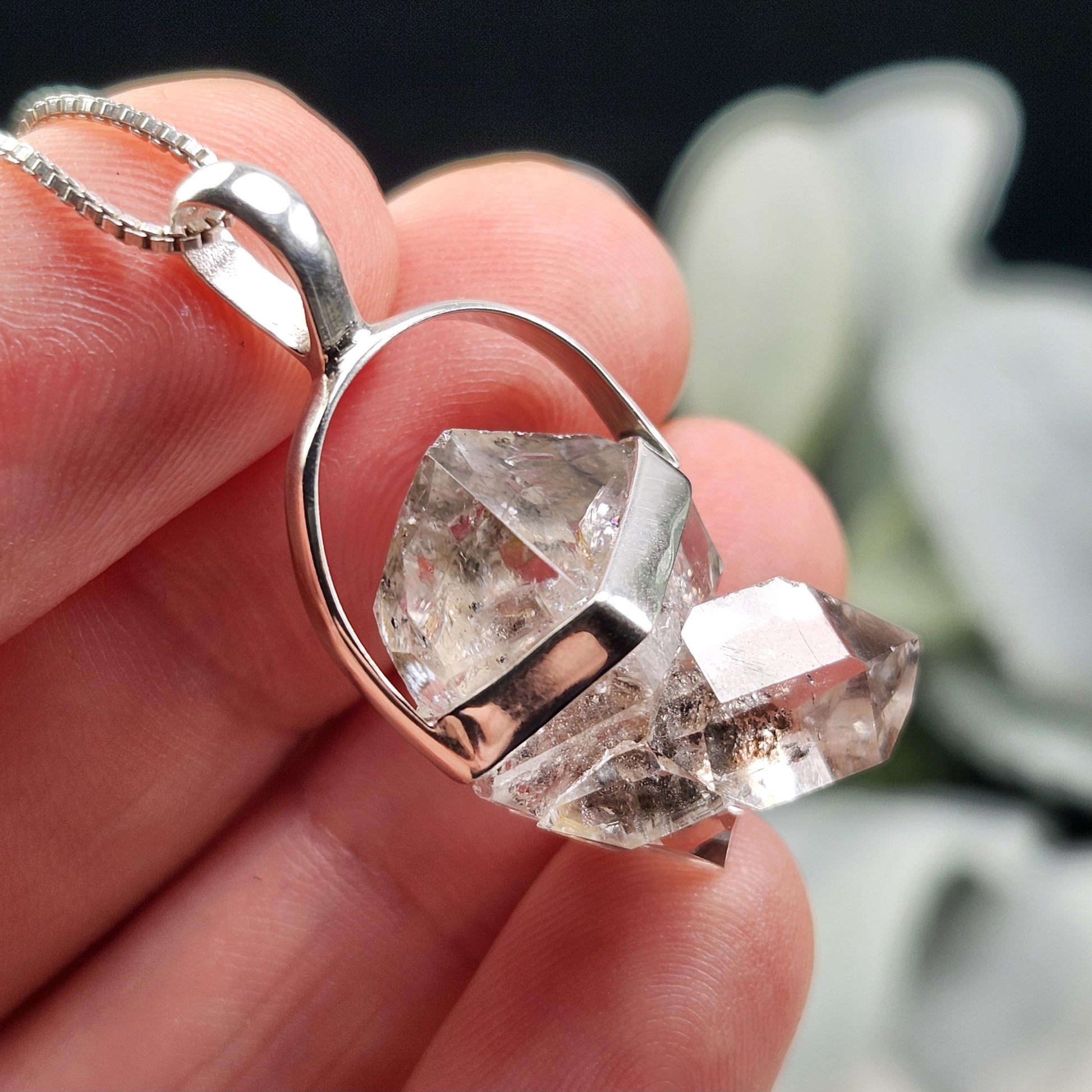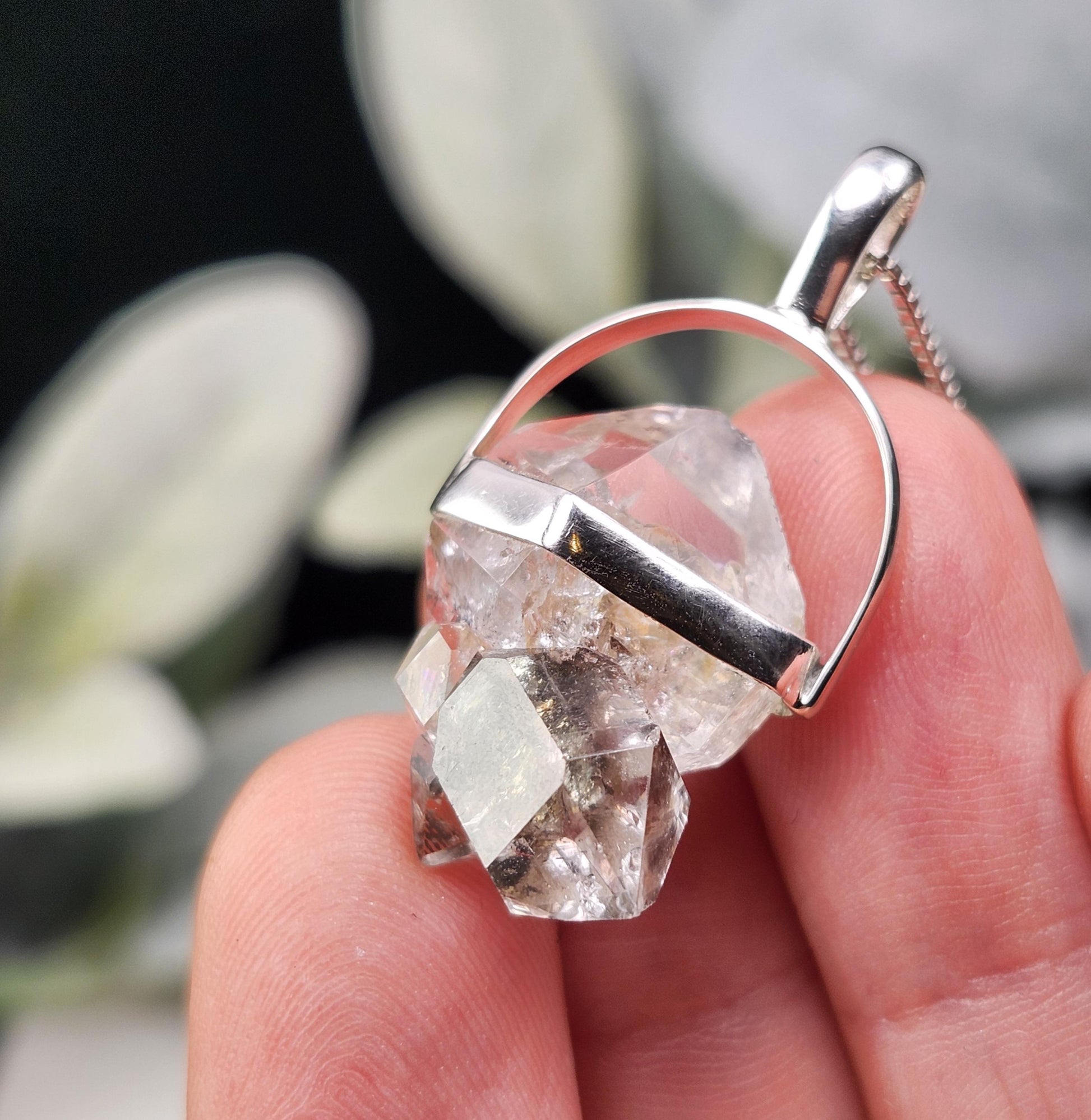 This manifestation Herkimer Diamond gemstone exhibits termination with brilliant natural faceting and a translucence that showcases the mineral inclusions within. Bridge/manifestation crystals are formations where a stark termination grows partially or fully within a larger host crystal. This unique structure highlights a natural process of inclusion and intergrowth, representing the complex beauty of mineral development. This pendant measures approximately 31mm by 16mm. The silver chain used in the photos is to help envision how this pendant will look while adorned but is not included in the listing.