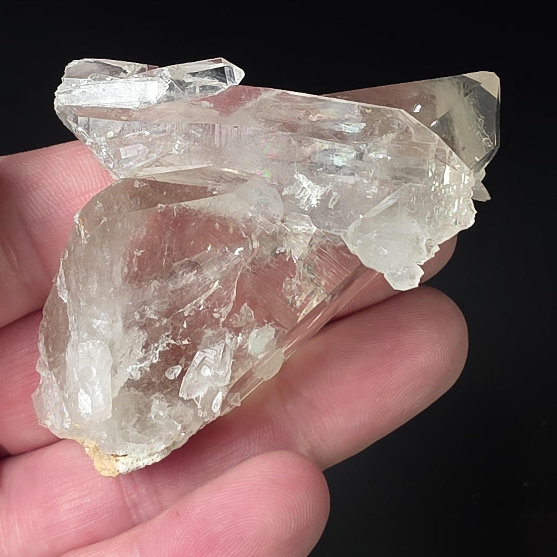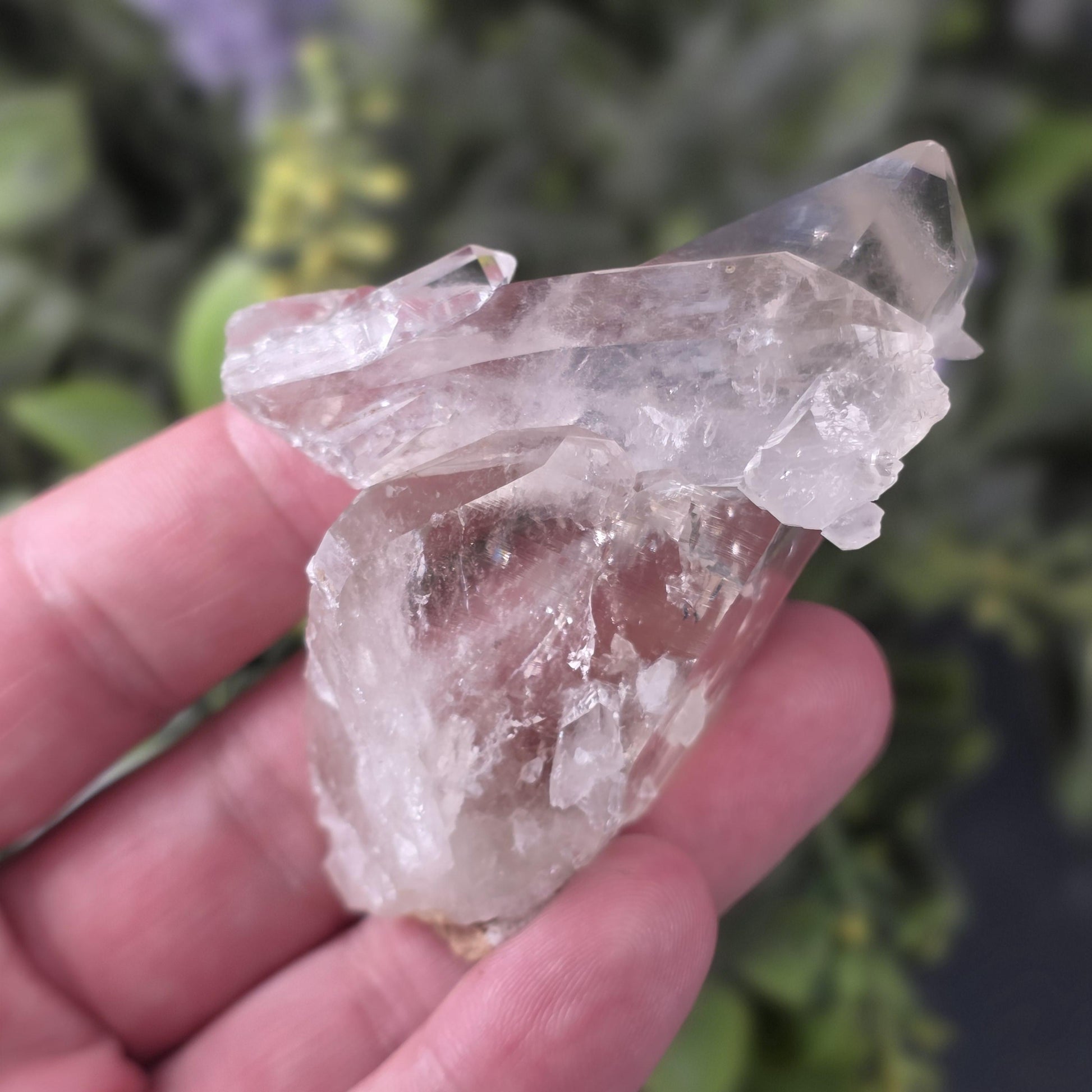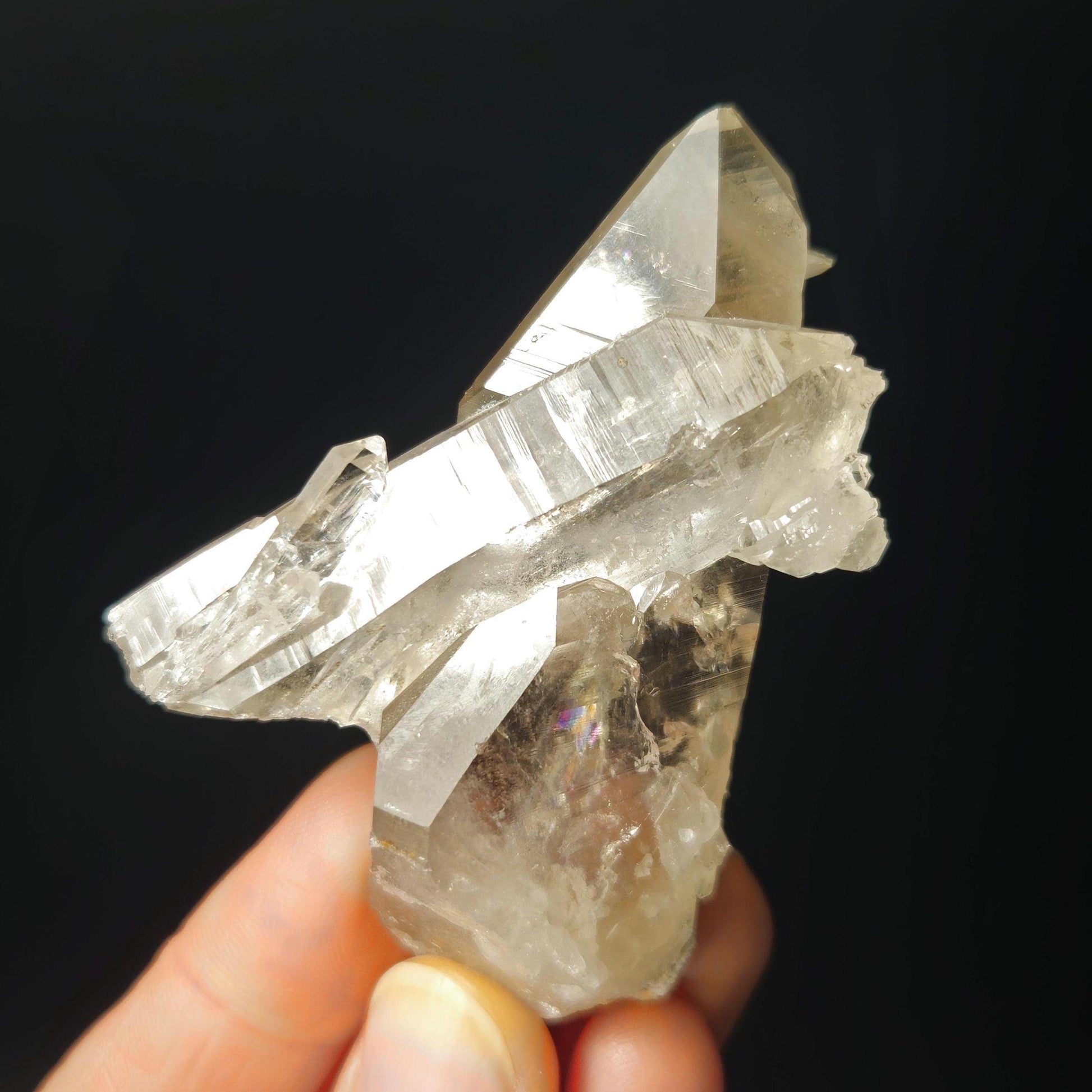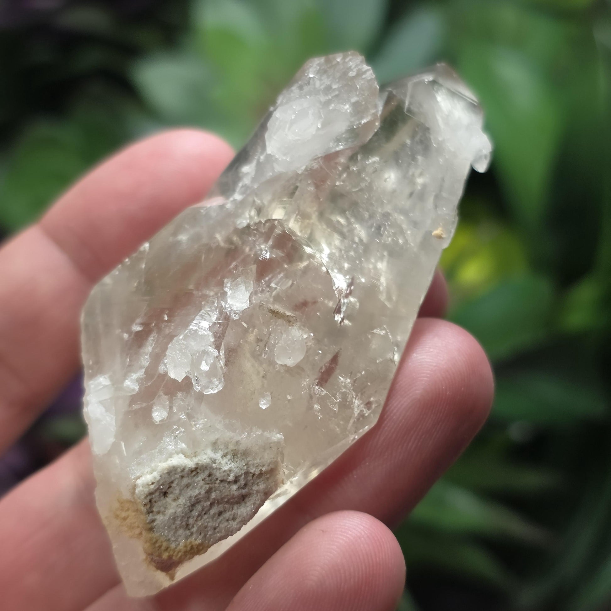 This raw Faden Quartz crystal displays a cloudy translucence, exhibits tabular growth, and has a bridge crystal with a shining rainbow inclusion - bridge/manifestation crystals are crystals with stark terminations that grow inside of another crystal. These are powerful tools of creating your reality, manifesting what you wish and believe in your heart, and promoting your inner joy. This unique stone contains abrasions from the mining process. This specimen measures 73mm by 45mm by 15mm and weighs 64 grams.