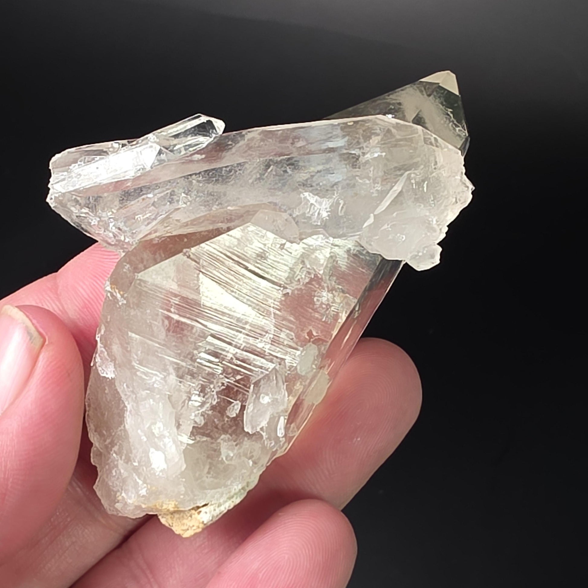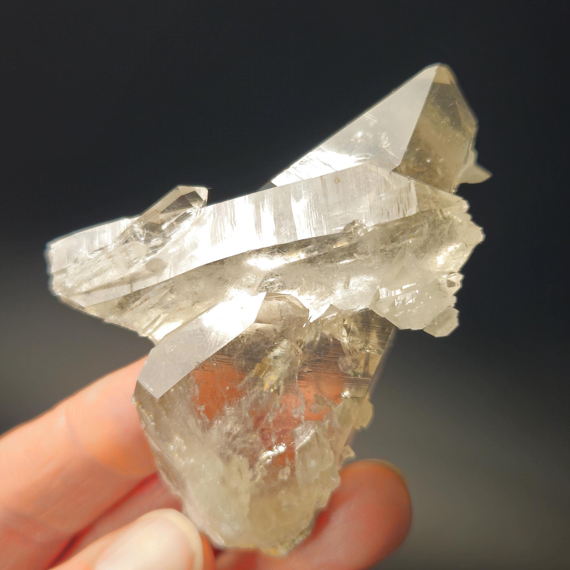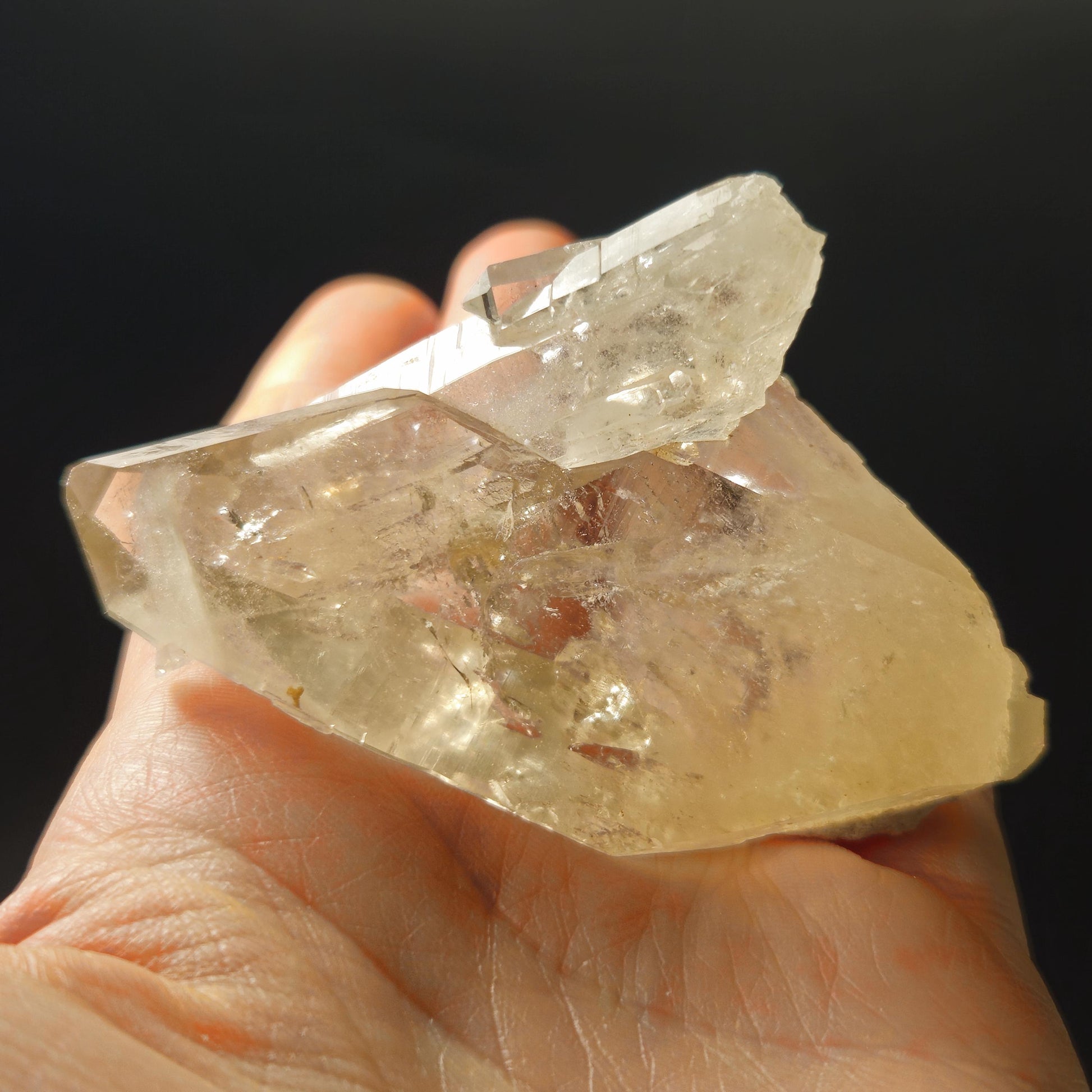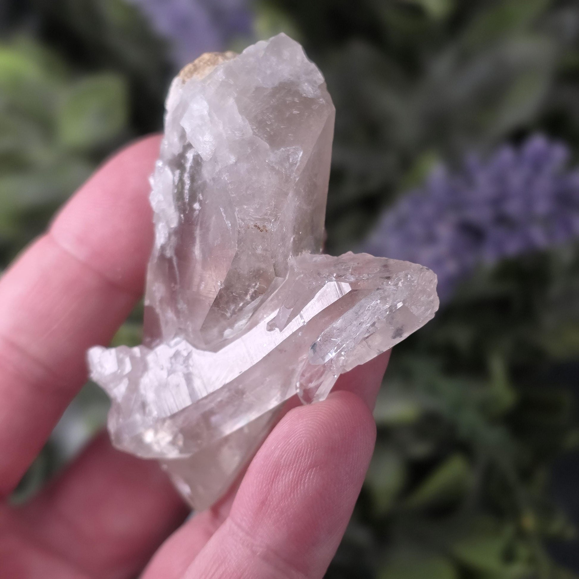 This raw Faden Quartz crystal displays a cloudy translucence, exhibits tabular growth, and has a bridge crystal with a shining rainbow inclusion - bridge/manifestation crystals are crystals with stark terminations that grow inside of another crystal. These are powerful tools of creating your reality, manifesting what you wish and believe in your heart, and promoting your inner joy. This unique stone contains abrasions from the mining process. This specimen measures 73mm by 45mm by 15mm and weighs 64 grams.