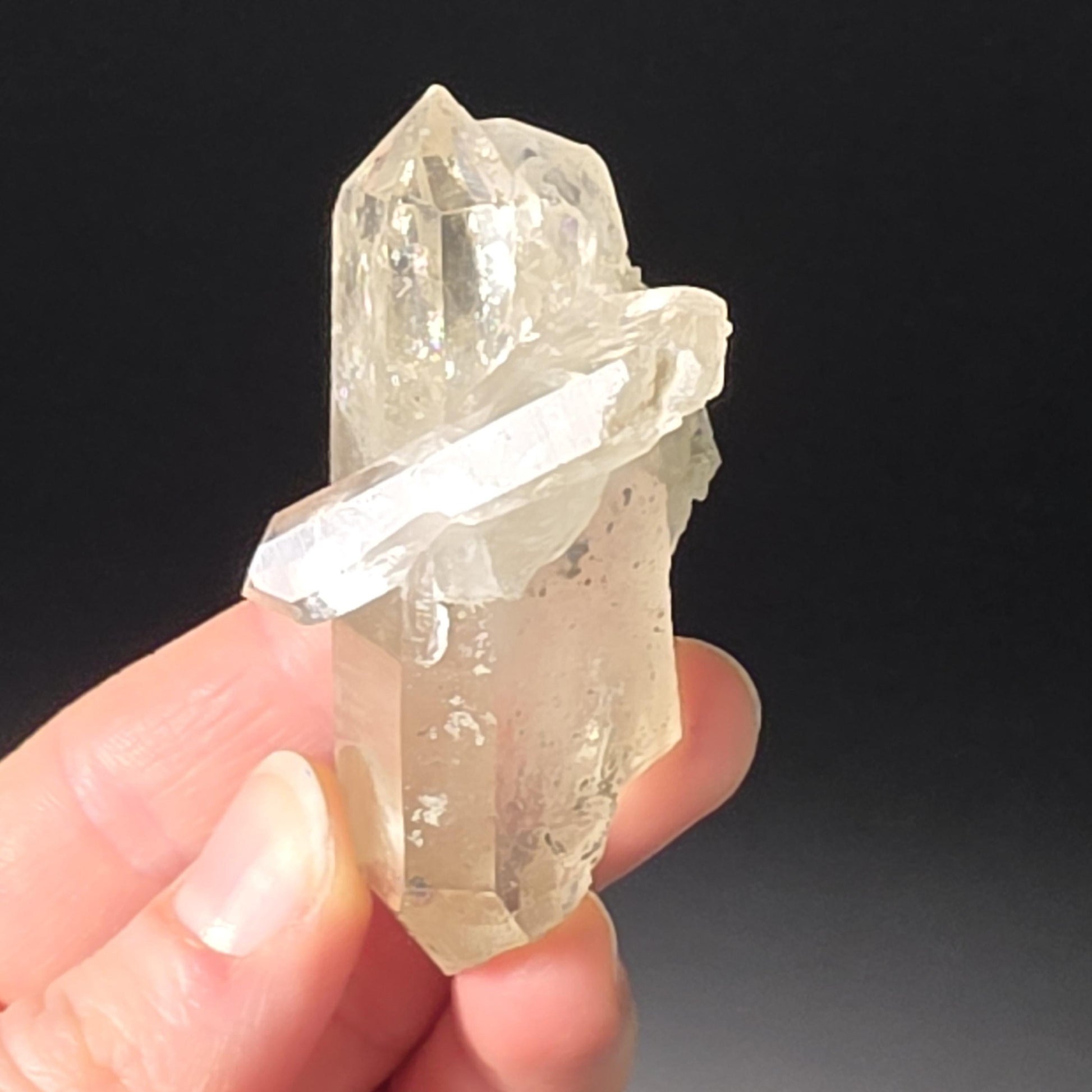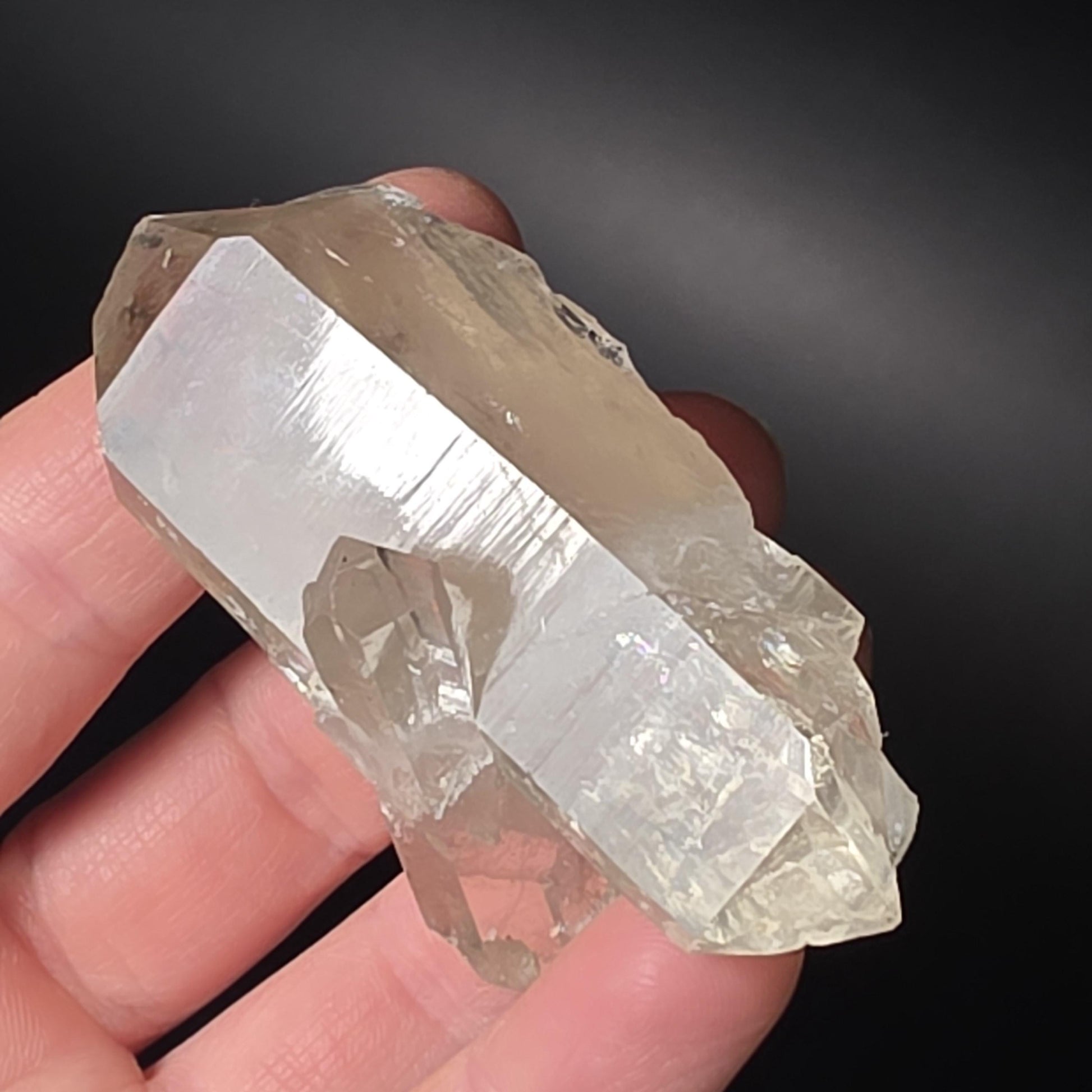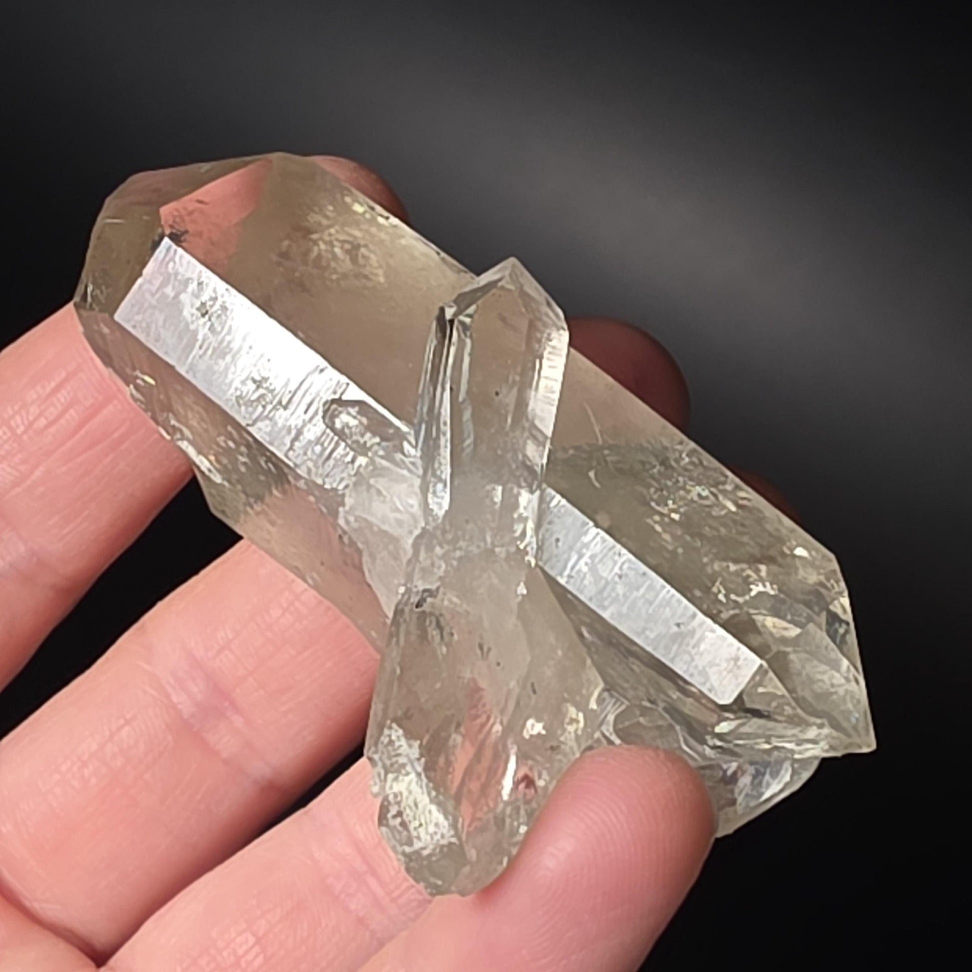 This raw Faden Quartz from the base of the Himalayan Mountain range in Pakistan displays a cloudy translucence and a unique bridge inclusion. It is well terminated with some abrasions at the side of attachment. This specimen measures 65mm by 30mm by 30mm and weighs 59 grams.
