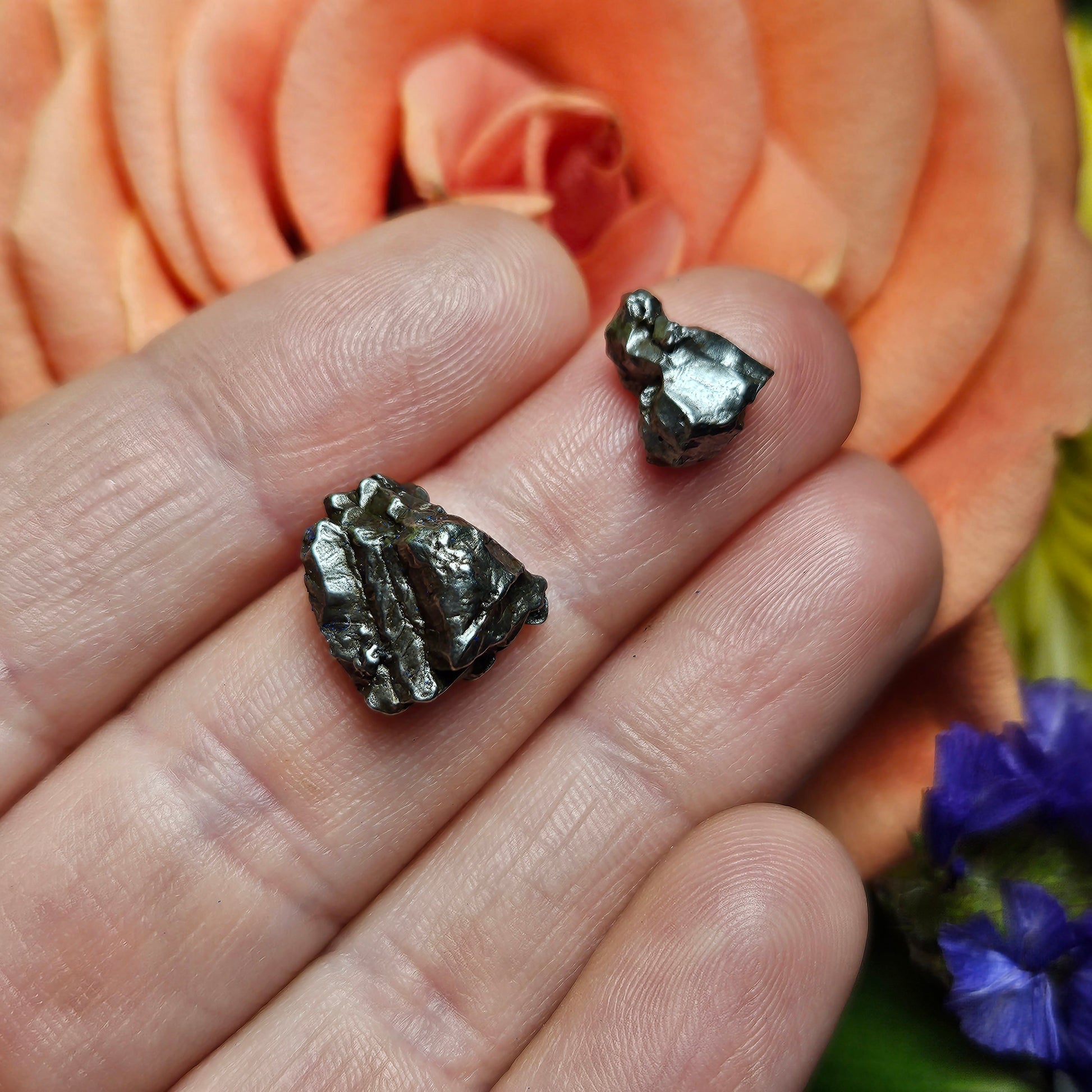 These raw Campo del Cielo meteorite fragments from Argentina exhibit a deep bronze color and have a naturally textured surface.