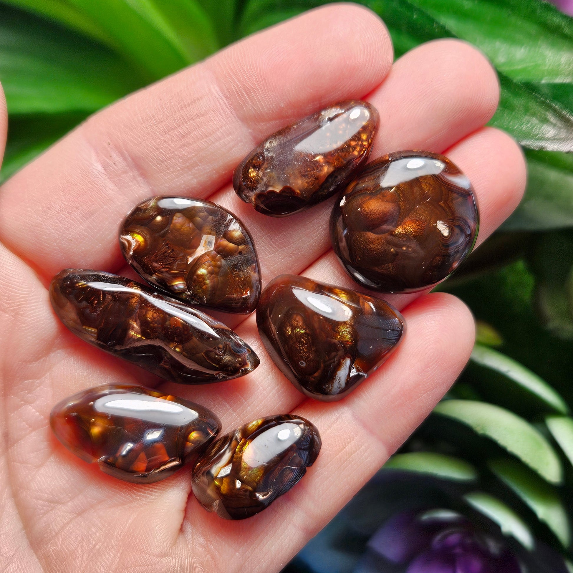 These high-quality Fire Agate crystals from Mexico exhibit areas of multicolored orbicular flash within brown agate. They specimens have a high polish, showing off the rainbow color flash within and have a range of shapes, with uneven polished surfaces as well as cabochon shapes.