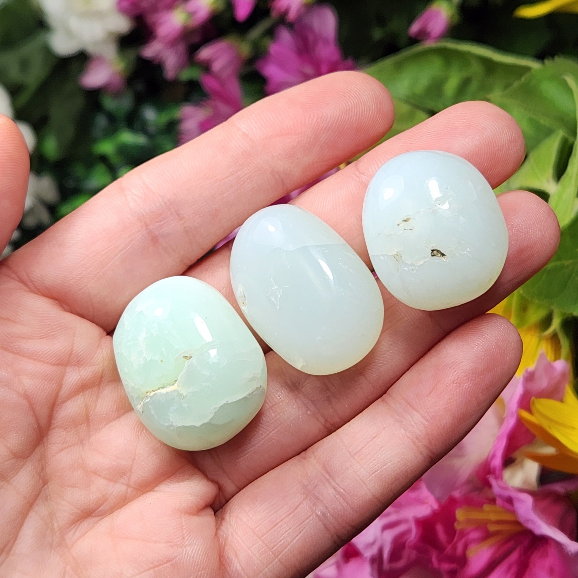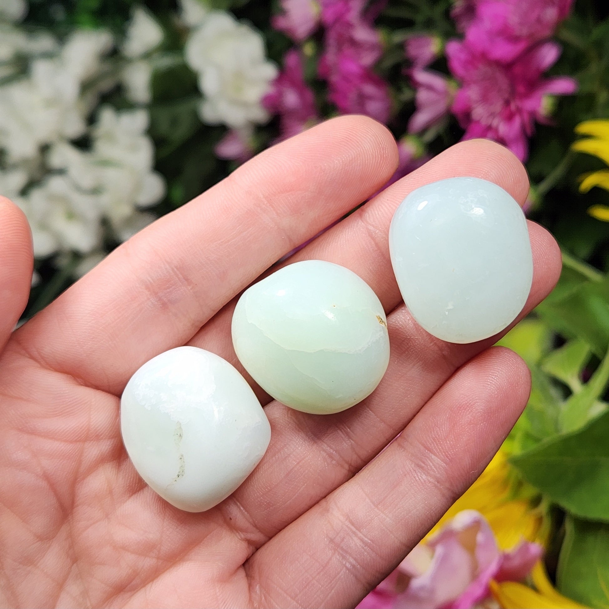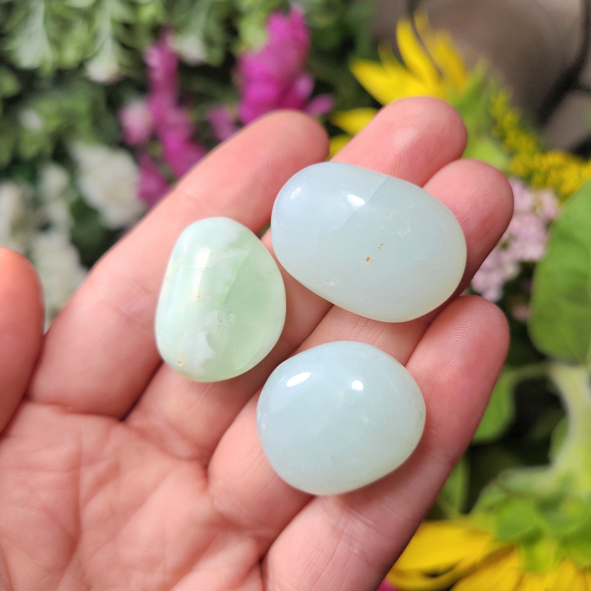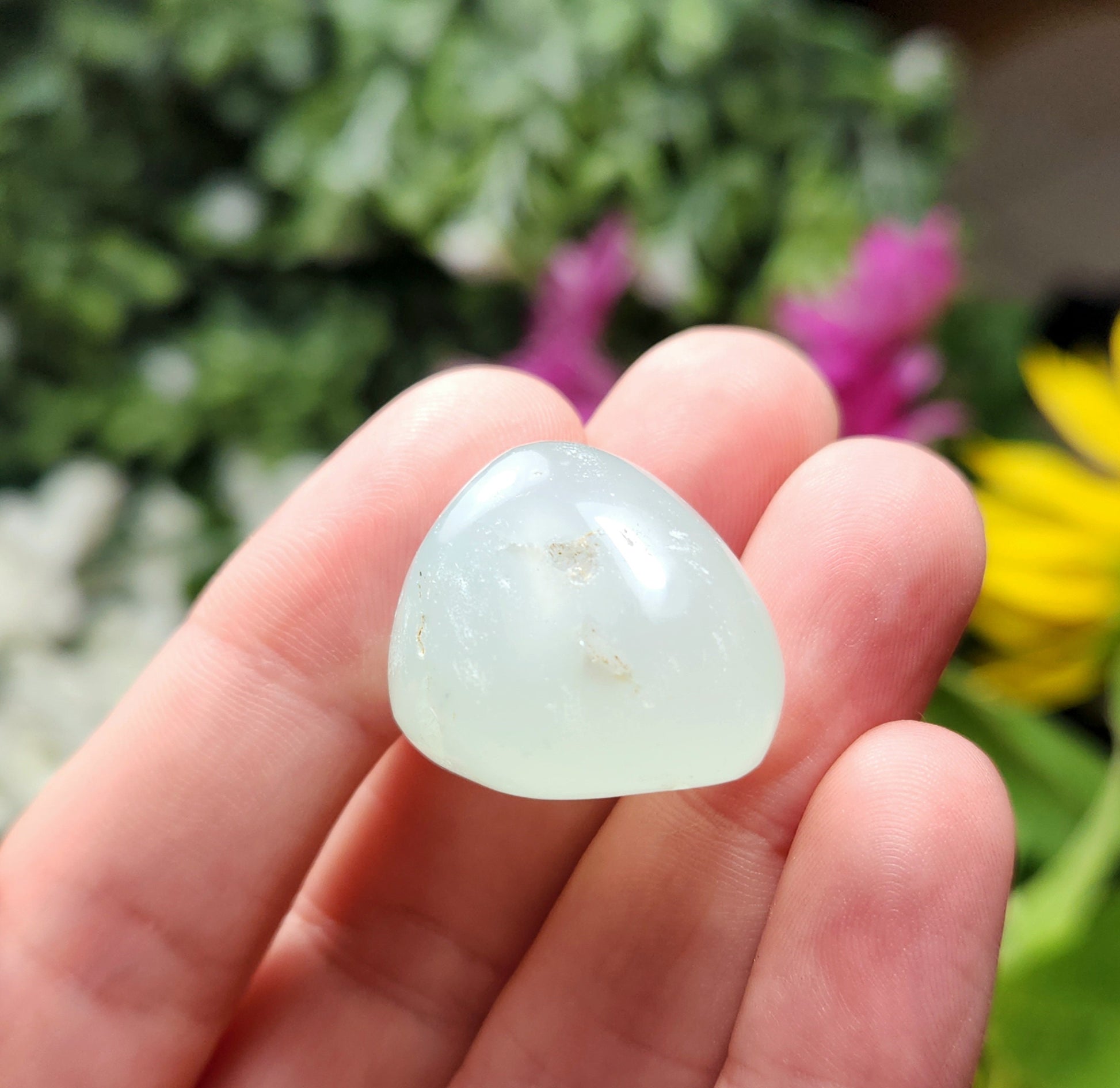 These Mint Jade stones from Indonesia have been tumbled to a smooth polish. They have rounded, freeform shapes and range from opaque to slightly translucent. Each specimen measures between .75 inches and 1 inch.