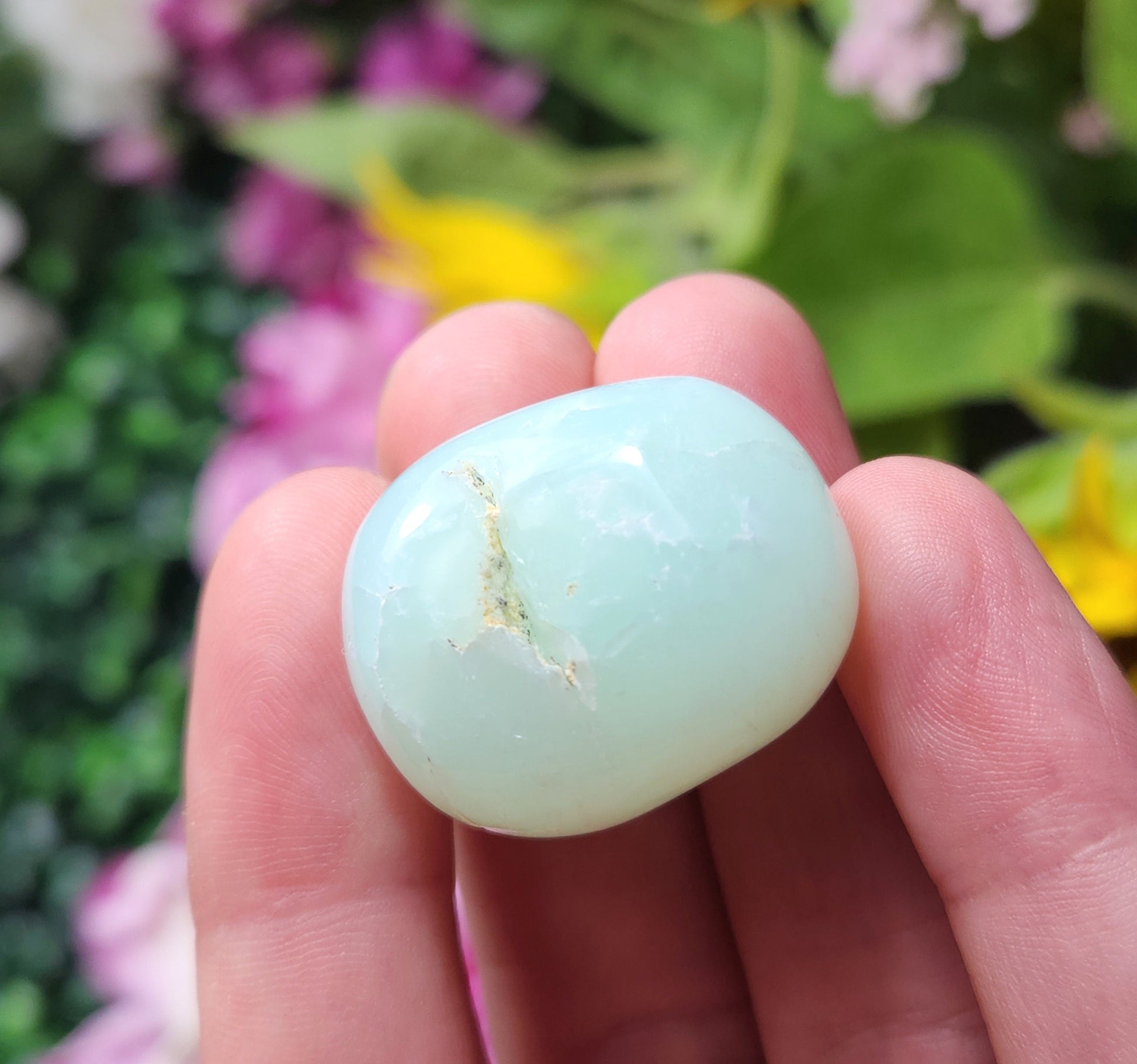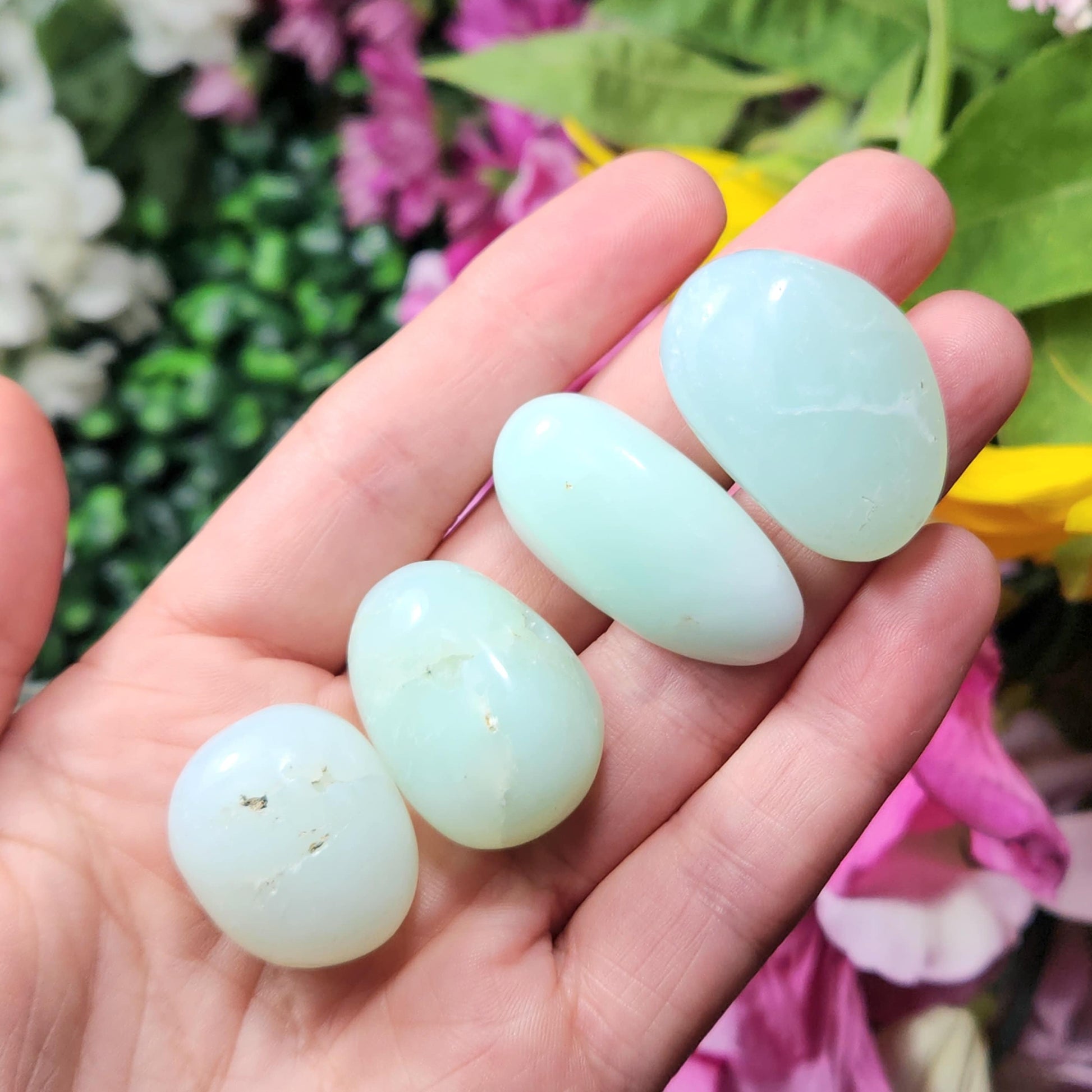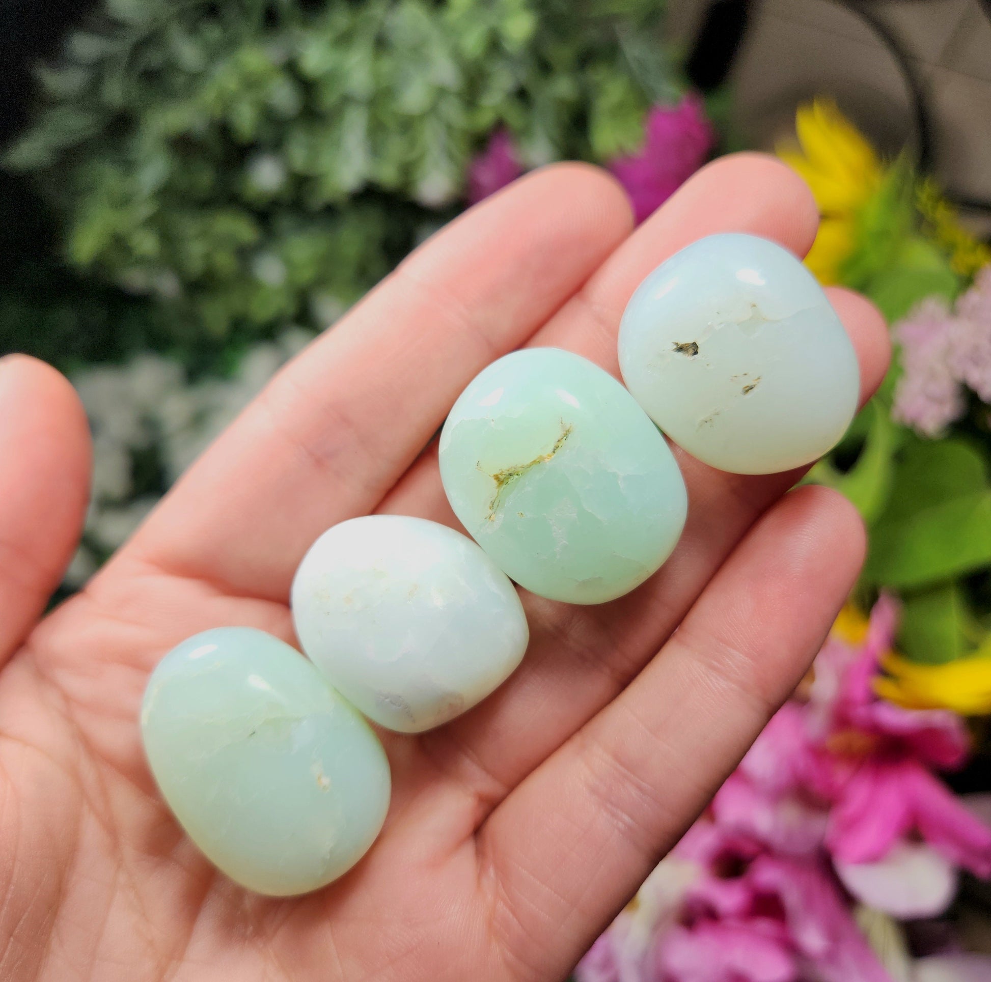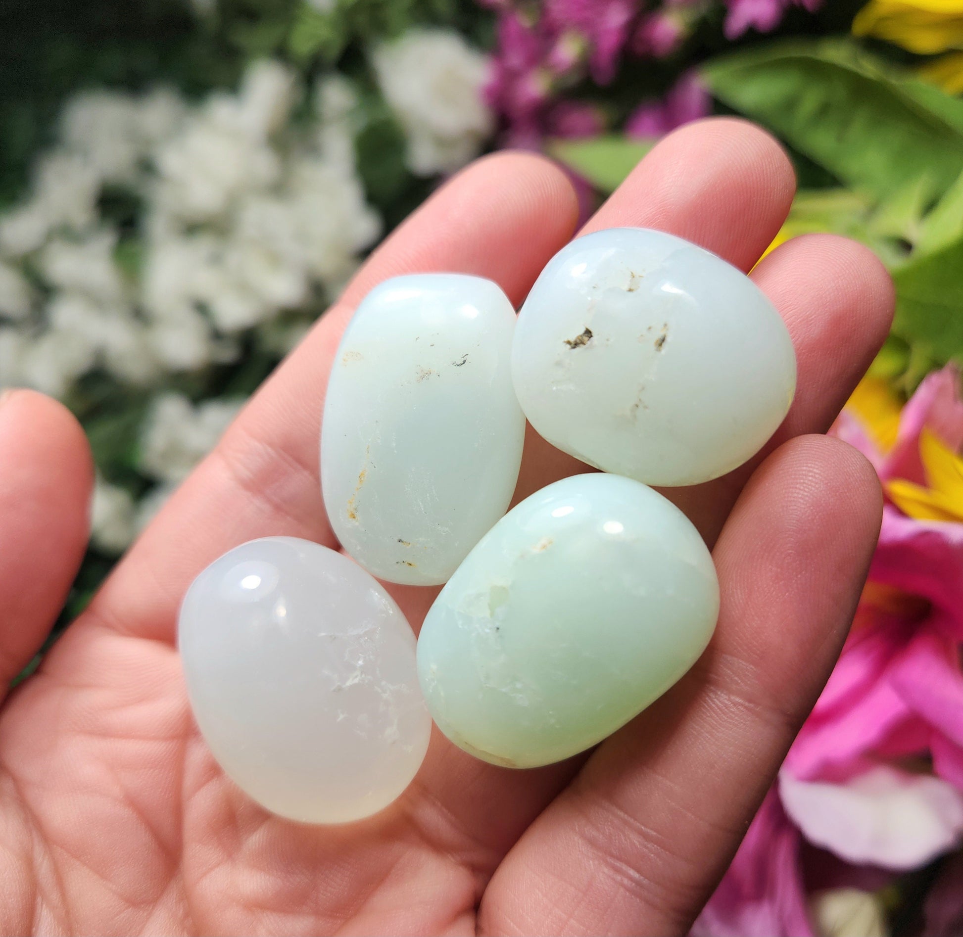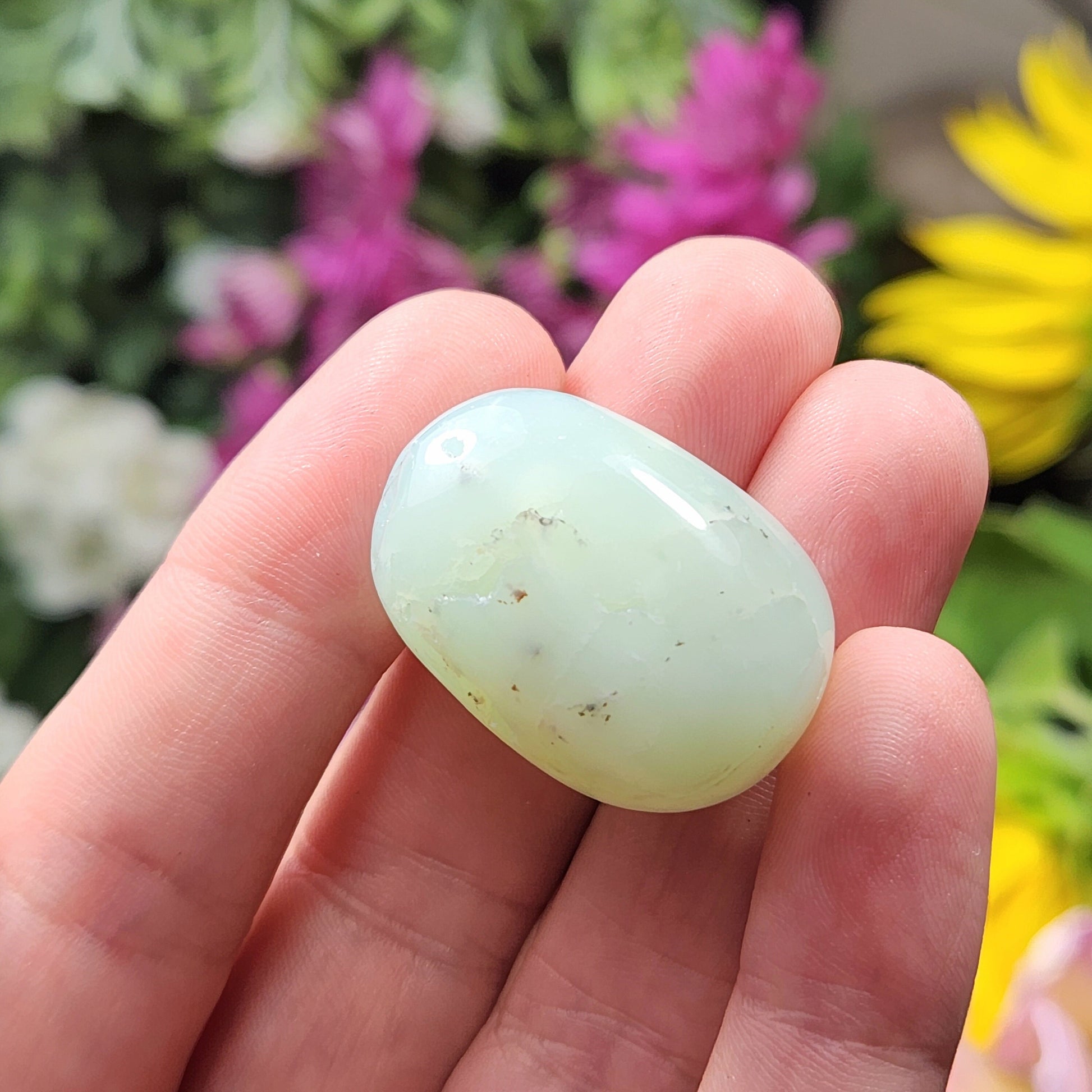 These Mint Jade stones from Indonesia have been tumbled to a smooth polish. They have rounded, freeform shapes and range from opaque to slightly translucent. Each specimen measures between .75 inches and 1 inch.