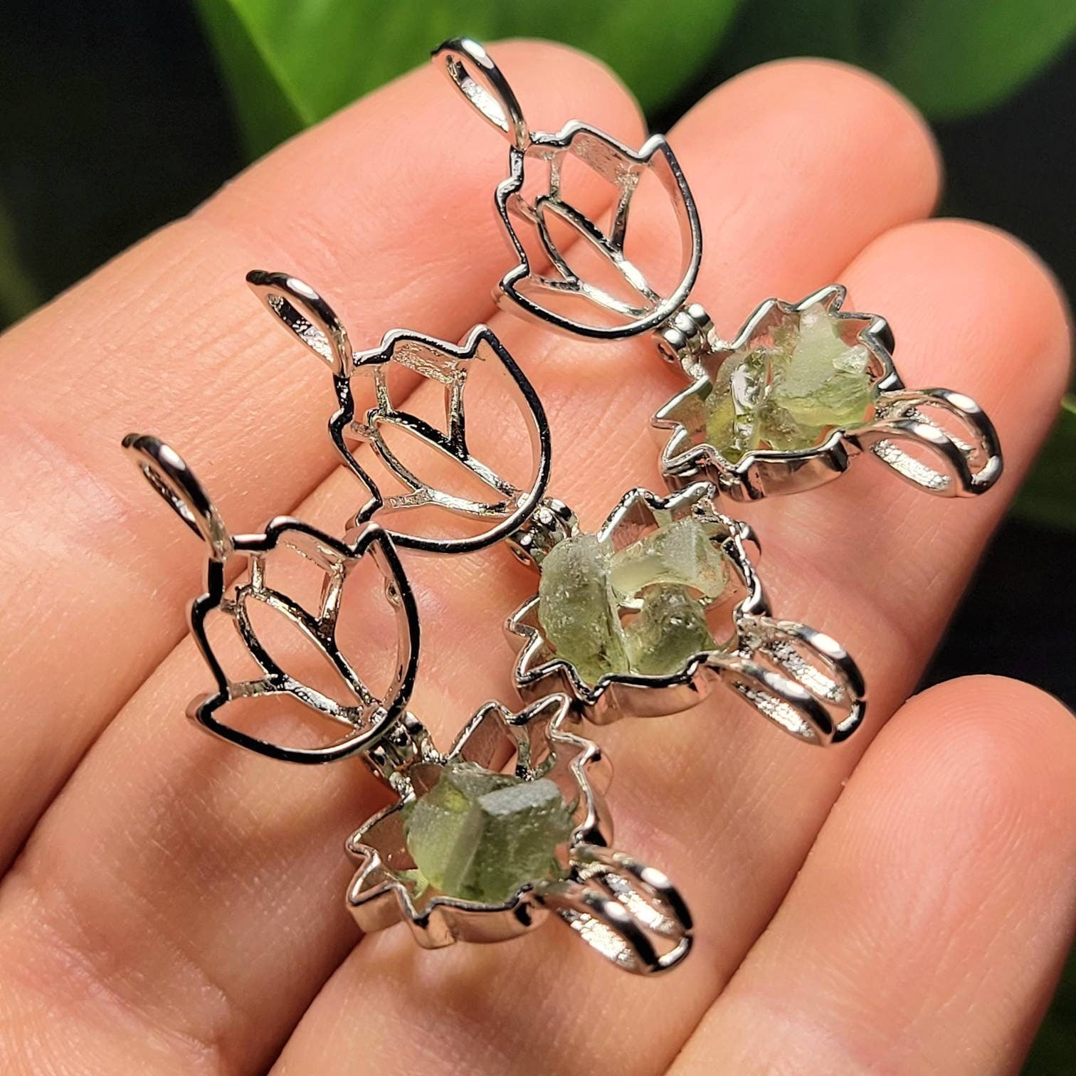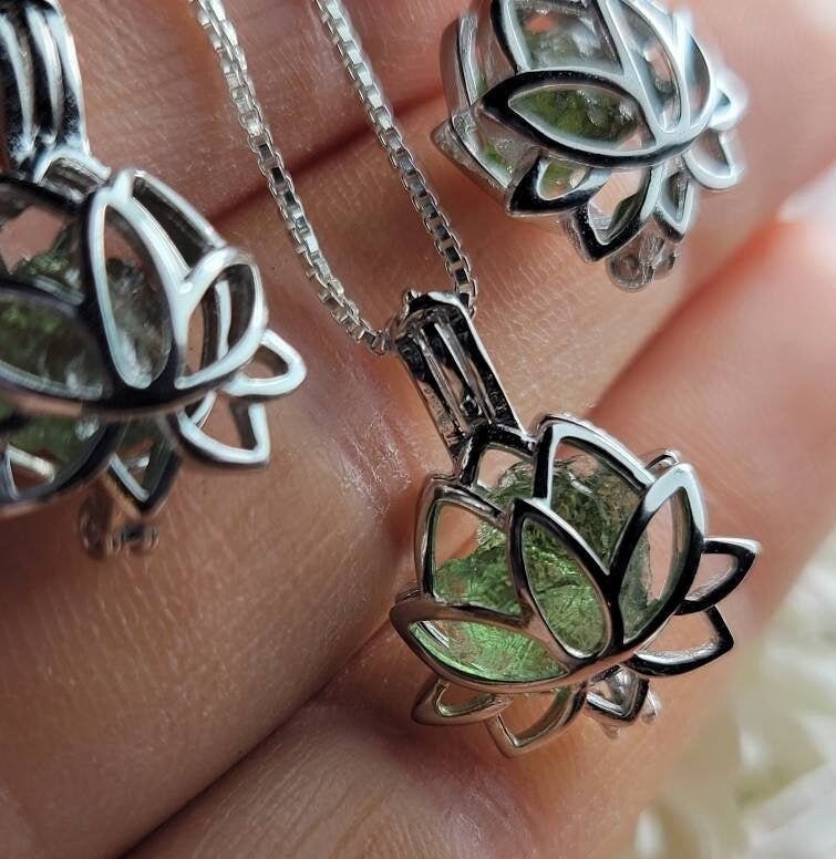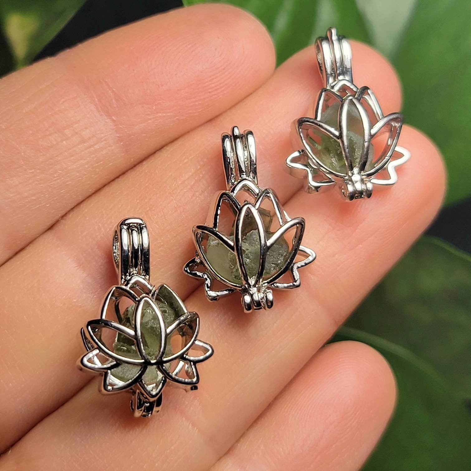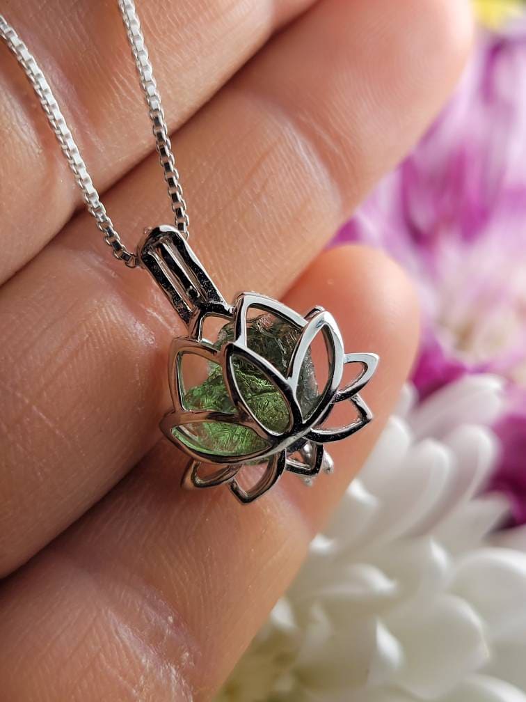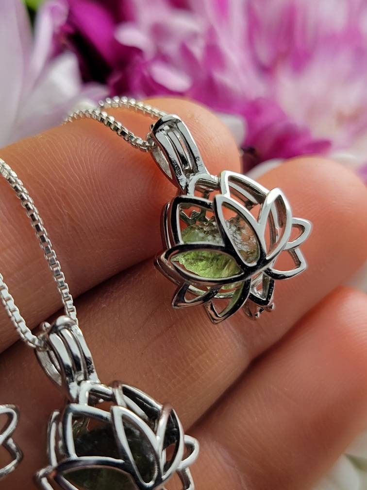 The STERLING SILVER Lotus pendant measures approximately 20mm by 15mm. These pendants hold between 1 and 3 small Moldavite chips.