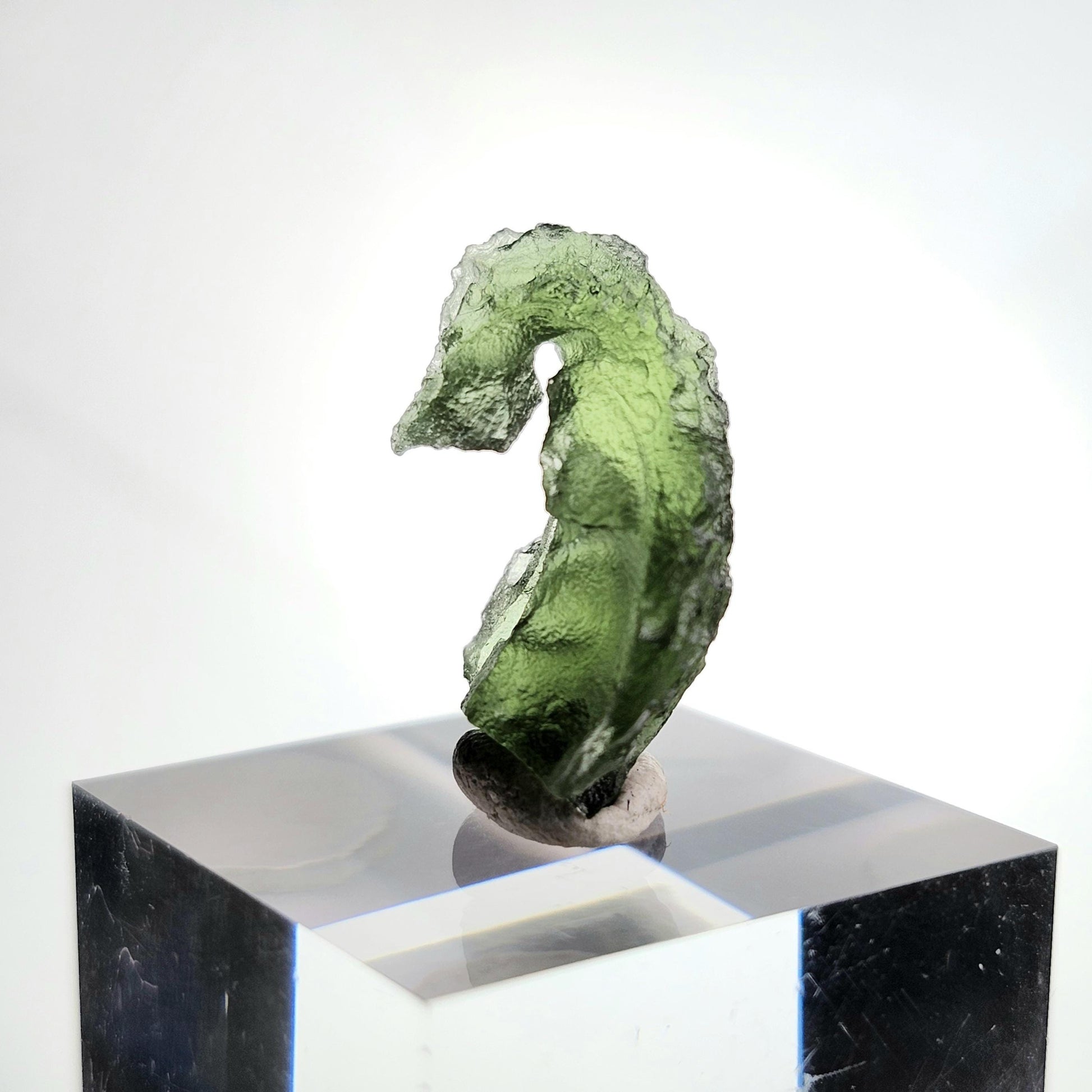 This authentic Moldavite tektite exhibits classic pitting with a brilliant green translucence that is revealed when it is backlit. This specimen measures 20mm by 10mm and weighs 1.6 grams.